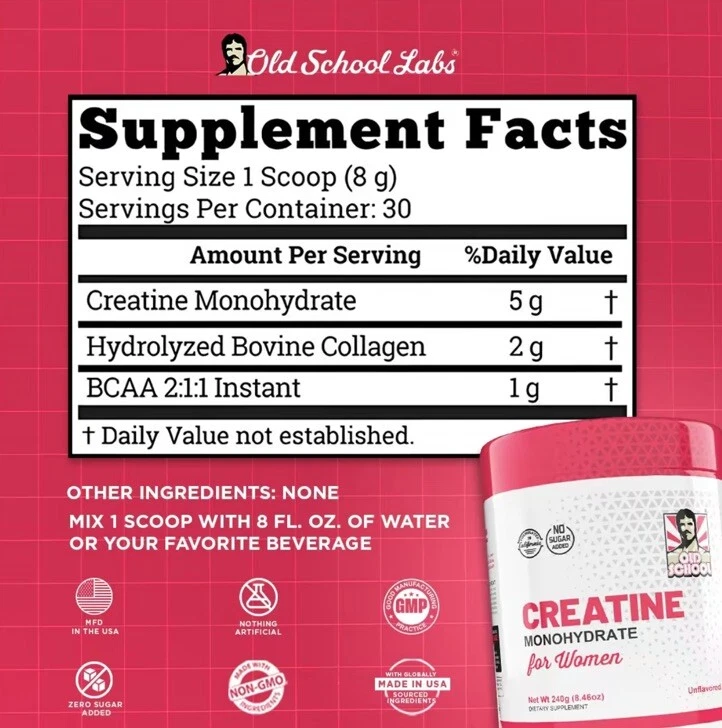gtin13:Does Not ApplyModel:Does not applyDosage:1 ScoopExpiration Date:LongFormulation:PowderMain Purpose:Muscle Gain, Cognitive Function, Reduced Bloating, Hair and NailWeight:0.66 PoundsISBN:Does Not ApplySupply:Up to 1 MonthFlavor:UnflavoredActive Ingredients:Creatine MonohydrateMPN:Does not applyNumber of Pills:Does Not ApplyCountry/Region of Manufacture:UnknownType:Does not applySize:30 Servings (Pack of 1)Brand:Old School LabsFeatures:Alcohol FreePackage Dimensions LxWxH:4.49x3.66x3.5 InchesIngredients:Creatine MonohydrateUPC:Does not applyDepartment:WomenEAN:Does Not Apply
