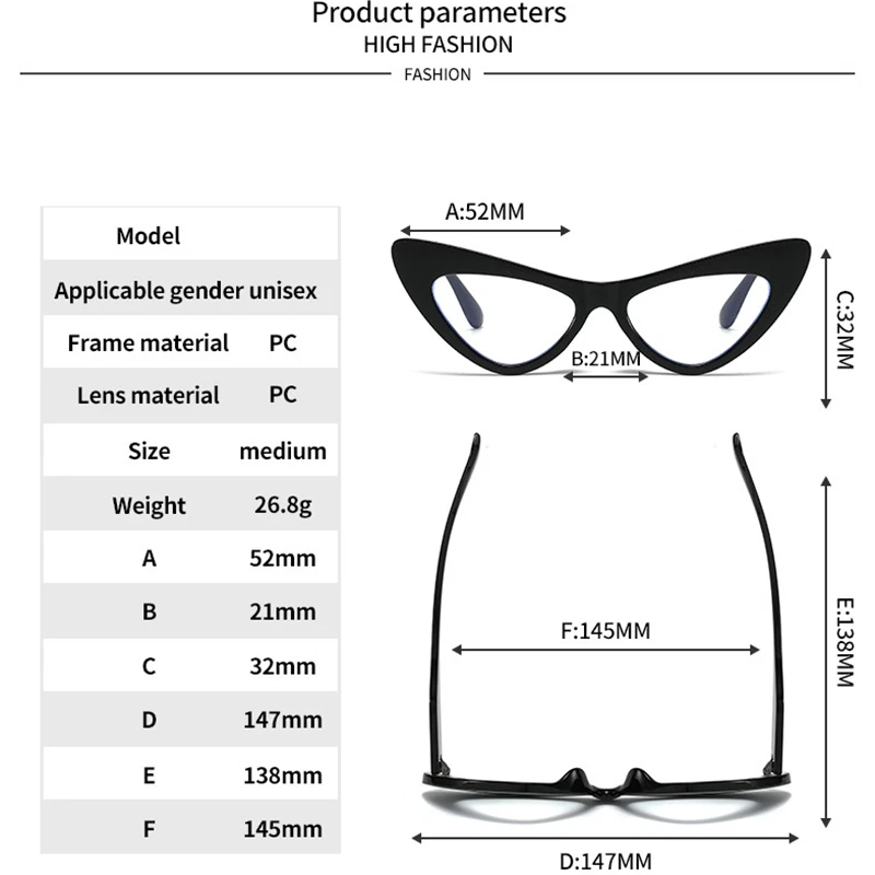 Women Anti Blue Light Reading Glasses Retro Cat Eye Frame Clear Lens Glasses Welcome to my store! Description Condition: New without Tags Frame Material : Plastic Lens material:Resin Gender :Women Lens width: 52 mm Lens height: 32 mm Bridge: 21 mm Frame Width:147 mm Temple Length :138 mm Package included: 1* Reading Glasses (Not contain boxes and other accessories) Note: 1. Due to the different monitor and light effect, the actual color of the item might be slightly different from the color showed on the pictures. Thank you! 2. Please allow 1-3mm measuring deviation due to manual measurement. Brand FELRES MPN Does Not Apply Model 066 Lens Material Polycarbonate Country/Region of Manufacture China Frame Material Plastic Type Reading Glasses Department Women Style Cat Eye Features Full Frame Lens Height 32 mm Bridge Width 21 mm Lens Width 52 mm Frame Width 147 mm Temple Length 138 mm Personalized No Lens Color Transparent Lens Technology Anti-blue Light Theme Classic, Designer, Outdoor, Retro UV Protection 4 Year Manufactured 2020-2029