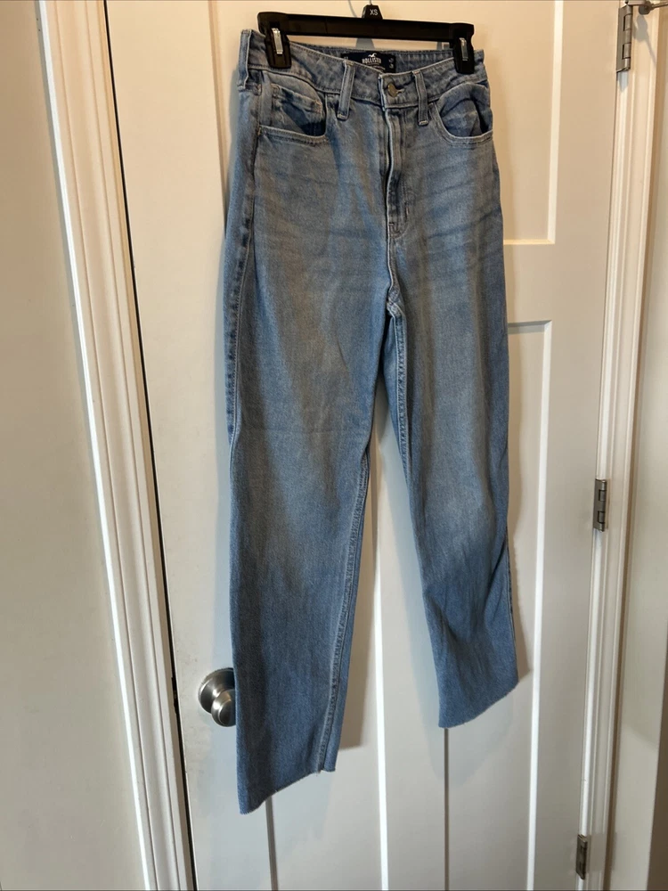 Elevate your denim game with these ultra-high rise vintage straight jeans from Hollister. The timeless blue color and solid pattern make them a versatile addition to any wardrobe. The fabric wash is medium, and the fabric type is denim, which gives them a classic feel and a durable edge. These jeans feature a zip and button closure, with a low rise of 6.5-8.5 inches and a waist size of 27 inches. The cotton blend material ensures comfort, while the accents of a zipper add a touch of style. These jeans are perfect for any casual occasion, and their regular fit and size type make them suitable for women of all shapes and sizes.