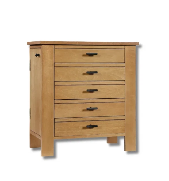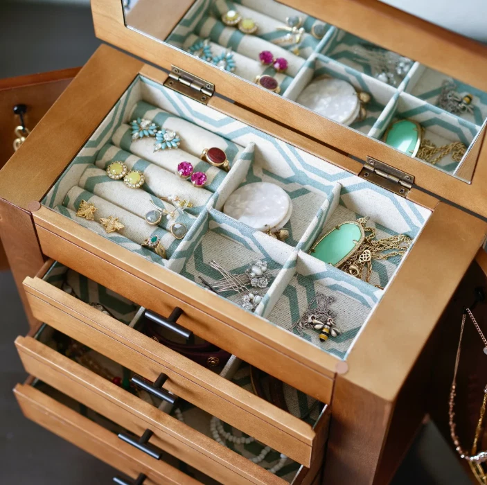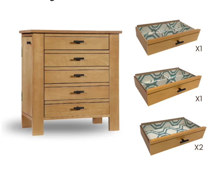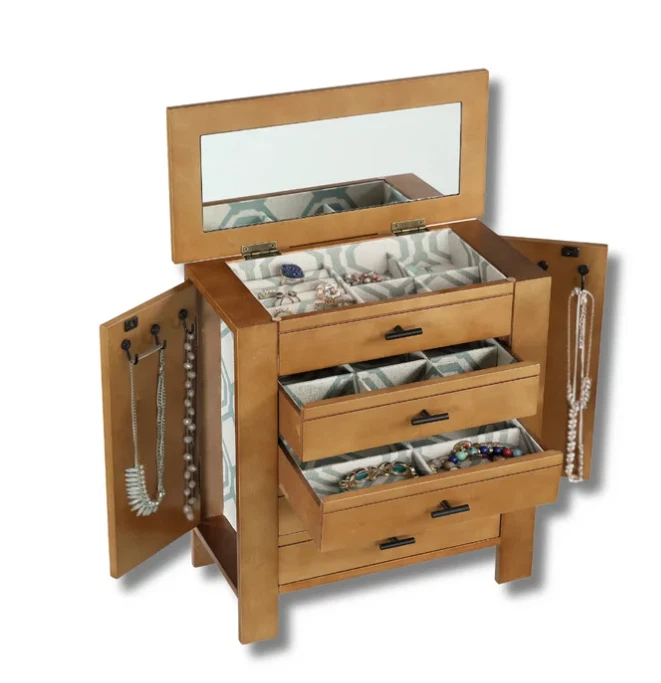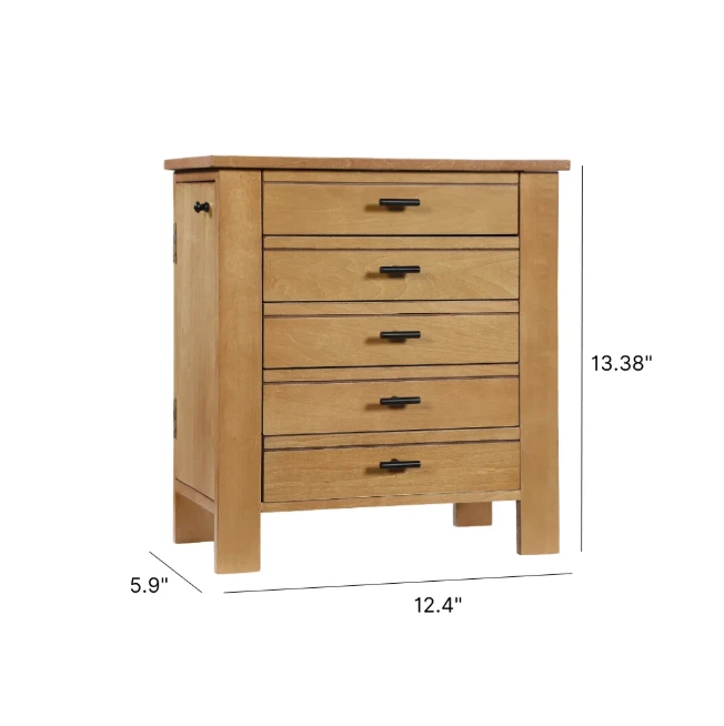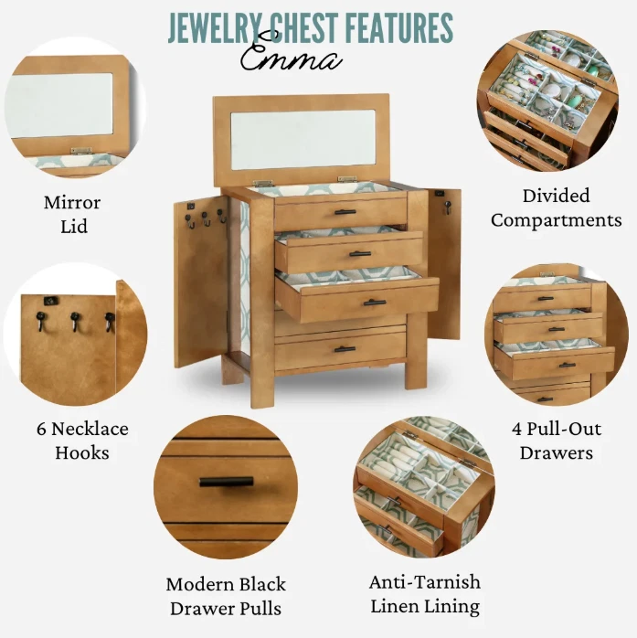Channeling the aged and evocative style of well-loved antiques, the Hives & Honey Emma Jewelry Chest has all the organization of the modern-day. The top compartment has multiple ring rolls, divided compartments, and plenty of space to store your precious jewels. Pull the drawers open with the sweet clover knobs to reveal the additional divided compartments for storing everything from bracelets and earrings to note cards and keepsakes. The doors on each side contain several necklace hooks, so you can hang your strands safely, securely, and in style. The entire inside is lined in a beautiful natural linen featuring a mosaic pattern. This chest is a must-have for any jewelry collector. Hives and Honey Emma Wood Jewelry Chest for Women Six Necklace Hooks in the side doors Ring Rolls and Divided Compartments Lined with anti-tarnish linen Four pull out drawers Vanity Mirror Product Dimensions 13" H x 12.5" L x 6" W Hives and Honey Emma Wood Jewelry Chest for Women On Jan 10, 2025 at 22:38:35 PST, seller added the following information: