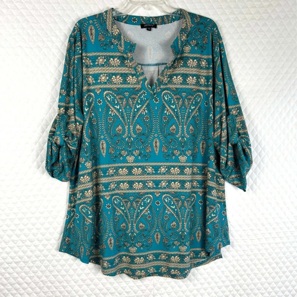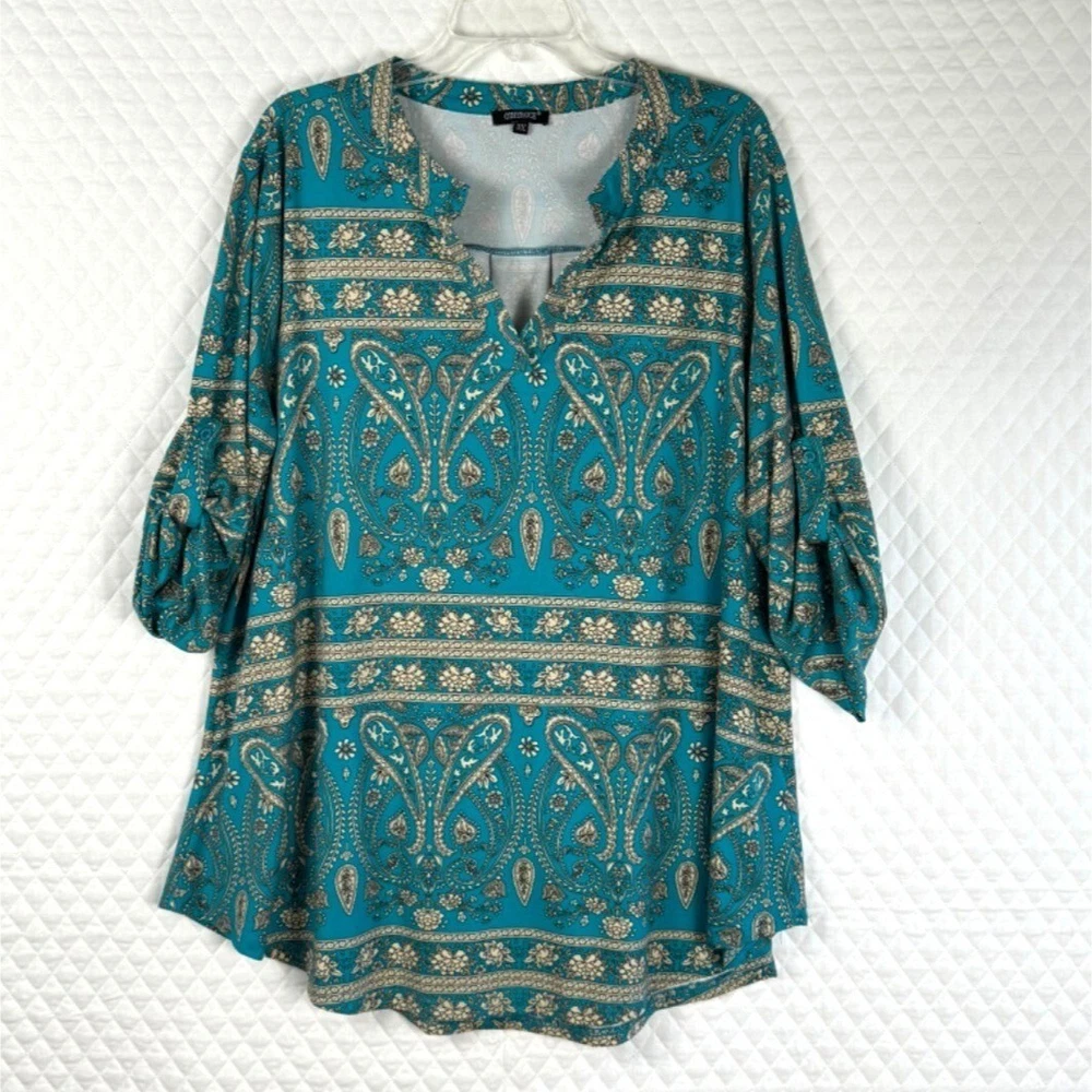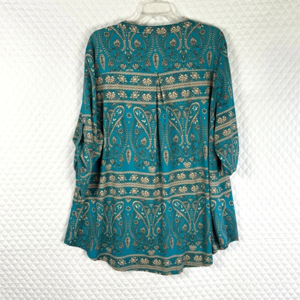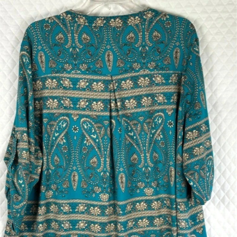 Ideal for a relaxed yet stylish look, this tunic top features a beautiful paisley print. The loose fit and lightweight material ensure comfort throughout the day. • Bohemian paisley print • 3/4-length sleeves • Keyhole neckline • Pull-on closure • Relaxed fit • Lightweight polyester • Machine washable Width = 25" (arm pit to arm pit) Lenght = 30" Sleeve - 17" (roll sleeve) Romantic, lagenlook, feminine, career, office, cottage core, paisley, art to wear, comfort, flowing