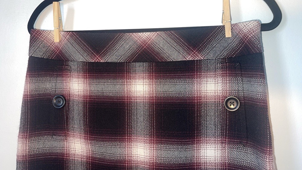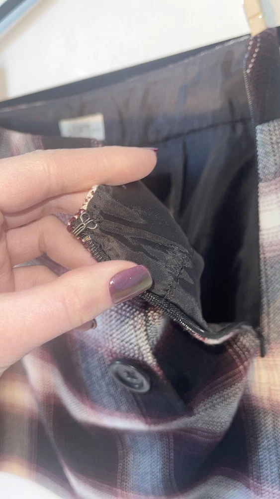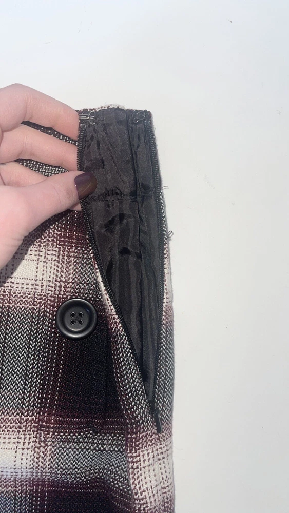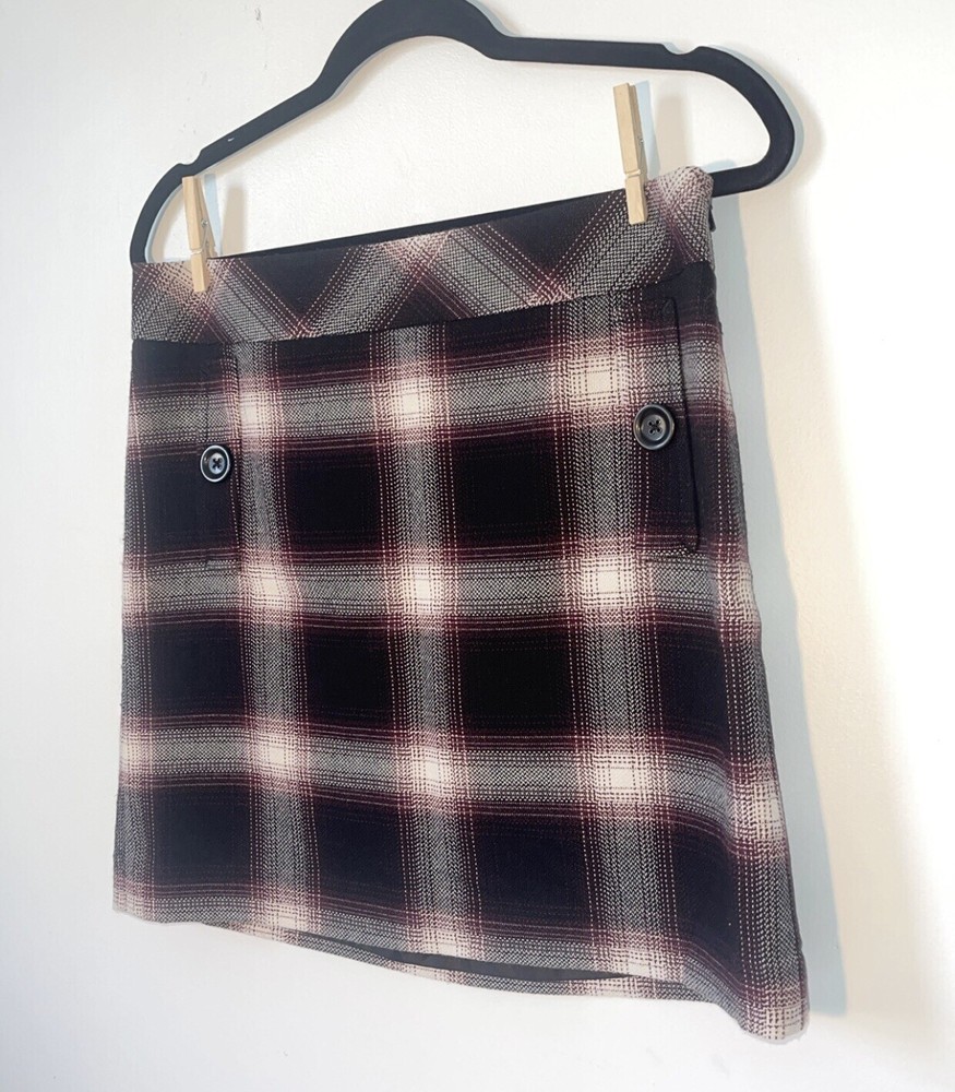 Womens Ann Taylor Loft skirt size 6P Petite A short straight skirt with the slightest flare A solid black and white plaid pattern with a dark maroon purple teased throughout A side zip closure, with a clasp at the waistline No material tag in the skirt, a nice lightweight material with a smooth black lining on the inside Decorative pocket with button on either side on the front, just accents as they do not function A preowned item in good condition shows slight wear but no noticeable flaws Comes cleanly, packaged well, free of pet hair and smoke smell