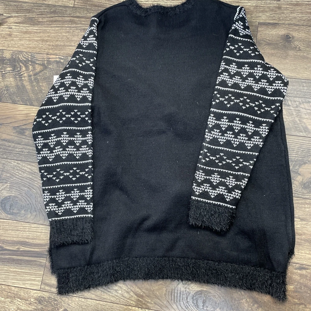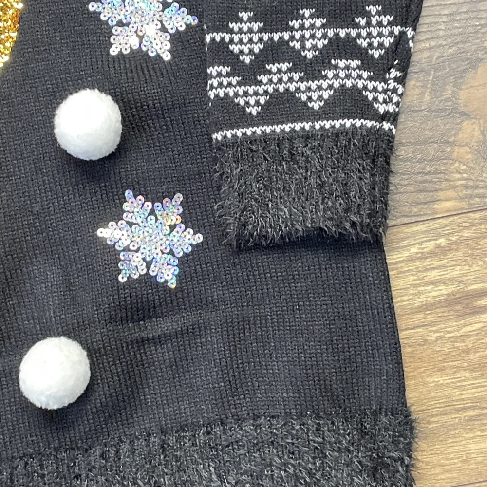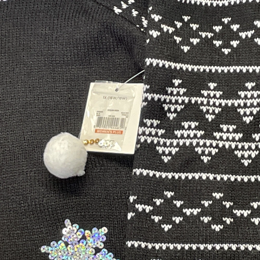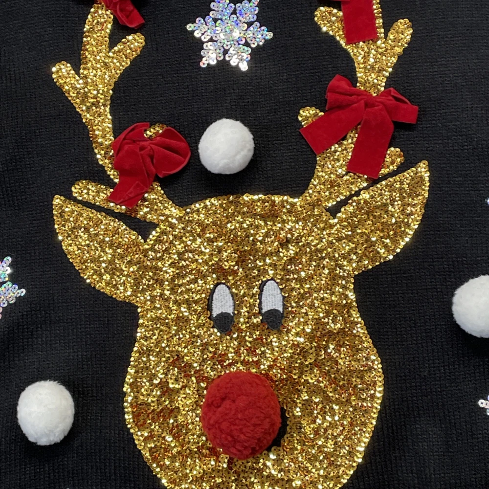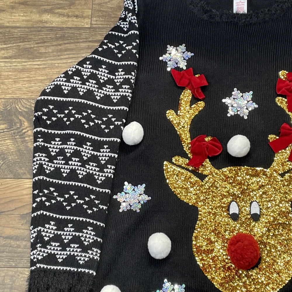 Womens Black & Gold Red Nose Reindeer Sequin Holiday Christmas Sweater 1X Item listed Mew with Tags Measurements are as follows Chest 24” Length 29” Long sleeve Will ship USPS within 24 hours safely and efficiently