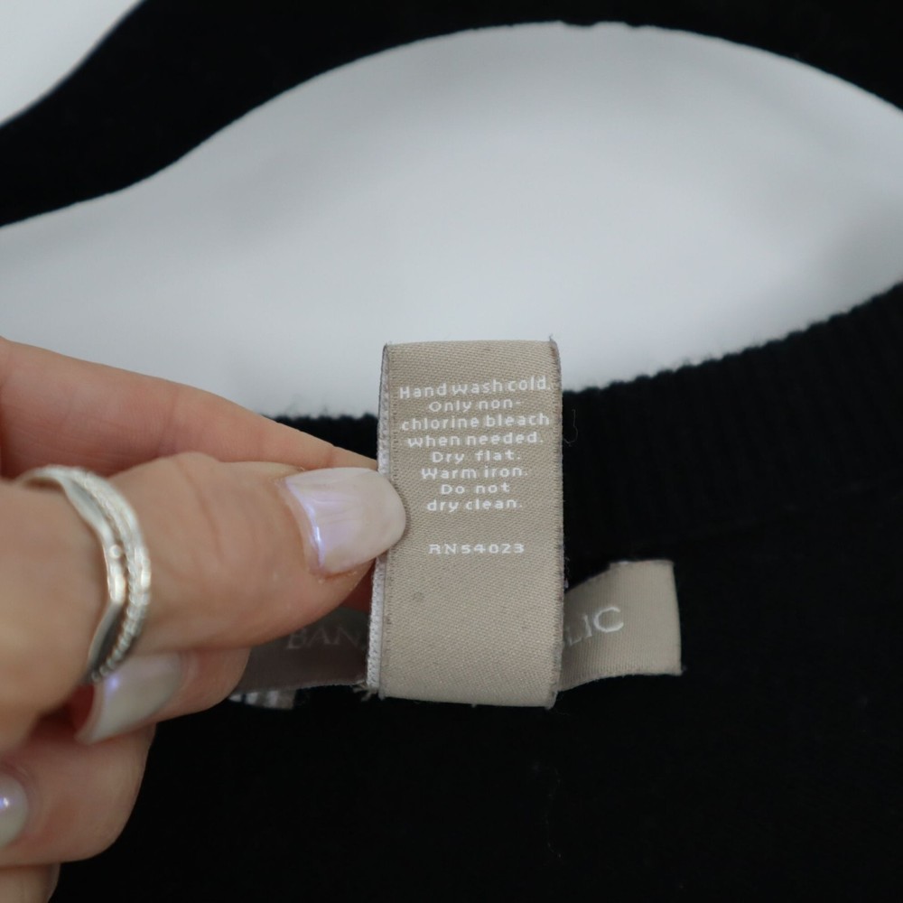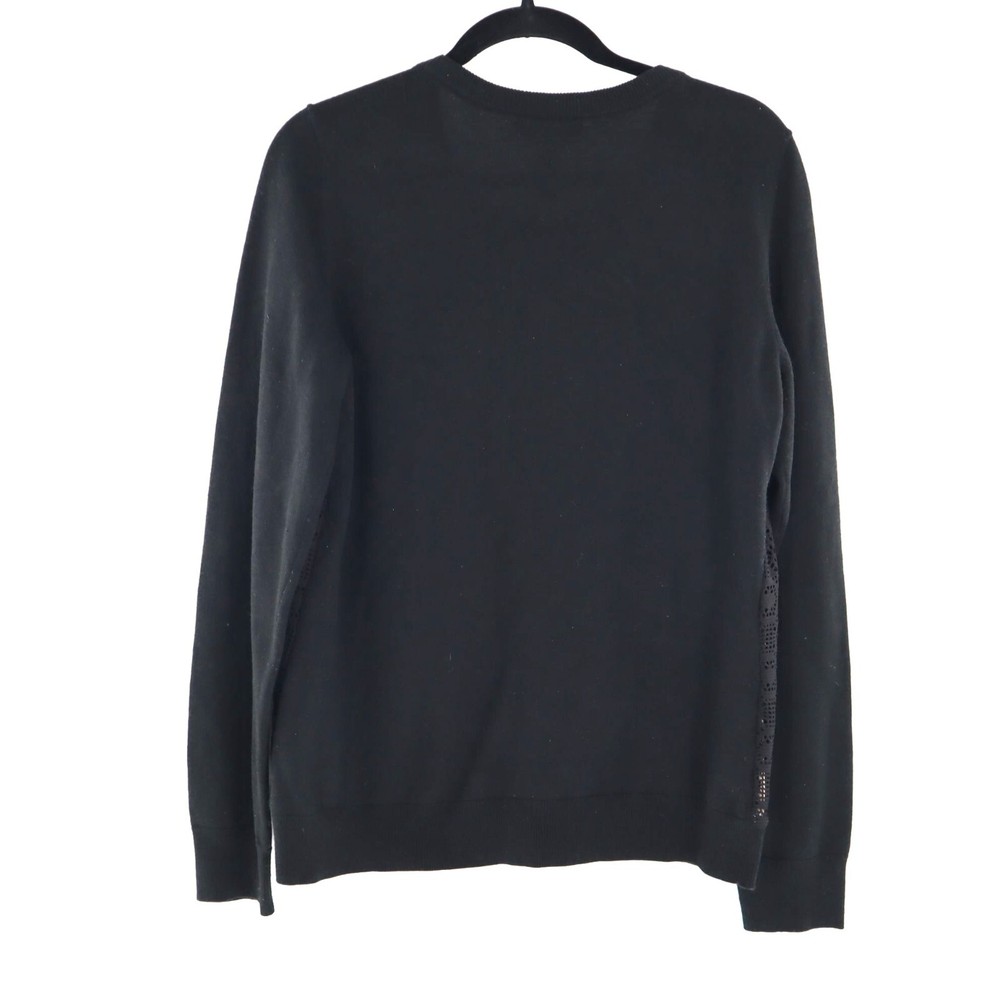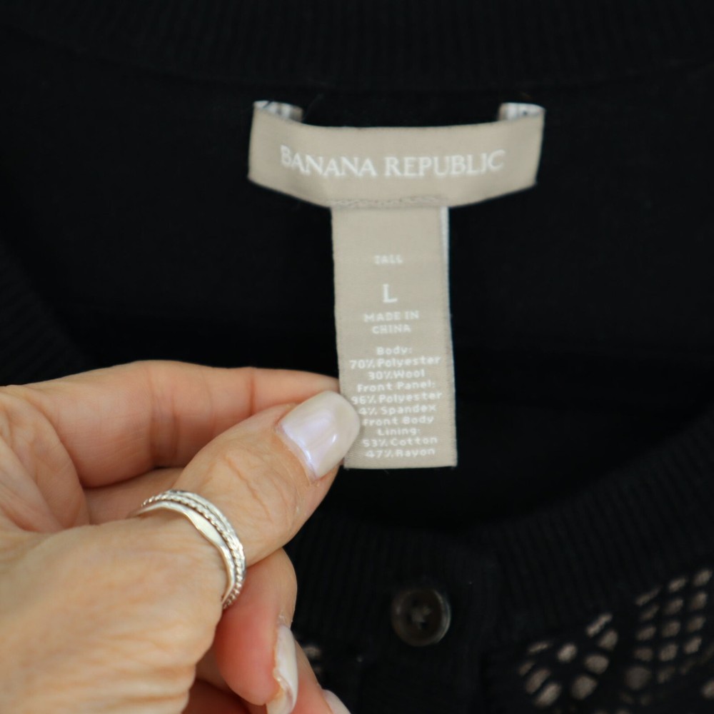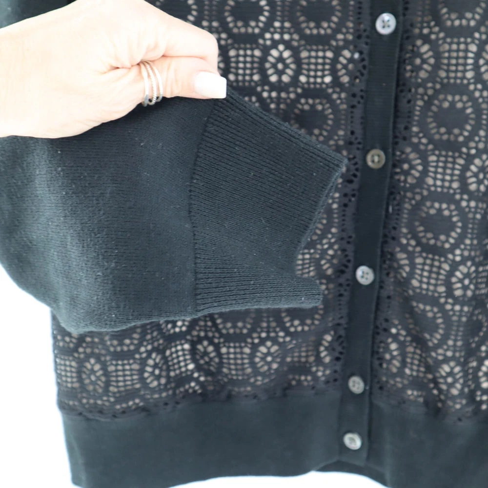 Banana Republic Wool Knit Cardigan Women's L Black Granny Boho Goth Dark Cottage This cardigan is so chic it could make a scarecrow look stylish! The lace detail says "granny," but in a "cool grandma who rides a Harley" way. • Button-Front Closure • Intricate Crochet Lace Detail • Long Sleeves • Ribbed Cuffs & Hem • Wool Blend Fabric Features: • granny, goth, bohemian, wool, dark cottage, crochet Size: Womens L Condition: Pre-Owned Good Shows light wash wear/pilling but no major flaws.