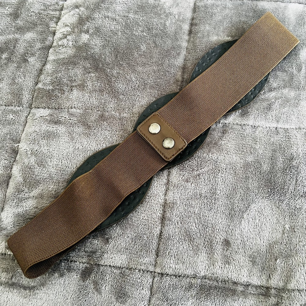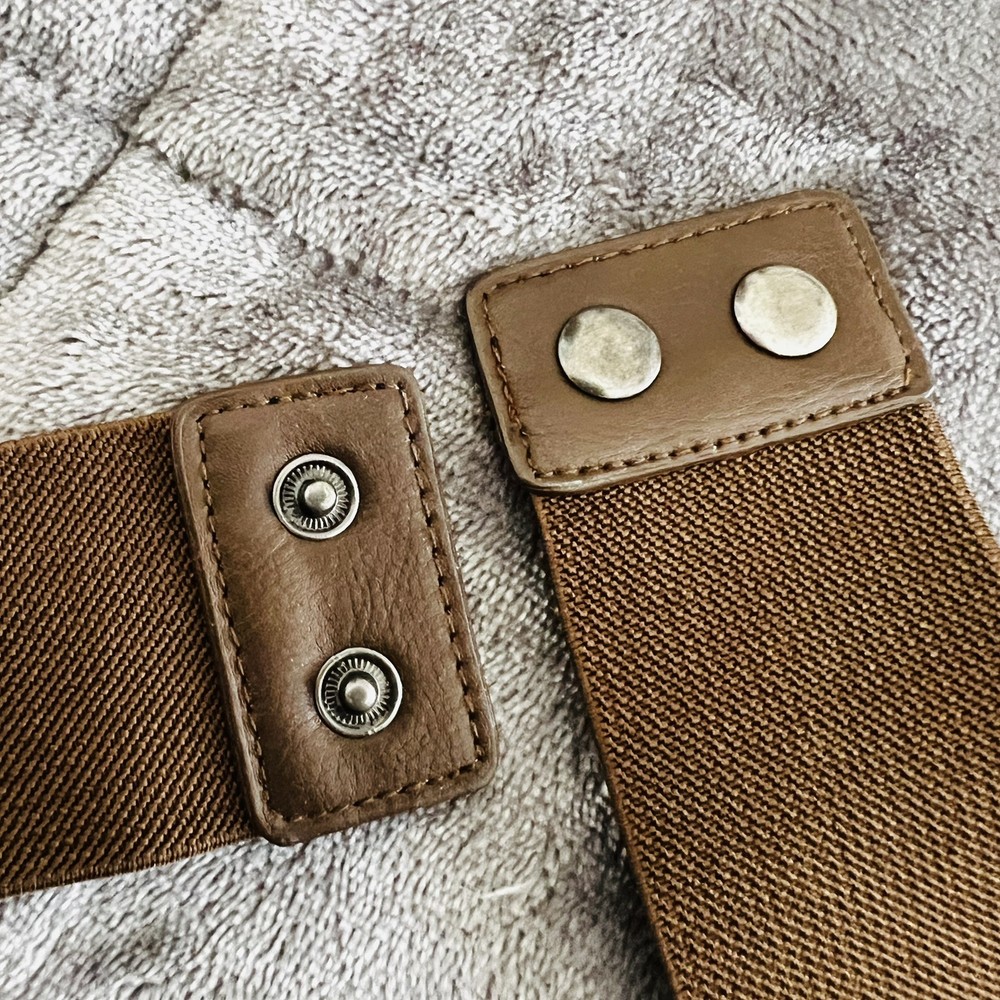 This women's belt is made of brown vegan faux leather and features a studded wide braided elastic design. It is suitable for waist sizes up to 32 inches. The belt has a stretch feature for added comfort and has a snap closure at the back. There is one stud missing. See photo(s) for measurements. Color in photos may not be an accurate respresentation of actual color due to lighting. ABOUT ME: • I accept reasonable offers • Next business day shipping • New items posted daily • Smoke free home