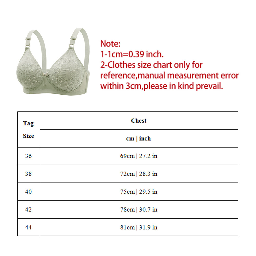 Features: 1. Lightweight Cup Design: The underwear adopts a lightweight cup design, which is soft and breathable, without chest tightness. When designing, comfort and breathability are taken into consideration to avoid discomfort or overheating, while maintaining a lightweight feel. 2. Soft Material: Soft to the touch, made of cotton fabric, soft and comfortable, like a cloud. 3. Enhance Support And Shaping Effect: The widened wings of the bra effectively tighten the breasts, while the surface of the 3D printed cup presents tangible and rounded lines, providing not only support but also shaping effect. These characteristics make the chest lines more beautiful. 4. Convenient Buckle Design: The underwear is equipped with opening and closing buckle, making it easy to put on and take off. This design increases the flexibility of wearing, especially suitable for elderly women, and is more convenient to operate. 5. Thoughtful Shoulder Design: The U-shaped backrest and non adjustable wide shoulder straps reduce shoulder pressure, and the double shoulder straps evenly share weight, improving wearing comfort and reducing shoulder tightness. Without Steel Ring Material:Polyester,Nylon Color: See as the picture Size:36/80BC,38/85BC,40/90BC,42/95BC,44/100BC What's in the package: 1 x Bra Notes: 1. Due to various factors (such as the brightness of the display and the brightness of the lights), the actual color of the item may be slightly different from the picture displayed on the website. 2. In manual measurement, please allow a slight deviation of the data.