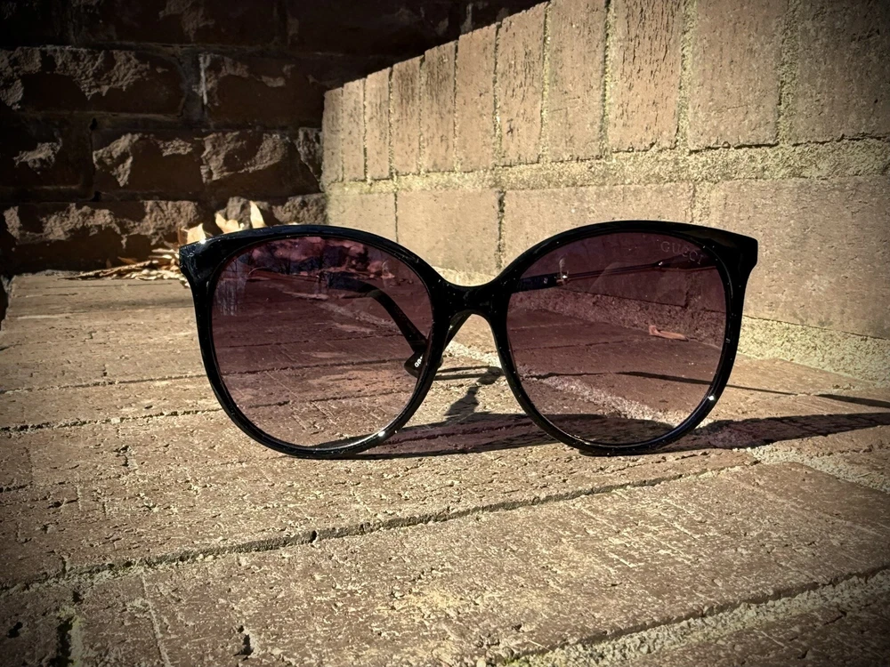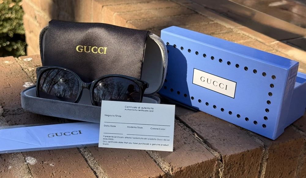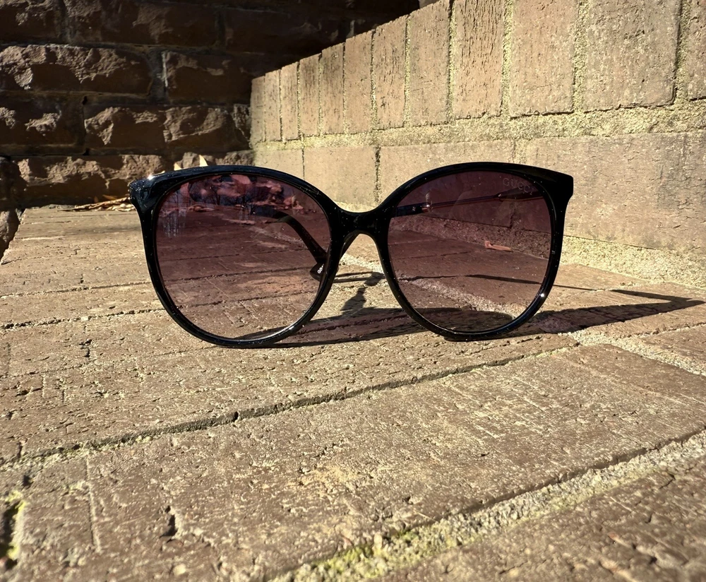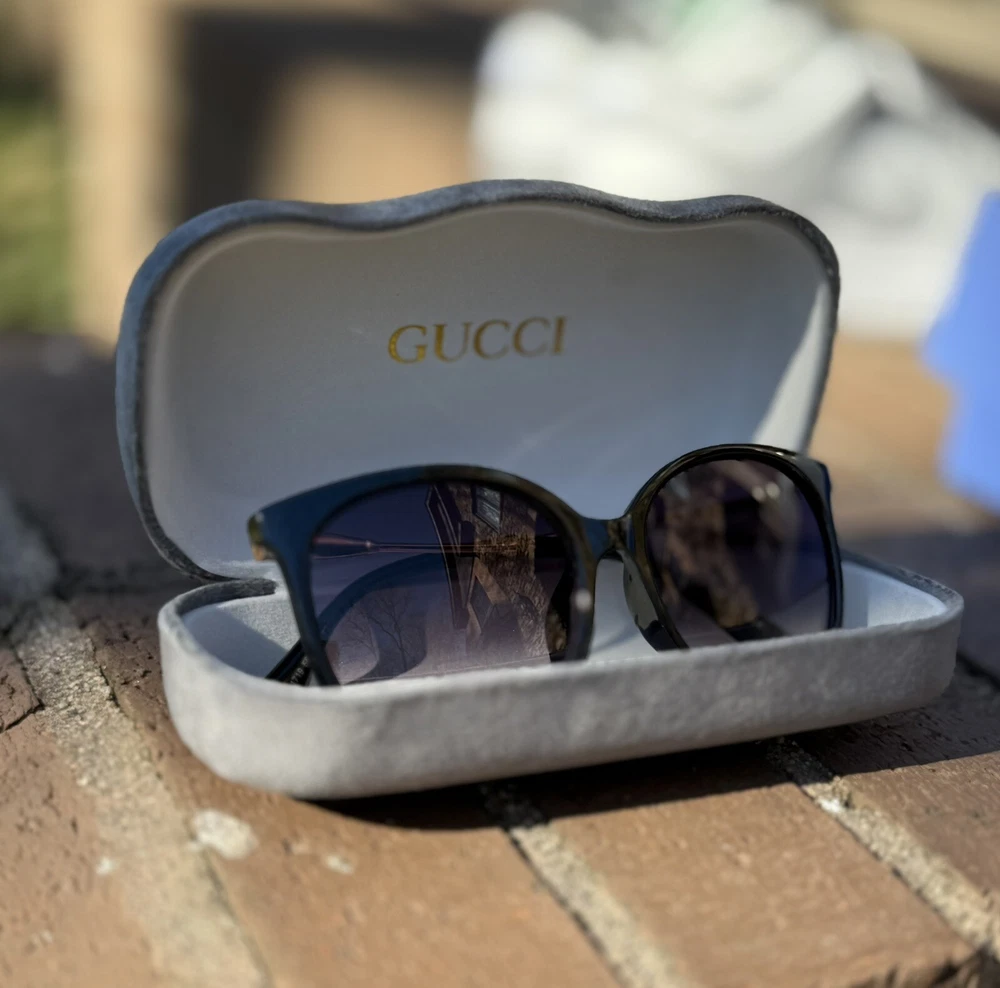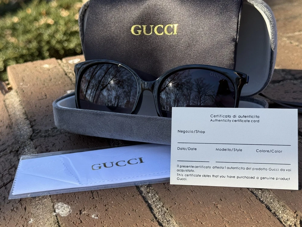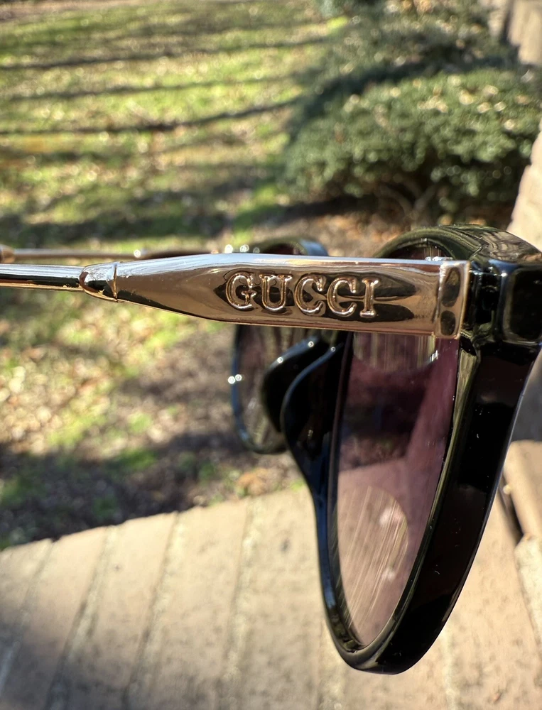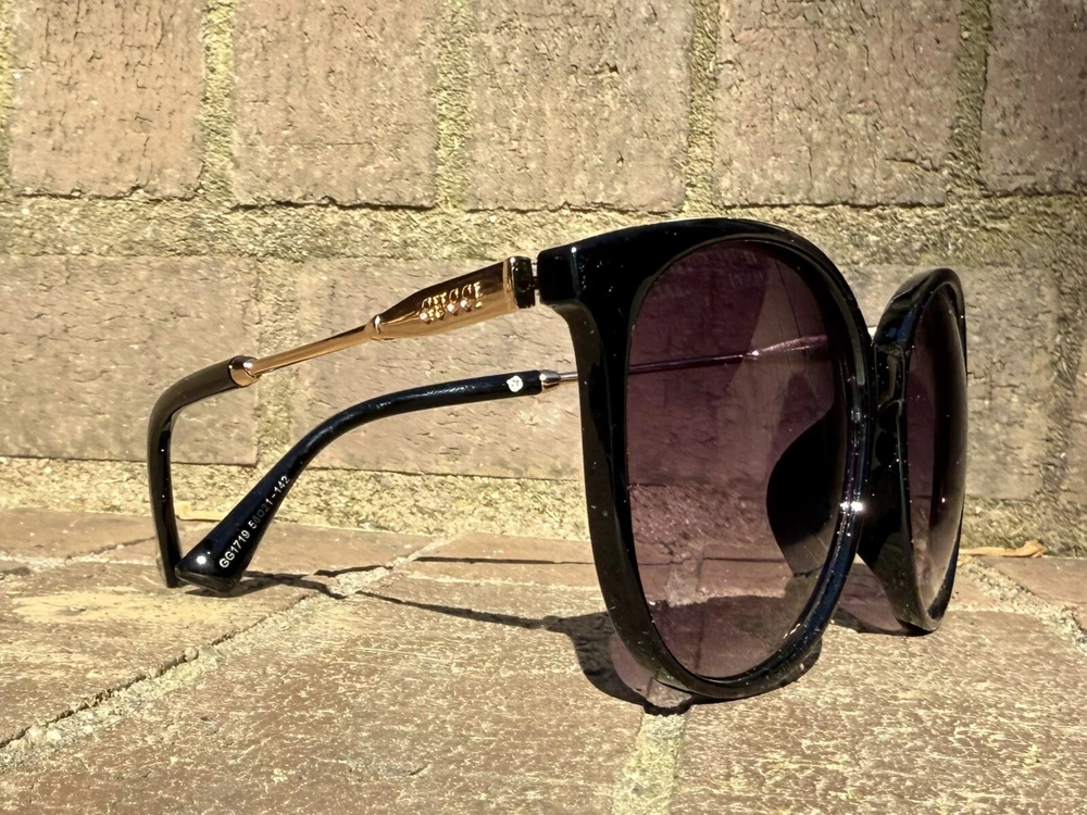 These women's Gucci sunglasses have an oversized frame in black, making a bold and stylish statement. The model number is GG1719 56 21-142, showcasing the iconic Gucci design and craftsmanship. Perfect for adding a touch of luxury to any outfit, these sunglasses are a fashionable accessory for women looking to elevate their style.