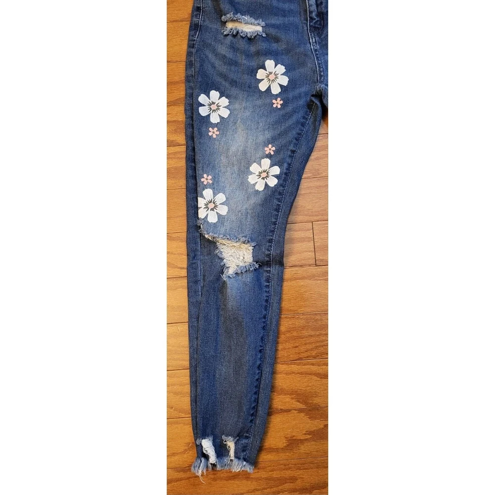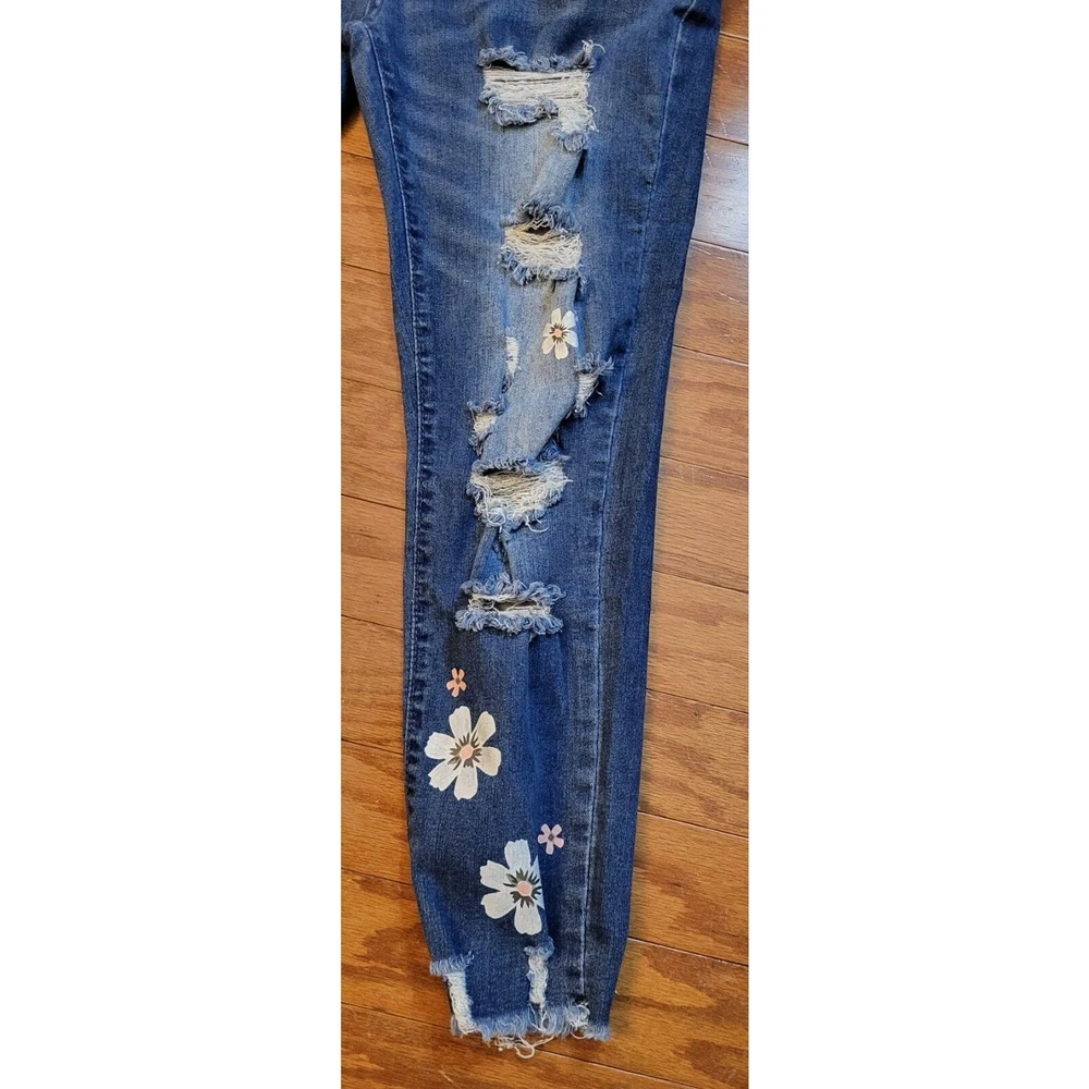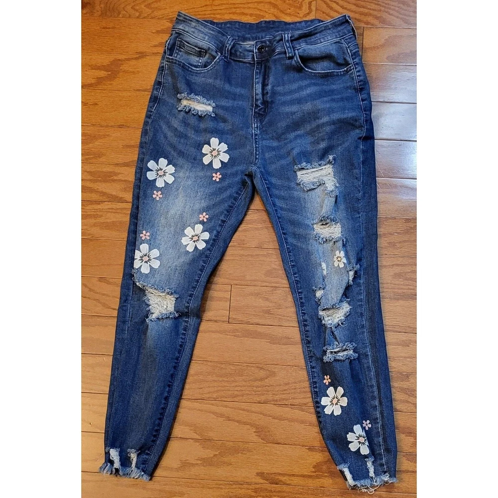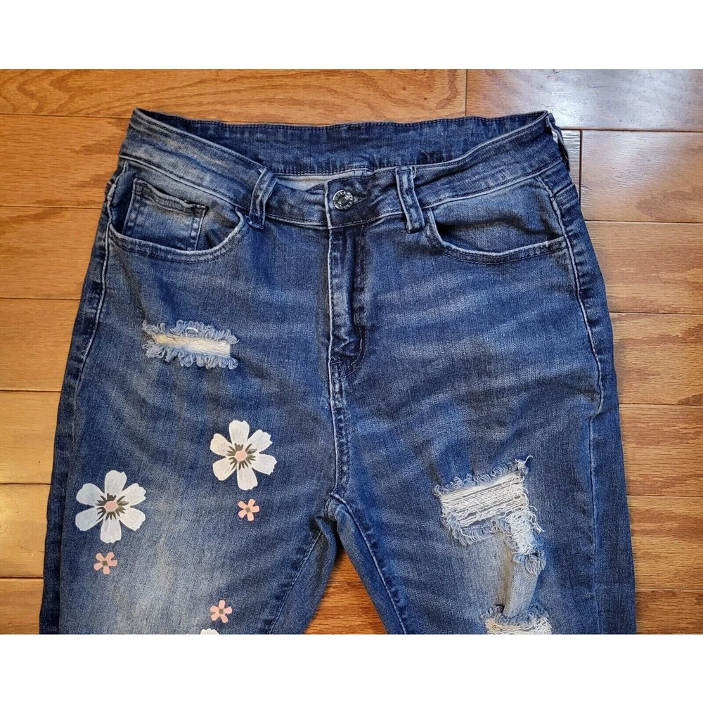 Elevate your denim game with these stylish women's cropped skinny jeans in size LG. The distressed and ripped jeans with the cute floral pattern adds a touch of edgy charm to these skinny jeans, making them perfect for casual outings or a night out on the town. The medium fabric wash complements the blue color, while the floral accents provide a feminine touch. These jeans are designed for women and feature a regular size type, skinny style, and a flattering fit. They are made of high-quality fabric and are perfect for those who want to make a statement with their clothing. These jeans are a must-have for any fashion-forward woman's wardrobe. Waist measures 28 in Rise 10 in Inseam 26.5 in Good pre-owned condition. Jeans are made in China and unbranded. The button closures just has the words Jeans. Add these cute cropped jeans to your wardrobe today!