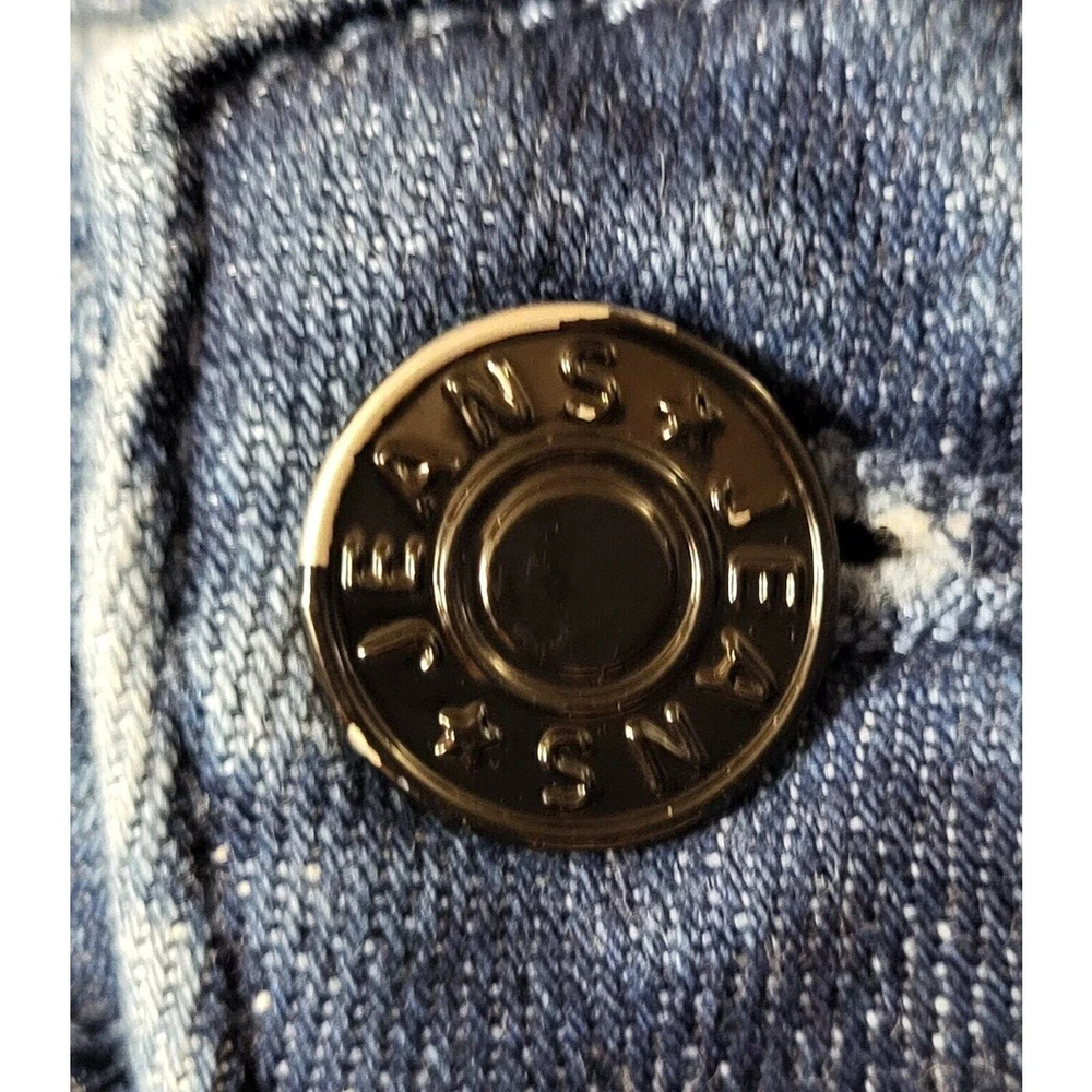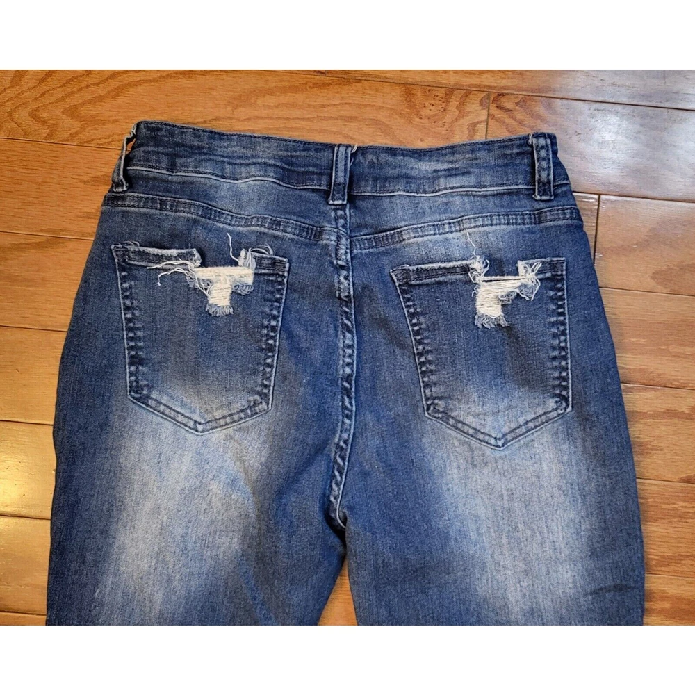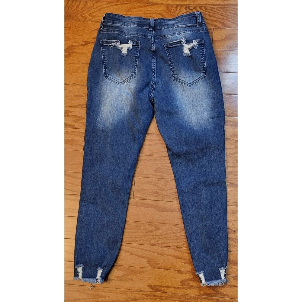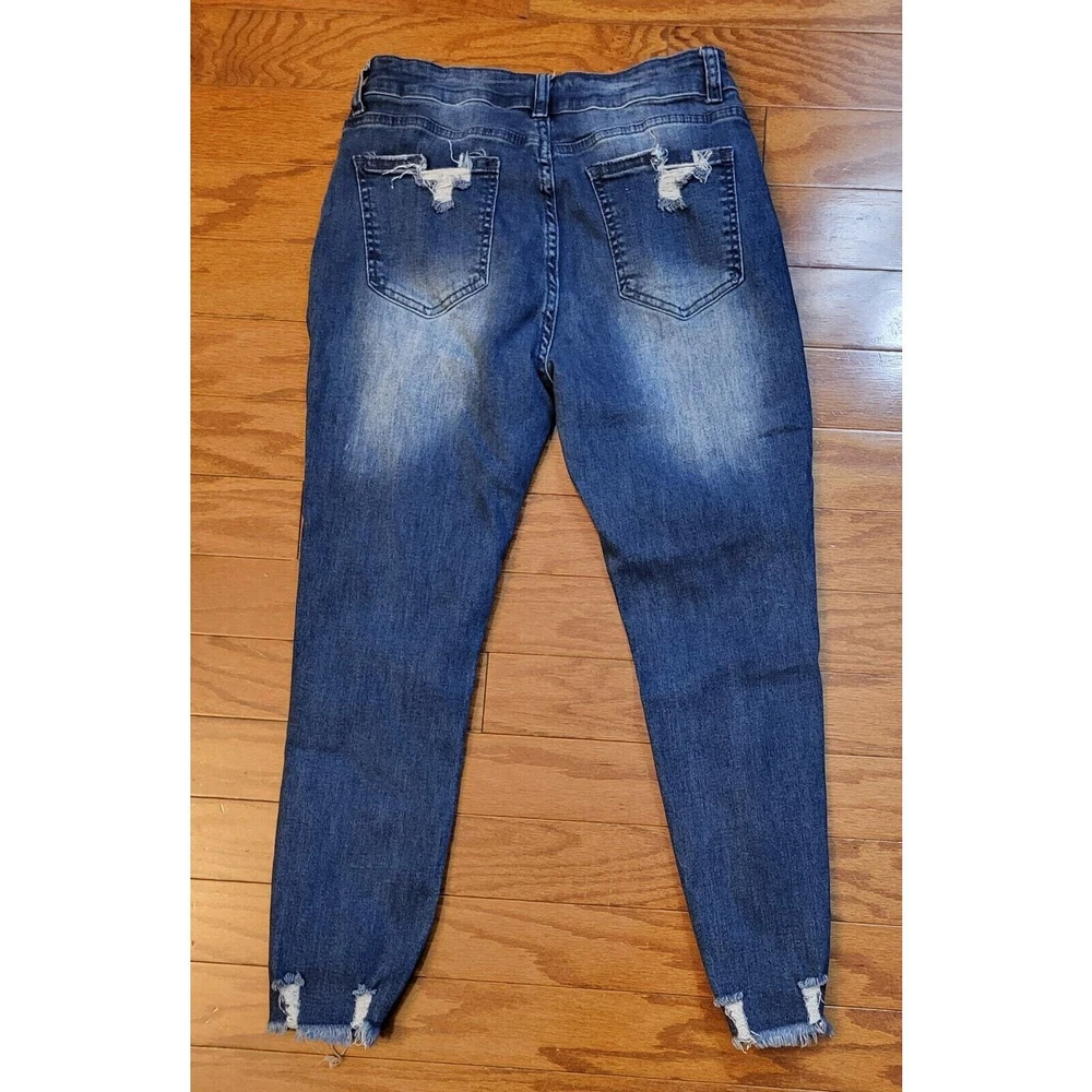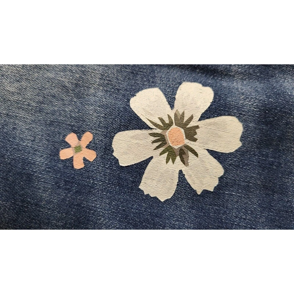 Elevate your denim game with these stylish women's cropped skinny jeans in size LG. The distressed and ripped jeans with the cute floral pattern adds a touch of edgy charm to these skinny jeans, making them perfect for casual outings or a night out on the town. The medium fabric wash complements the blue color, while the floral accents provide a feminine touch. These jeans are designed for women and feature a regular size type, skinny style, and a flattering fit. They are made of high-quality fabric and are perfect for those who want to make a statement with their clothing. These jeans are a must-have for any fashion-forward woman's wardrobe. Waist measures 28 in Rise 10 in Inseam 26.5 in Good pre-owned condition. Jeans are made in China and unbranded. The button closures just has the words Jeans. Add these cute cropped jeans to your wardrobe today!