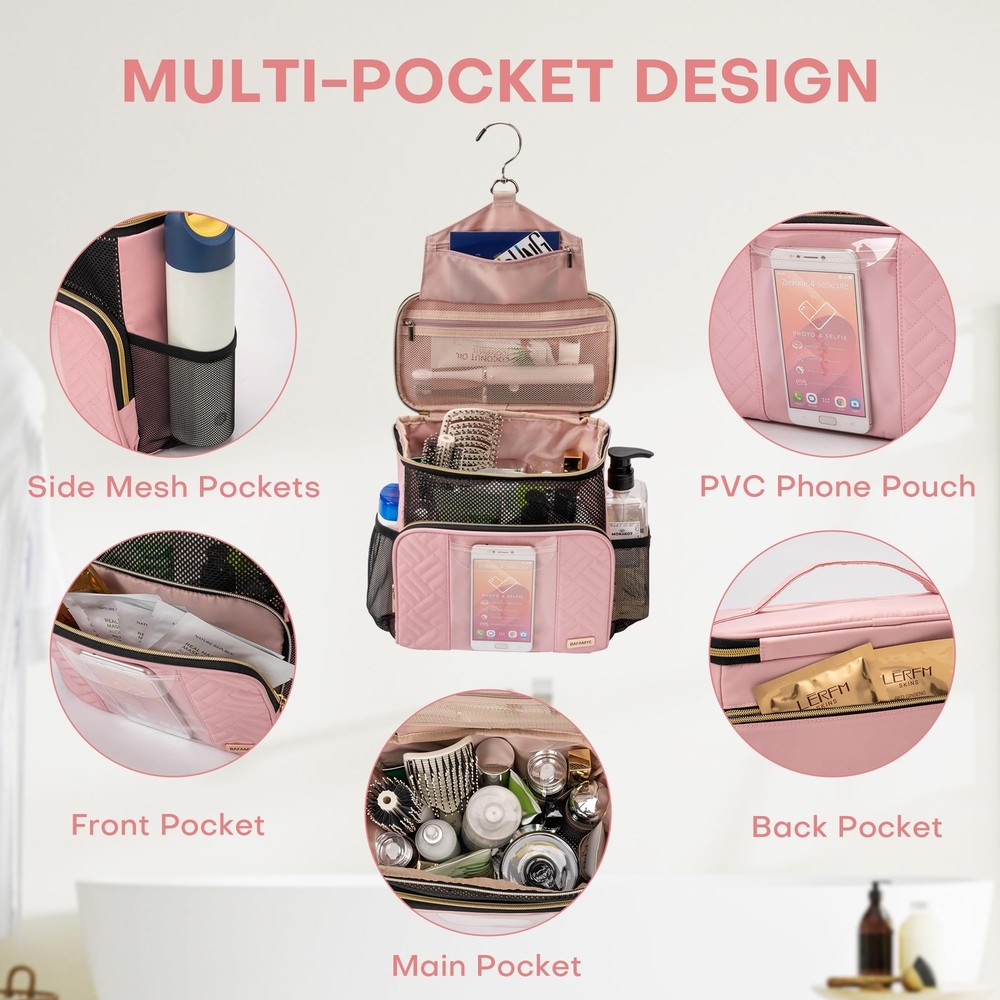 BAFAMYE Women's Hanging Travel Toiletry Bag - Large, Durable, Multipurpose and TSA Approved for the Modern Traveling Woman, Pink Capacious Design - With dimensions of 10in x 10in x 6in, this travel toiletry bag for women can easily accommodate up to 2.6 gal or 9.8L worth of essentials, making it a convenient toiletry bag for women traveling. Durability and Quick-Dry - Fabricated from sturdy oxford fabric and PVC, the BAFAMYE toiletry bag for women exhibits enhanced durability and fast drying abilities. Say goodbye to prolonged wait times for a dry bag! TSA-Compliant - Travel without worry as this women's toiletry travel bag adheres to TSA guidelines, making it a preferred TSA toiletry bag. Unique Multipurpose Use - This women's hanging toiletry bag is not only for travel but can also be utilized for gym use, outdoor activities, and home storage. Truly a toiletry travel bag women would find indispensable! Convenient Phone Access - Not many toiletry bags allow you to keep using your phone in the shower. This unique feature sets our hanging toiletry bag for women apart from others. SHIPPING Domestic Buyers - We have confidence in our products, but if you are not fully satisfied please contact us within 30 days of purchase and you will get full refund. - We ship within 3 business days of payment, usually sooner - We offer FREE shipping on all orders! - We only ship to the lower 48 states, no APO/FPO addresses or PO Boxes allowed International buyers – please note: Import duties, taxes, and charges aren't included in the item price or postage cost. These charges are the buyer's responsibility. - Please check with your country's customs office to determine what these additional costs will be prior to bidding or buying. * Order Cancellation Policy ** You can return a product for up to 30 days from the date you purchased it. 1. The seller reserves the right to cancel the special case only due to eBay cancellation fee. 2. The decision of seller is the final. 3. The seller will respond to the cancellation request within 2 business days. Please wait for the result of cancellation. 4. In case the cancellation is not completed by some reasons, the buyer can follow the options below to get the refund. 4.1 The buyer can reject the item when it arrives. 4.2 The buyer can send the item back to the seller within 30 days If the buyer receives item (USA Shipment ONLY). The seller will provide the FREE return label to the buyer when the buyer opens " Return Item" case on eBay by using the reason as "Change my mind" ONLY. 5. When buyer has placed the order. The order will be processed and completed by automatic warehouse system within 5 minutes. In case that buyer sends the cancellation request after 5 minutes of placing the order, the request will be rejected. **Sending direct message to cancel the order is not allowed for every case.* Return Policy For the return case - If buyer would like to return the items for refund or replacement, please CONTACT SELLER to receive the free return label from seller. The refund or replacement will be processed with the tracking number of return label which is provided by seller only. The other ways of return which are not approved by seller will not be processed for the refund or replacement.