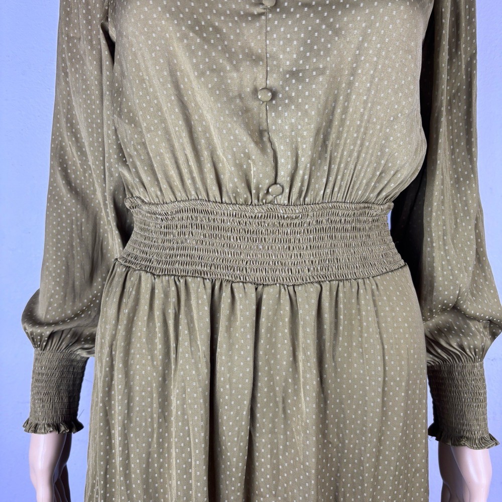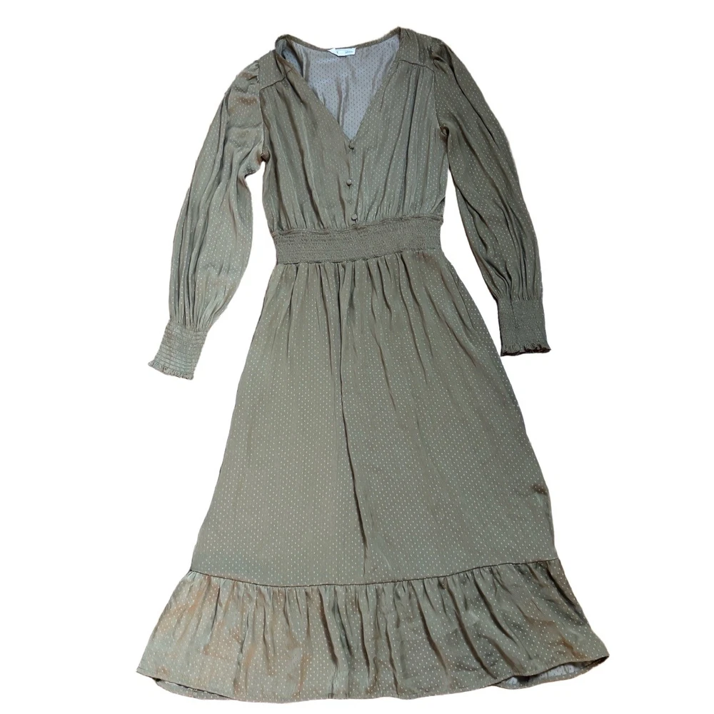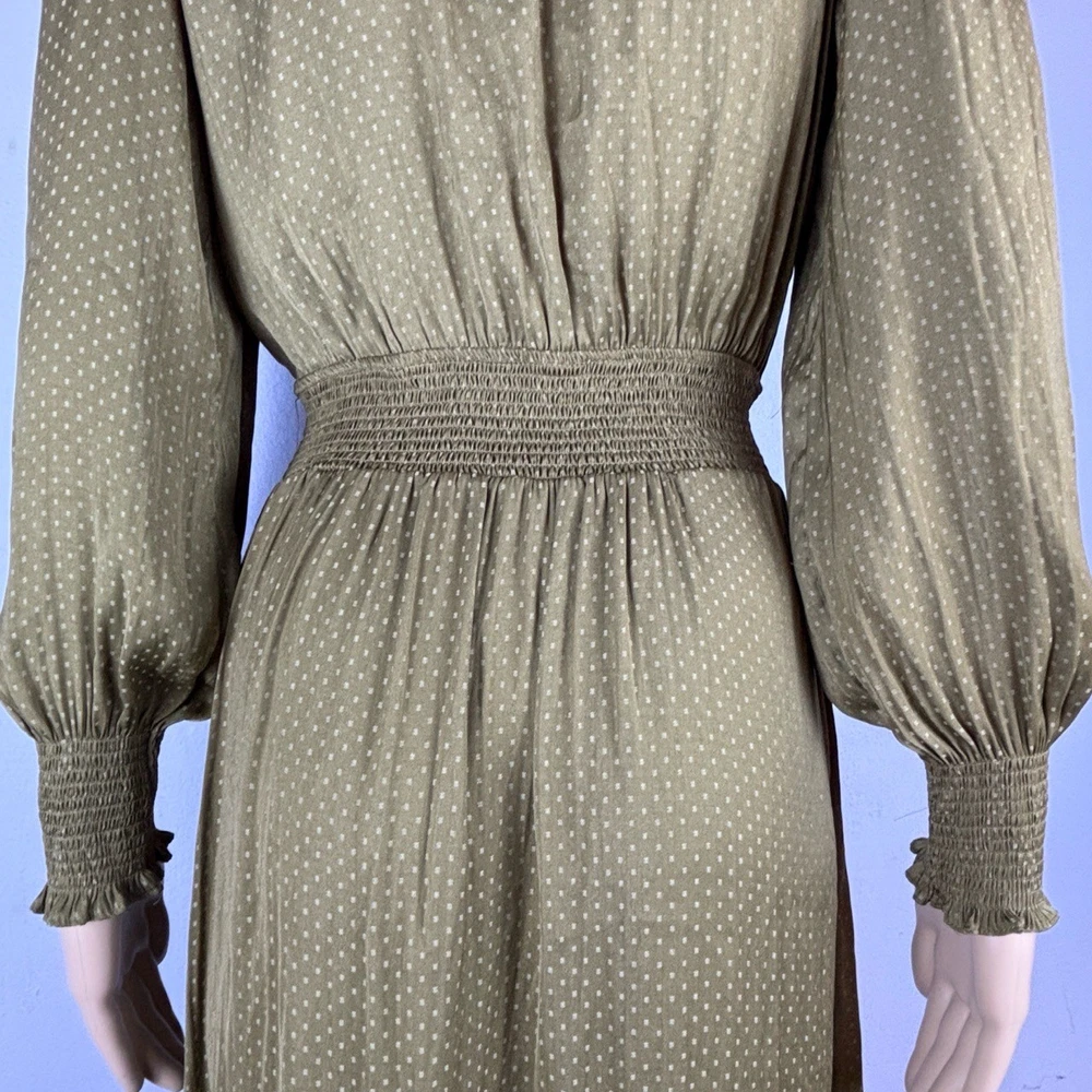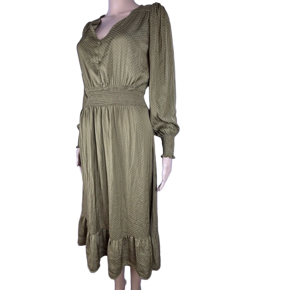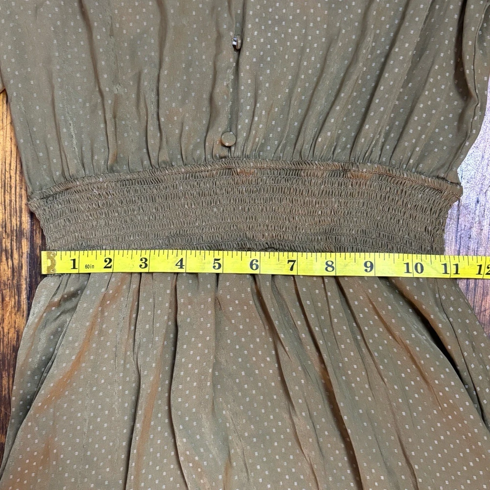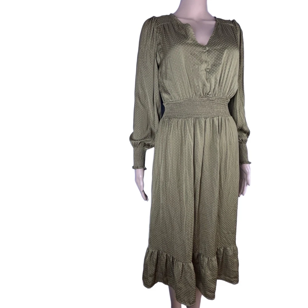 Womens Long Sleeve V-Neck Olive Green Dotted Smocked Waist Dress Versatile Casual Condition: Good condition. Size: Material: Features: V-neck, Smocked Waist, Puffed Shoulders, Dotted Pattern Measurements: See pictures. Tags: casual, everyday, bohemian, prairie, flowy, relaxed, chic, cottagecore, transitional, comfort, autumn, effortless