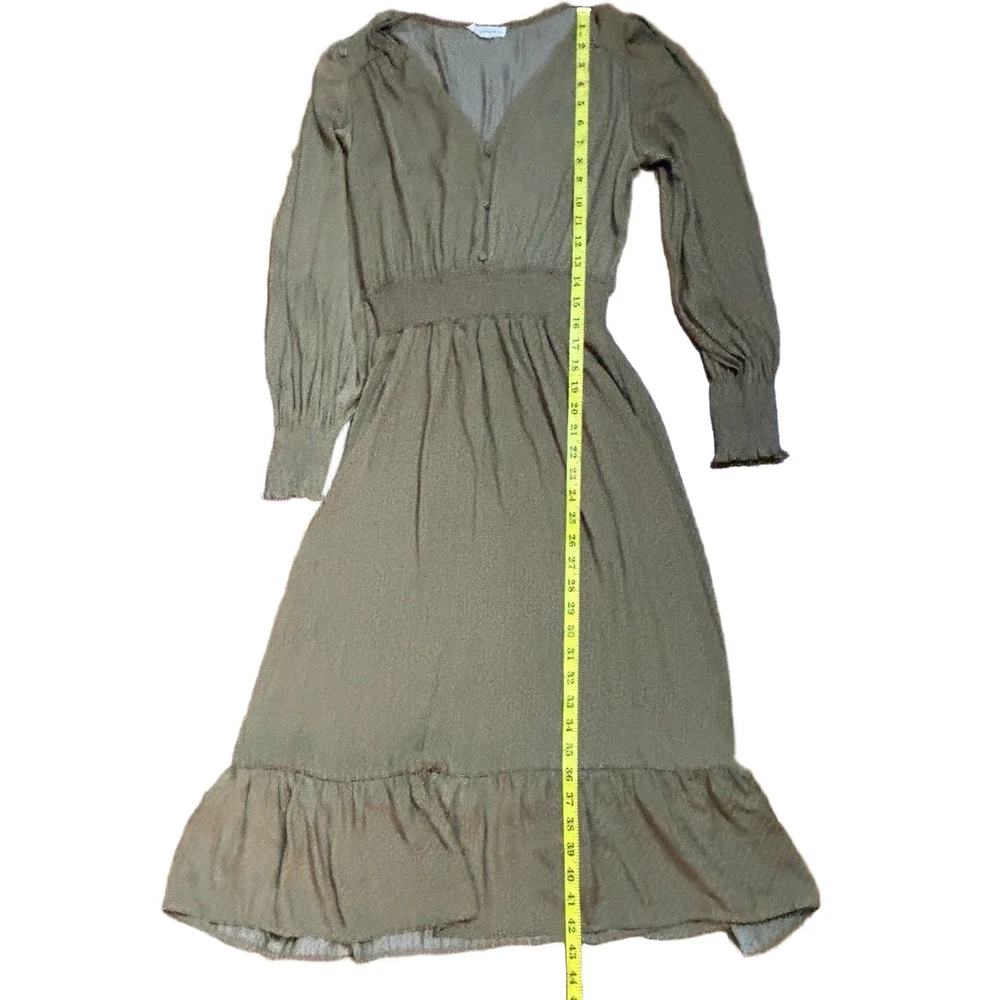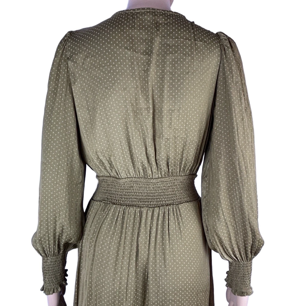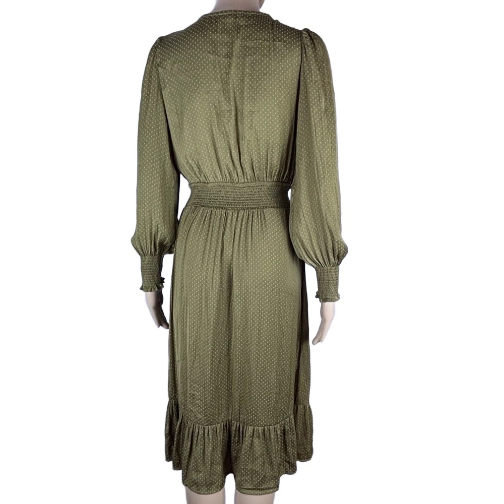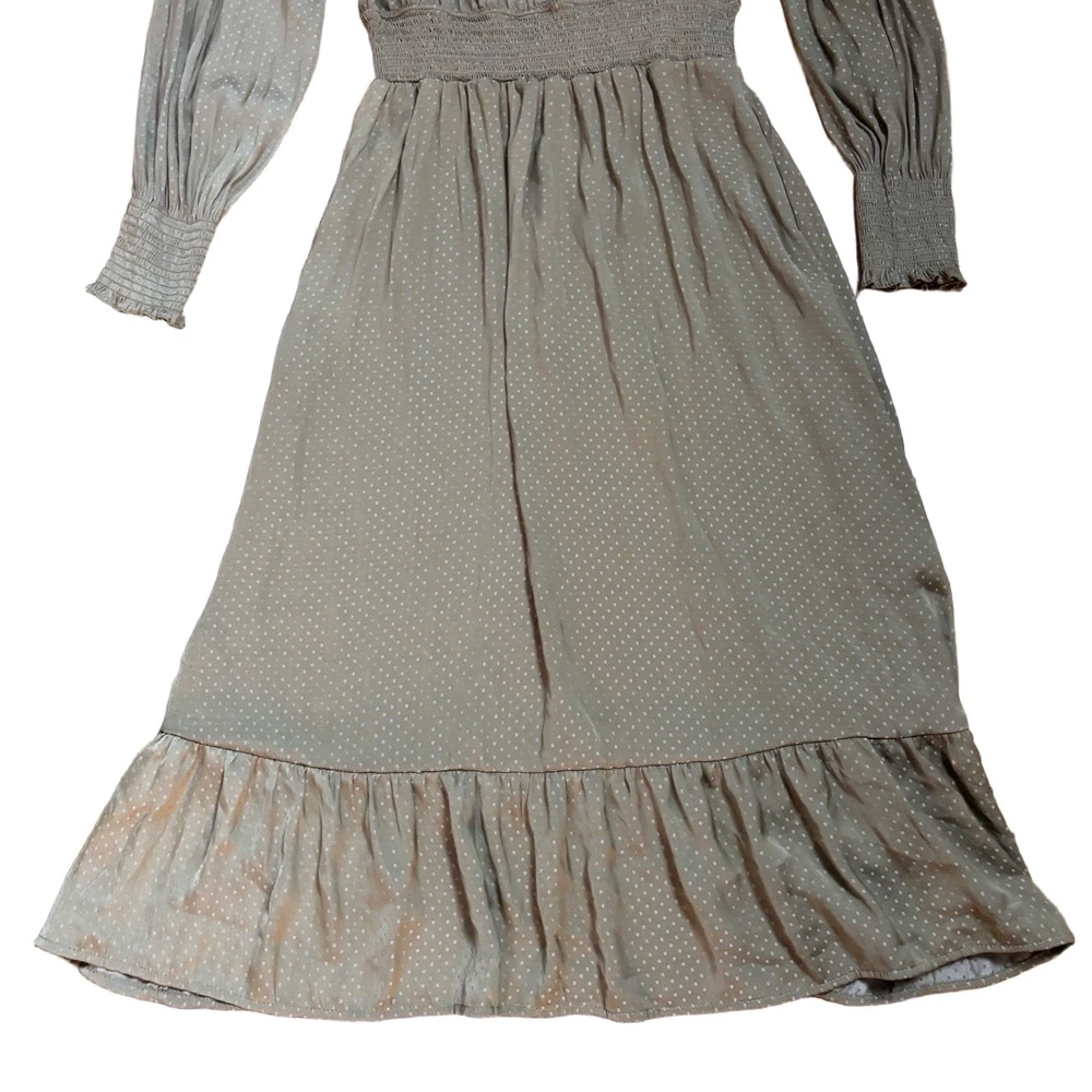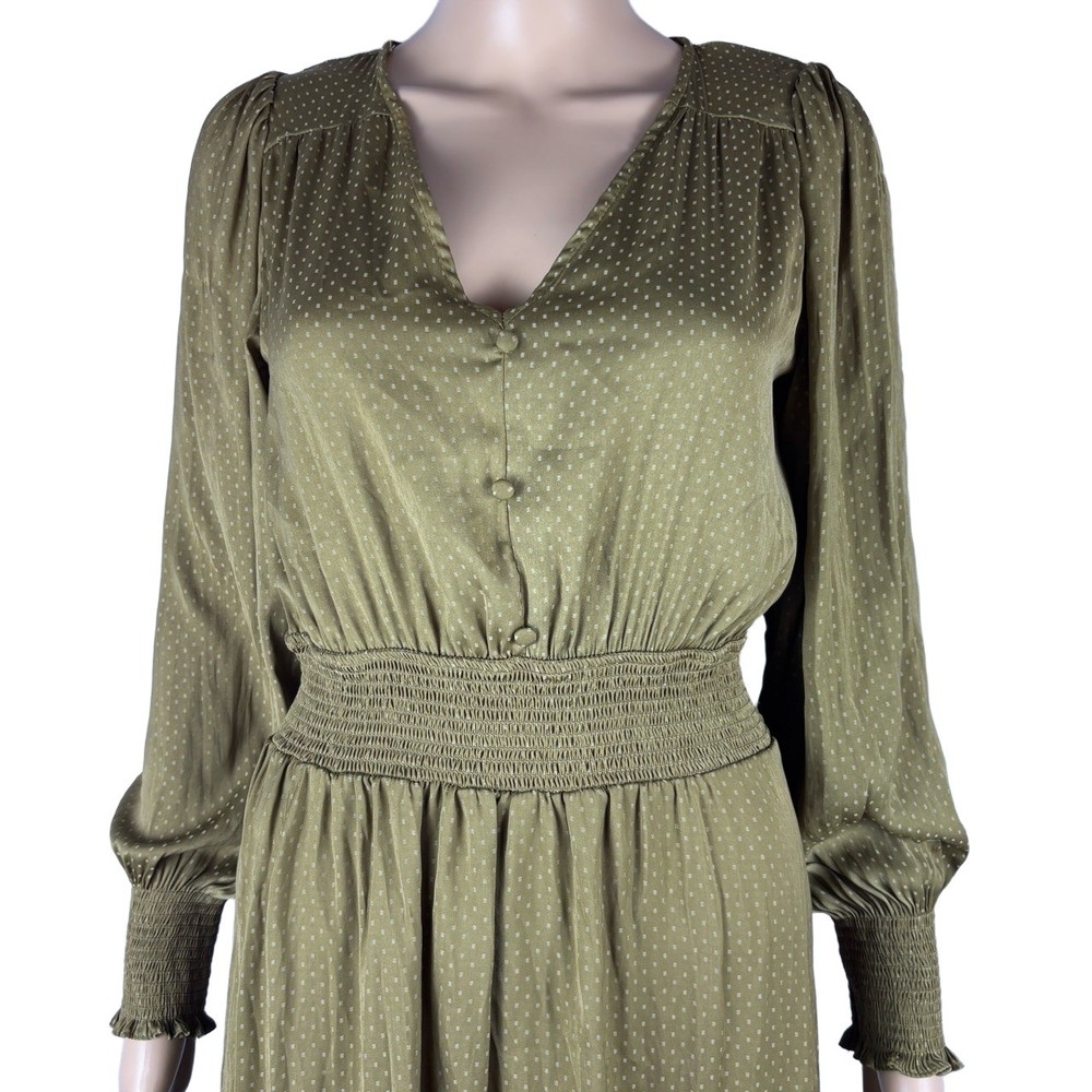 Womens Long Sleeve V-Neck Olive Green Dotted Smocked Waist Dress Versatile Casual Condition: Good condition. Size: Material: Features: V-neck, Smocked Waist, Puffed Shoulders, Dotted Pattern Measurements: See pictures. Tags: casual, everyday, bohemian, prairie, flowy, relaxed, chic, cottagecore, transitional, comfort, autumn, effortless