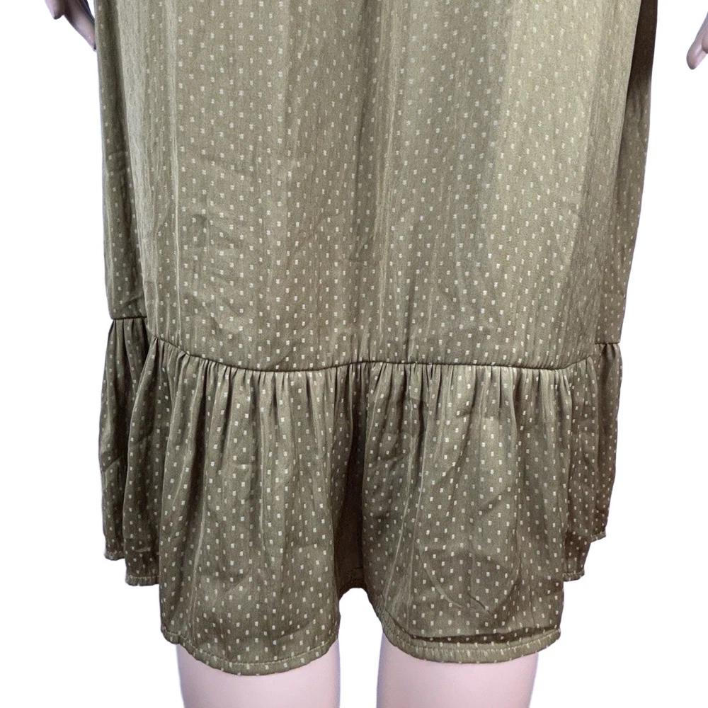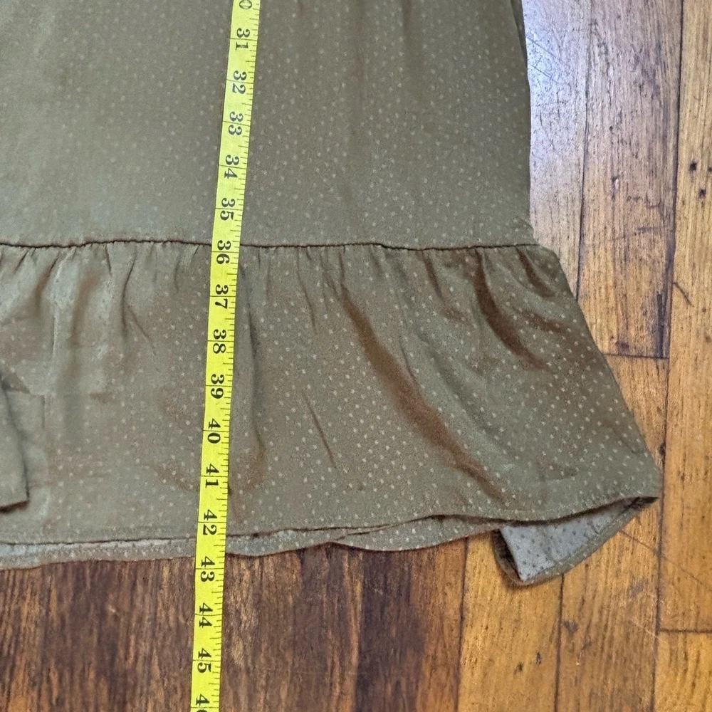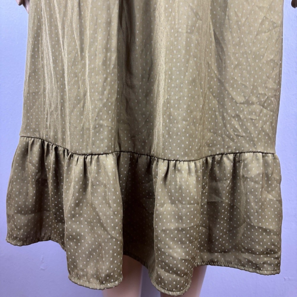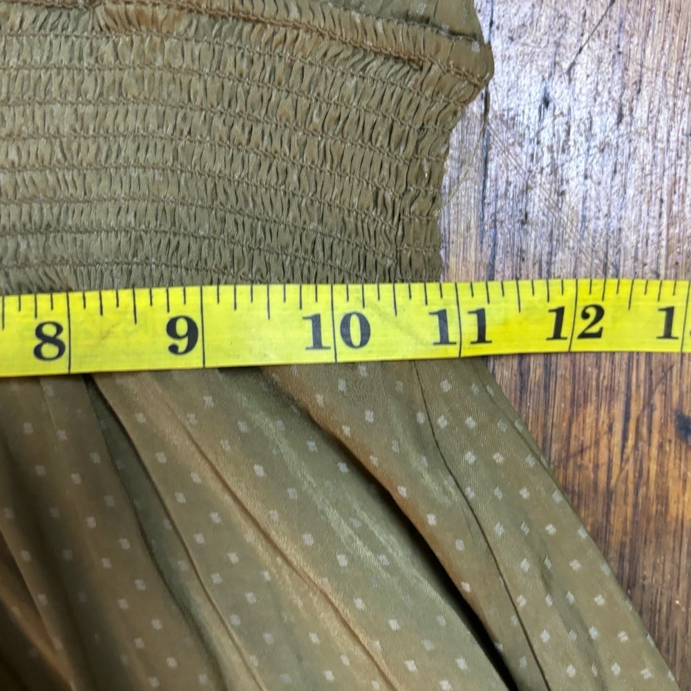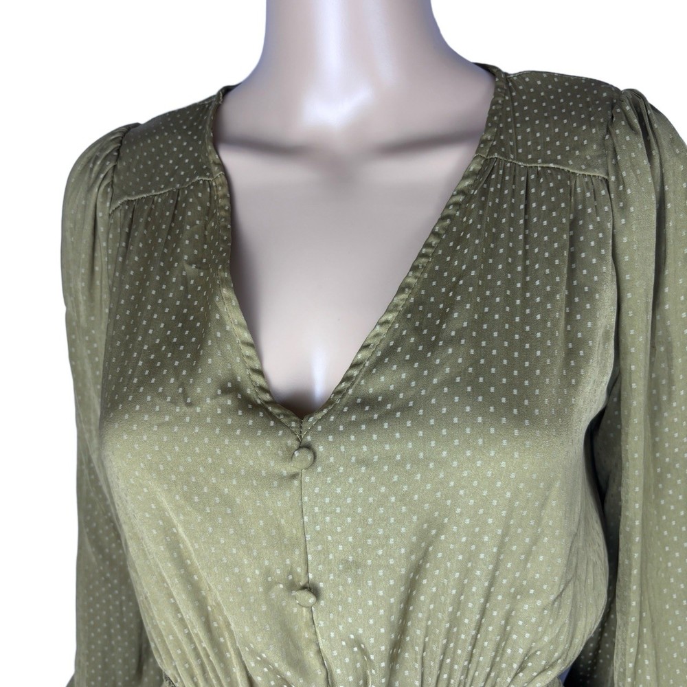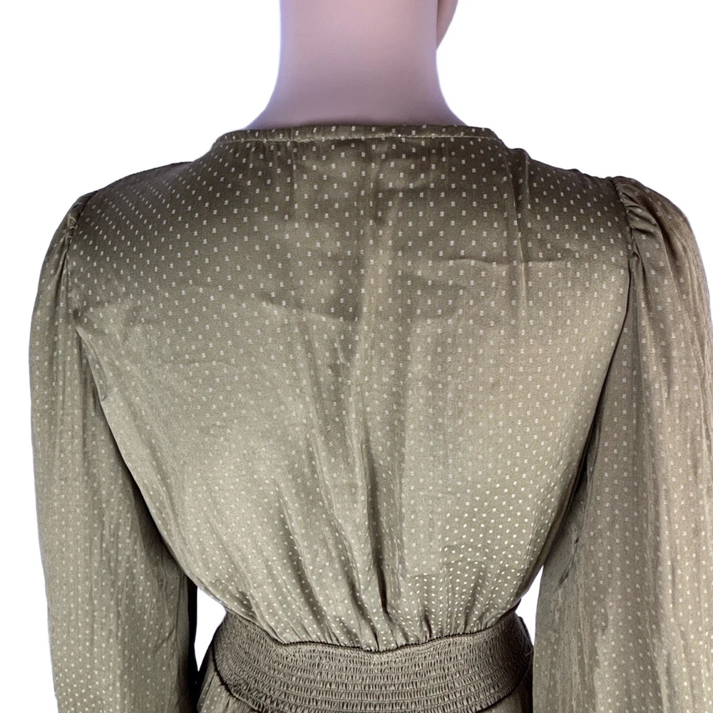 Womens Long Sleeve V-Neck Olive Green Dotted Smocked Waist Dress Versatile Casual Condition: Good condition. Size: Material: Features: V-neck, Smocked Waist, Puffed Shoulders, Dotted Pattern Measurements: See pictures. Tags: casual, everyday, bohemian, prairie, flowy, relaxed, chic, cottagecore, transitional, comfort, autumn, effortless