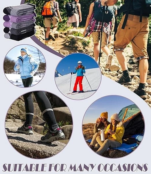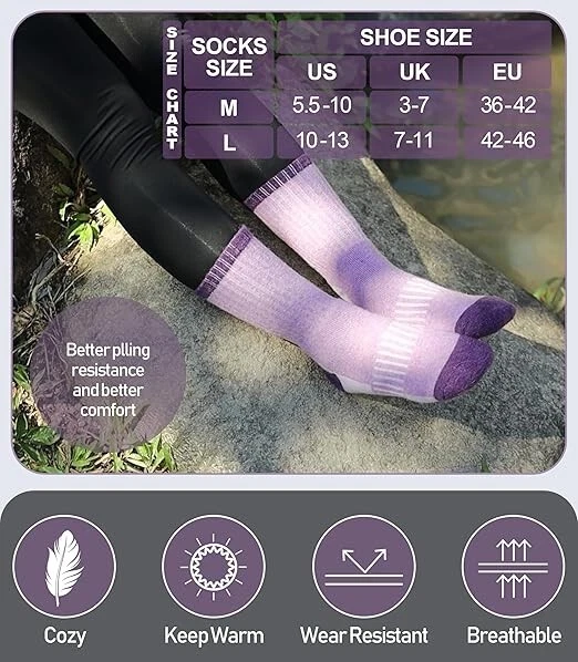 Womens Merino Wool Hiking Socks Thermal Warm Winter Boot Crew Socks Large Size Color: 5 Pairs Color Mix a Size: Large Fabric type70% Merino Wool, 23% Polyester, 5% Spandex, 2% Nylon Care instructionsHand Wash or Machine Wash on a Delicate Cycle OriginImported Pattern: Self Design SELECTED MATERIAL - These womens hiking crew socks made of 70% MERINO WOOL, 23% polyester, 5% spandex , 2% nylon.They can keep the temperature and warm up your feet in cold weather. TWO SIZE OPTIONS - DYW merino wool hiking socks have 2 sizes as options, Medium & Large .Medium Size fits for US women’s shoe size 5.5-10.Large Size fits for US women’s shoe size 10-13. A package includes 5 pairs womens warm socks at a value price.The value package with fashion colors are most women’s favorite. ELASTICITY - These warm hiking socks for womens have high elasticity and arch stripe,which can enhance the blood moving ,relieve symptoms varicose and keep socks stable.They can greatly improve your comfort in hiking , running , walking , climbing , trekking or everyday wear. Protection for Feet:These womens wool hiking crew socks have stretchy cuff and arch support ,which can improve the blood circulation and keep socks fit snugly.Cushion foot absorbs shock and reduces risk of blister.All of these provide more protection for women’s feet. GREAT GIFT CHOICE : Merino wool hiking socks are best present options for womens . They will be a surprise for your loved ones as birthday gift, Christmas gift, Mother’s Day gift, Valentine’s Day gift ,White Elephant Day gift. Return Policy: We offer a 30 day return policy from the receiving date. Please contact us for a Free Return Label. Please use our return label so it will go back to our supplier and we can do a refund or replacement afterwards. Feedback: Your satisfaction is very important to us! If you have any problem with your order, please contact us and we will do our very best to make you satisfied. As long as you are happy with your purchase, please leave a positive feedback for us. We will always leave you a positive feedback in return. If you have any problem with your purchase, please do not leave a negative feedback. Please Contact us ... and your issue will be solved quickly and positively We are a small family-owned business trying to make a living, not a huge company that does not care ... We will ALWAYS do our best for you!
