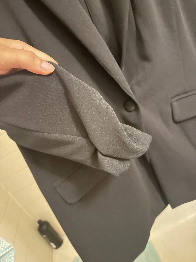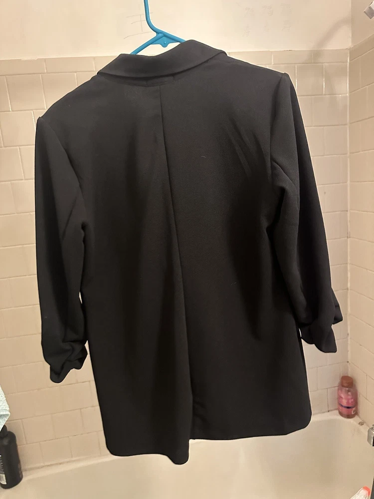 • 3/4-sleeves with ruched cuffs • Imported • Side flap pockets • Lined • Notched lapel; button front closure Size & Fit • Approx. 28" long Material & Care • Machine wash • Polyester, spandex