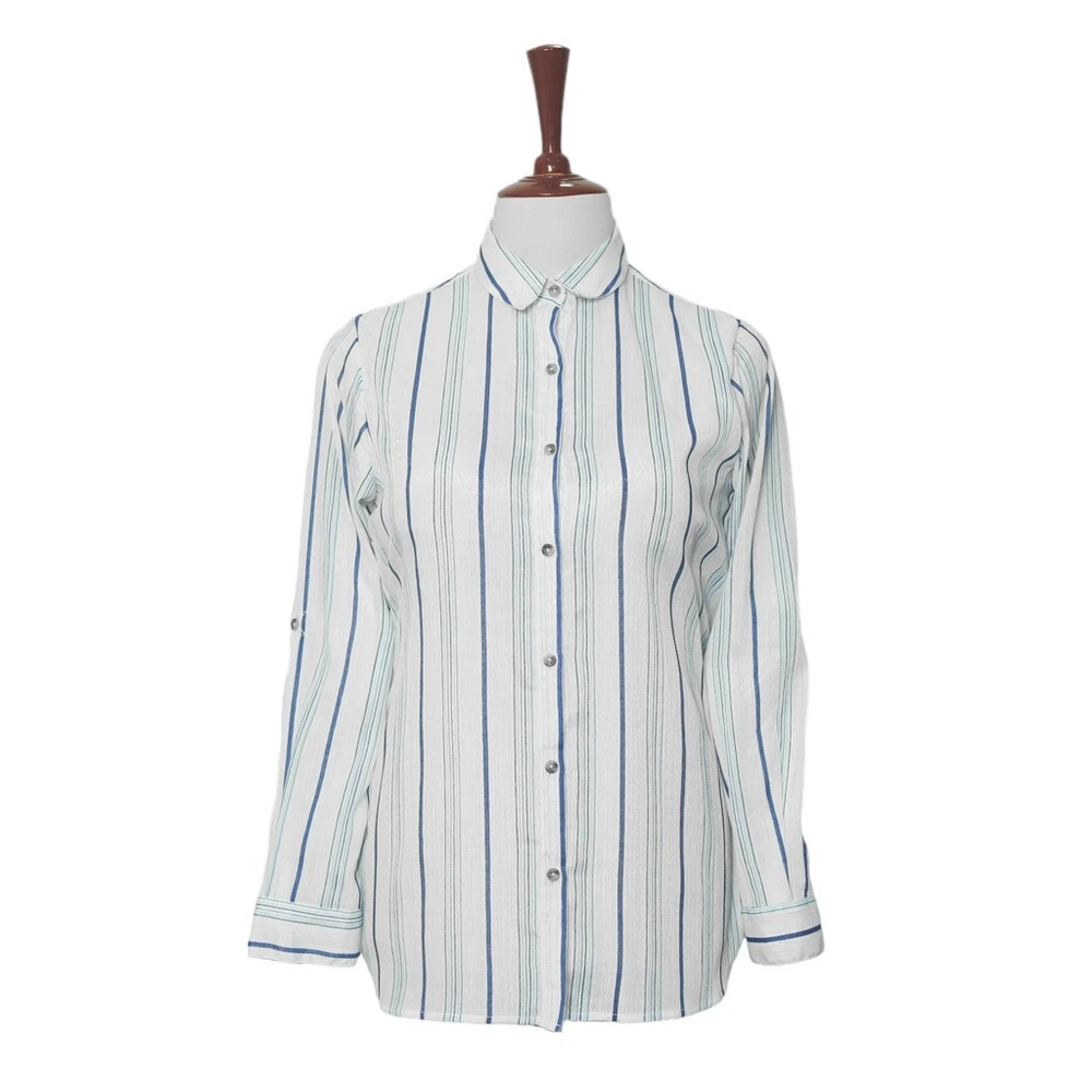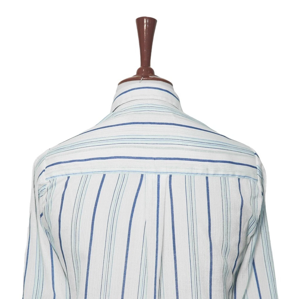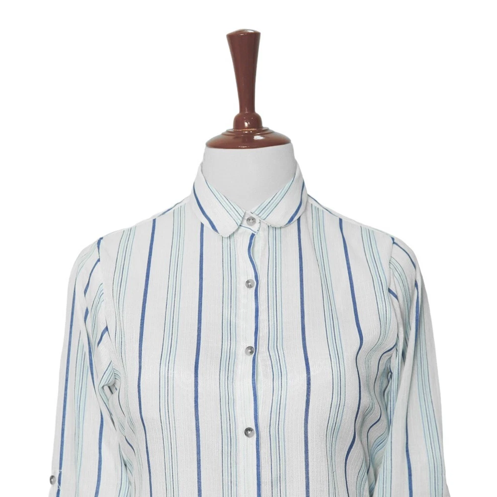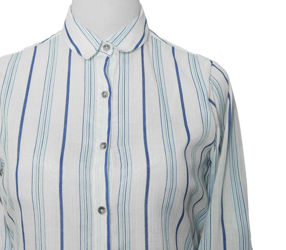 Experience the perfect comfort and feel of premium quality chiffon in this modern classic. Hand sewn for the classic lady, this long sleeve shirt features a full button front, one-button barrel cuffs , spread collar and bone buttons. Choose this shirt for everyday wear or for parties and elegant events. Match it with jeans, chinos or dress pants for a polished, sleek look. Buy it for yourself, or gift it to a loved one for an anniversary, holiday, birthday or just because. DETAILS: • Color: Blue, white • Pattern: Striped • Size: Medium • Features: A djustable two-button barrel cuffs , spread collar and bone buttons • Material: Chiffon • Care: Hand wash or dry clean only • Construction: 100% HANDMADE MEASUREMENTS: Please check the size measurements carefully before buying the product. Please allow a 2-3 cm difference due to manual measurement. • Chest: 20.5" (armpit to armpit) • Length: 31 1/4" • Sleeve Length: 24 1/4" (measured from shoulder seam) Visit our shop for more: https://www.ebay.com/str/chiraghapparel