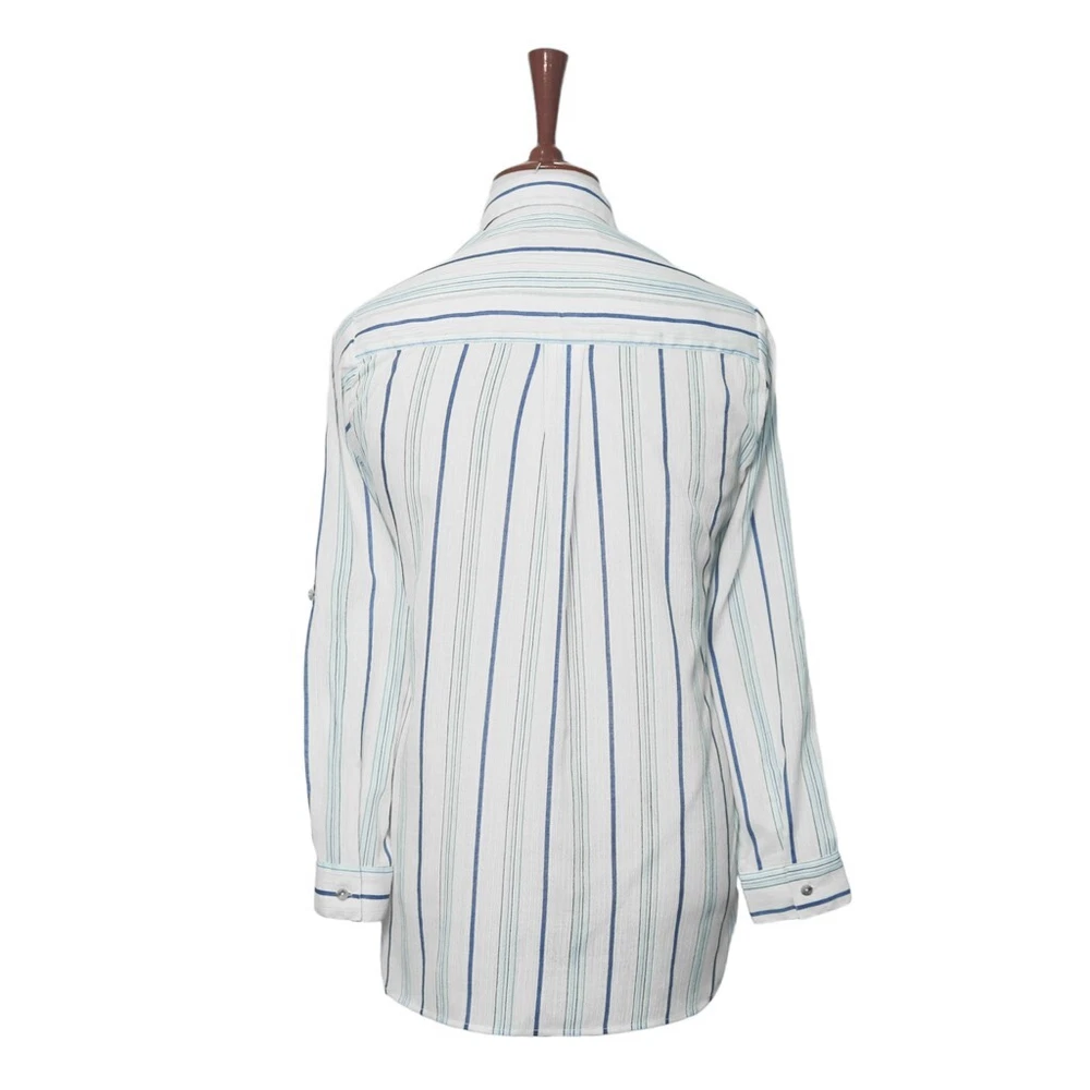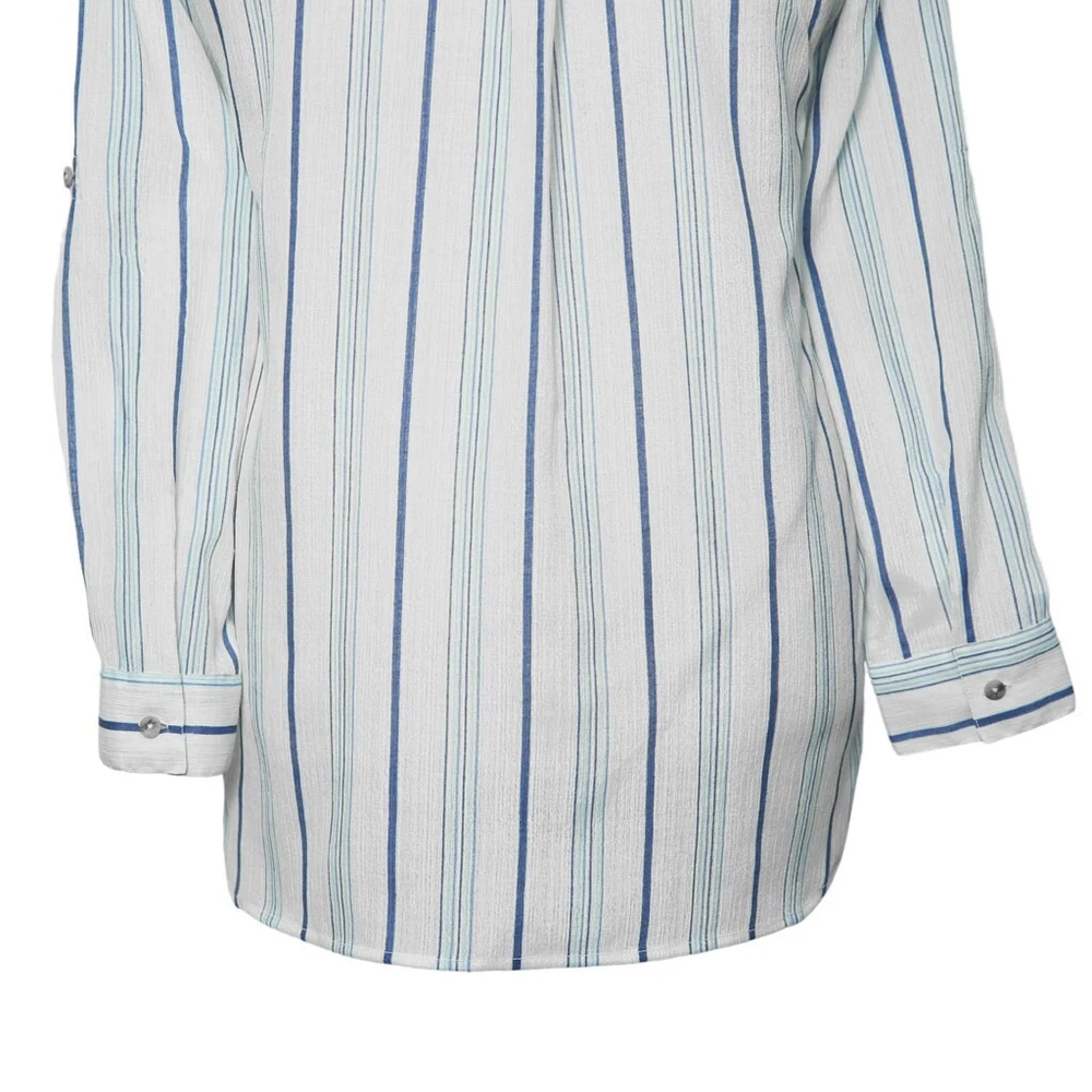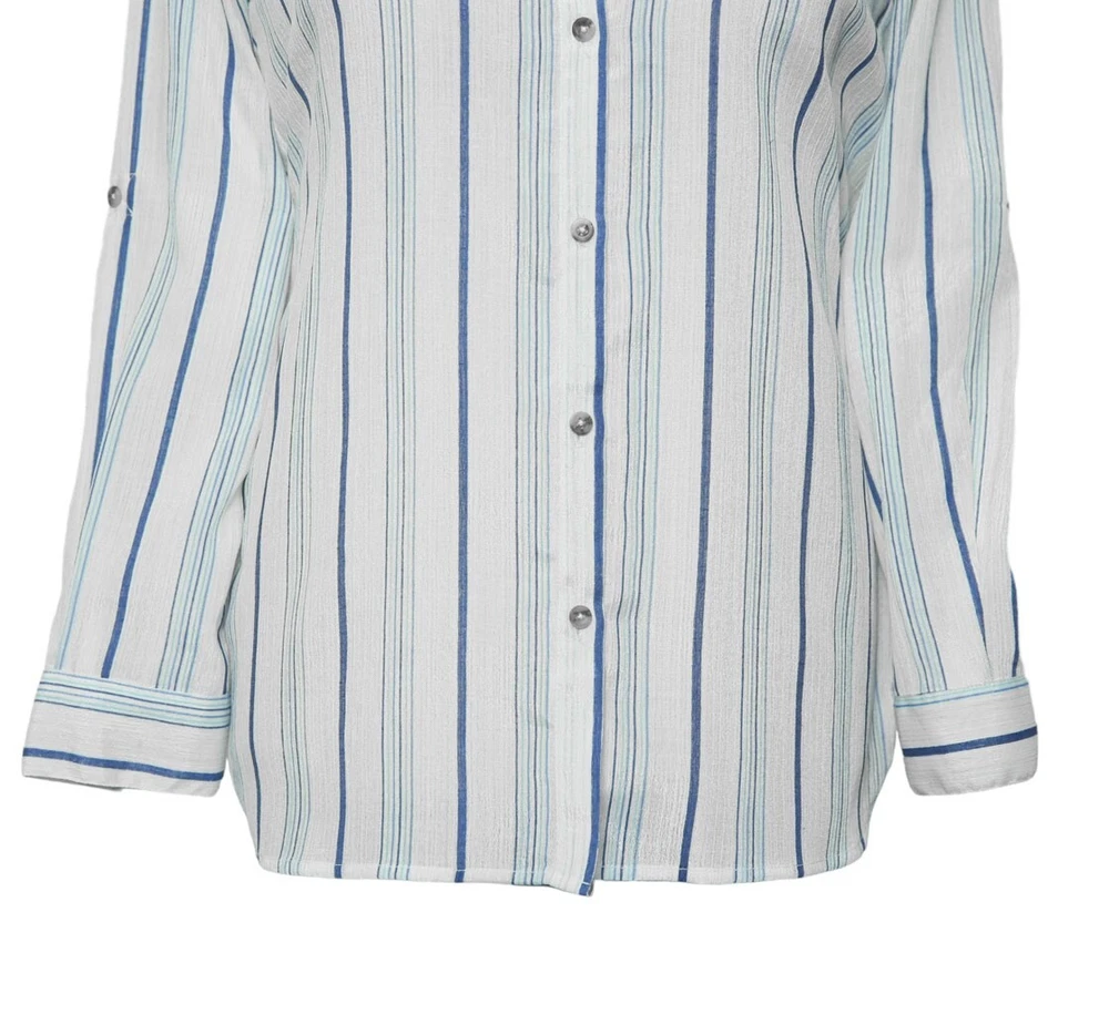 Experience the perfect comfort and feel of premium quality chiffon in this modern classic. Hand sewn for the classic lady, this long sleeve shirt features a full button front, one-button barrel cuffs , spread collar and bone buttons. Choose this shirt for everyday wear or for parties and elegant events. Match it with jeans, chinos or dress pants for a polished, sleek look. Buy it for yourself, or gift it to a loved one for an anniversary, holiday, birthday or just because. DETAILS: • Color: Blue, white • Pattern: Striped • Size: Medium • Features: A djustable two-button barrel cuffs , spread collar and bone buttons • Material: Chiffon • Care: Hand wash or dry clean only • Construction: 100% HANDMADE MEASUREMENTS: Please check the size measurements carefully before buying the product. Please allow a 2-3 cm difference due to manual measurement. • Chest: 20.5" (armpit to armpit) • Length: 31 1/4" • Sleeve Length: 24 1/4" (measured from shoulder seam) Visit our shop for more: https://www.ebay.com/str/chiraghapparel