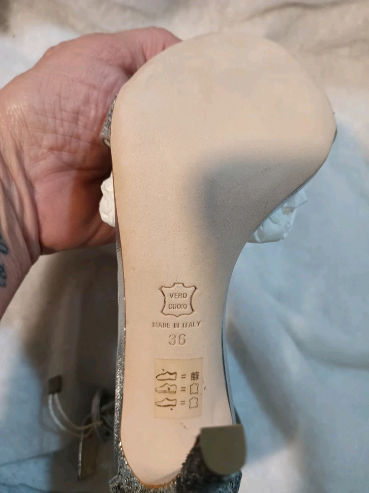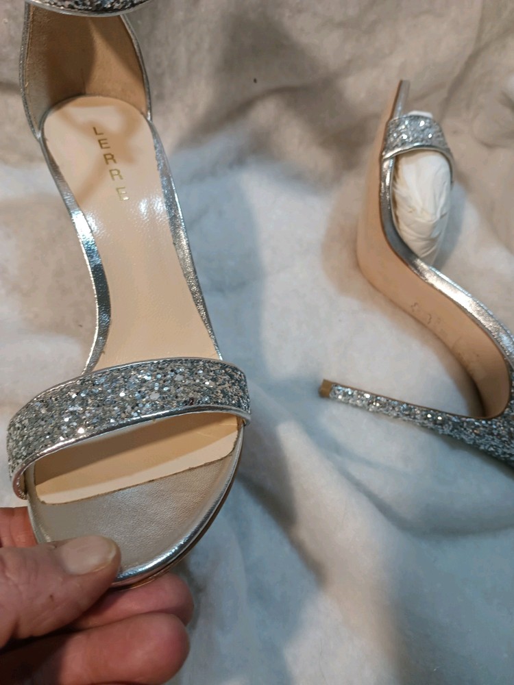 Elevate your style with these stunning Lerre glitter heels. These high stiletto heels feature an almond toe and slip-on closure for easy wear. The ankle strap adds a touch of sophistication, making them perfect for formal occasions, parties, or even weddings. The silver color and glittery finish make them the perfect statement piece to complete your look. Made with a leather outsole, these heels are sure to last. Don't miss out on the chance to add these gorgeous heels to your wardrobe.