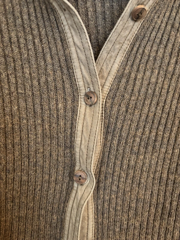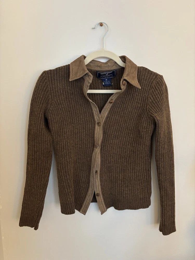 This is a women's Ralph Lauren sweater in size M, designed as a button-up cardigan style in a brown color. It is made from a blend of 50% wool and 50% linen, featuring a knit fabric type with accents of wooden buttons. The sweater exudes a sporty theme, perfect for casual or athletic wear. Some of the buttons are a little loose and the tag is starting to fall off, otherwise it is in perfect condition!