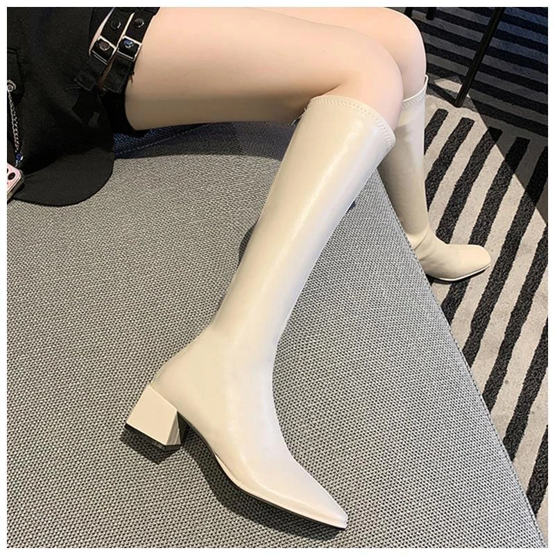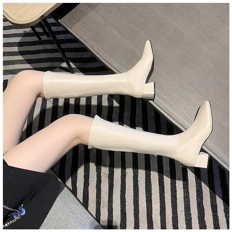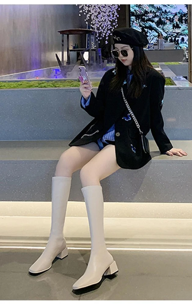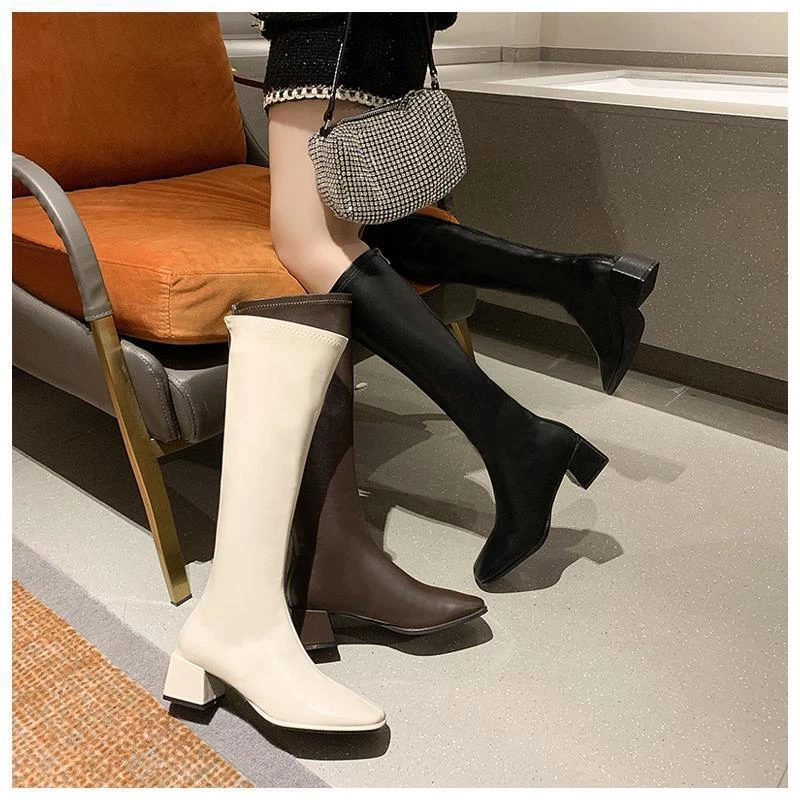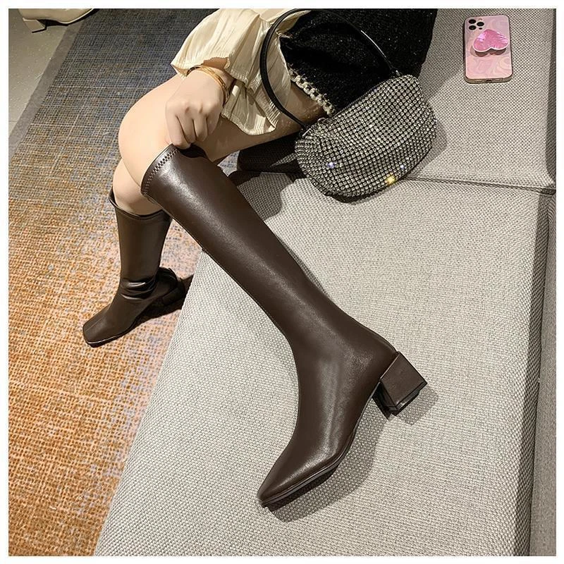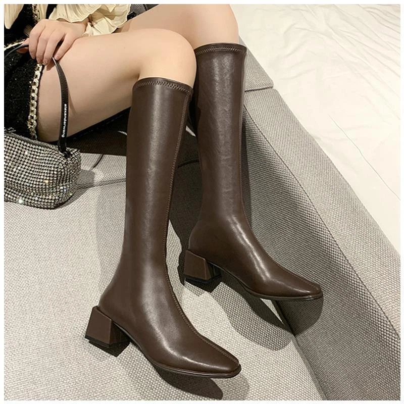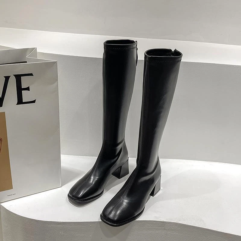 Women's Square Toe Knee-High Boots with Low Mid Heel and Back Zipper for Casual Riding Style