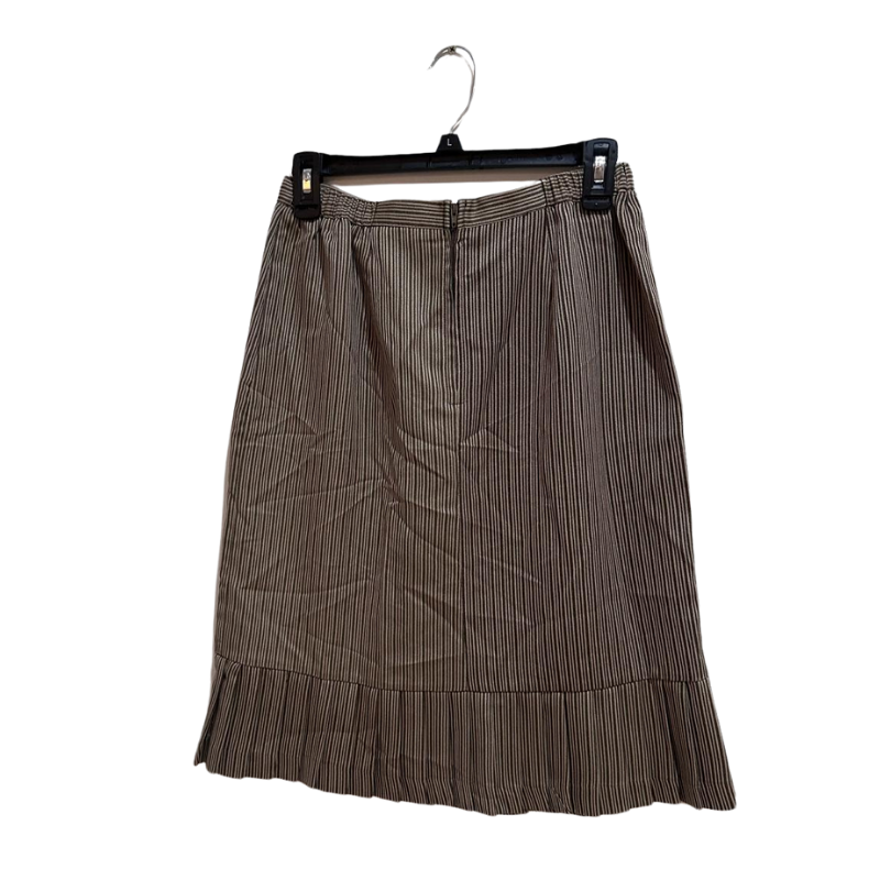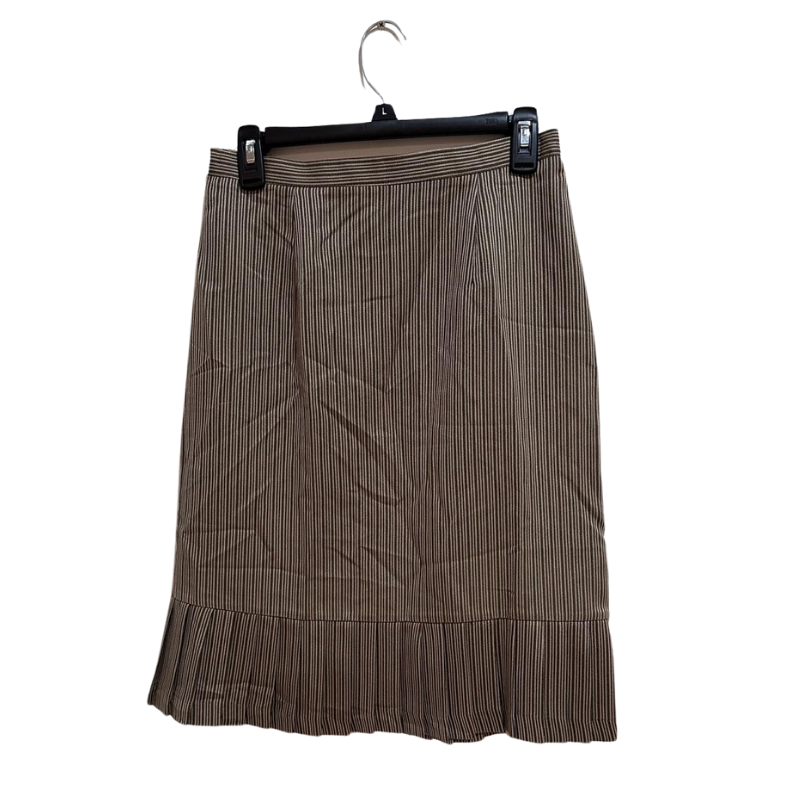 Upgrade your wardrobe with this stylish women's striped pleated hem skirt in size 8. Featuring a classic brown and beige pinstripe pattern, this skirt is perfect for workwear or casual outings. Made in Guatemala from durable polyester fabric, it offers comfort and easy maintenance. The pleated hem adds a chic touch, making it a versatile addition to any collection. Color: Brown/Beige striped pattern Material: Polyester (Machine washable, tumble dry low) Style Number: 2837091 Lot Number: M056