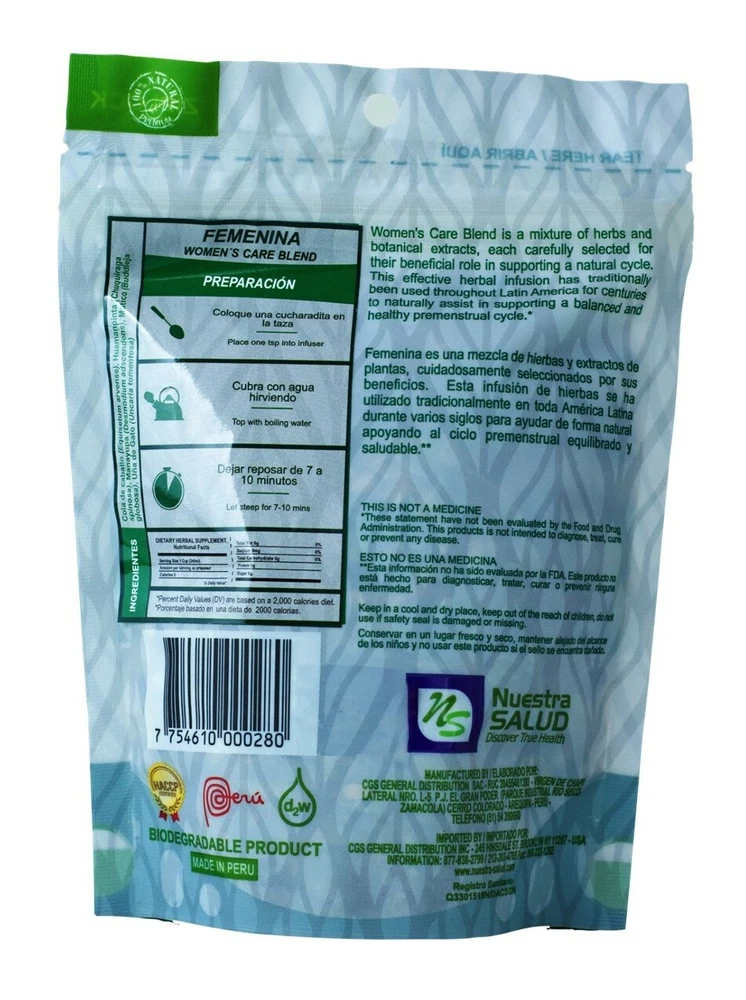 Femenina Women's Tea Care Blend Herbal Infusion Tea Zip-Lock Bag (40g) ntroducing Femenina Herbal Tea, a blend crafted to support women's well-being with the finest ingredients from the heart of Peru. Matico, known for its soothing properties, combines with Cat's Claw, a vine revered for its potential health benefits. Huamanpinta and Manayupa, traditional herbs used for generations, complete this harmonious blend. Carefully curated, Femenina Herbal Tea is a comforting companion for women seeking balance and vitality. supporting a balanced and healthy premenstrual cycle. Huamanpinta ( Chuquiraga spinoza ) Manayupa ( Desmodium adscendens ) Matico ( Piper aduncum ) Una de Gato – Cat’s Claw ( Unicaria tomentosa ) Superior Blends There’s an art to collecting and drying herbs; a technique passed down through Peruvian culture for centuries. We lean on this ancient knowledge to keep the potency of the herbs we collect at its peak. Our herbs are picked and packaged in their whole and unfiltered form to deliver the transformative nutrients just as Mother Nature intended: pure and simple. Next Level Freshness Taste the enchanting character of the Peruvian coast, angelic Andes, and majestic jungle. Our Peruvian herbal teas are diligently packed in zip-lock bags to tightly seal in the freshness and deliver enticing flavor with every sip. Whether you’re starting your day, re-charging your afternoon, or relaxing away in the evening, freshness will always be part of the equation. Discover the Variety Taste the enchanting character of the Peruvian coast, angelic Andes, and majestic jungle. Our Peruvian herbal teas are diligently packed in zip-lock bags to tightly seal in the freshness and deliver enticing flavor with every sip. Whether you’re starting your day, re-charging your afternoon, or relaxing away in the evening, freshness will always be part of the equation.