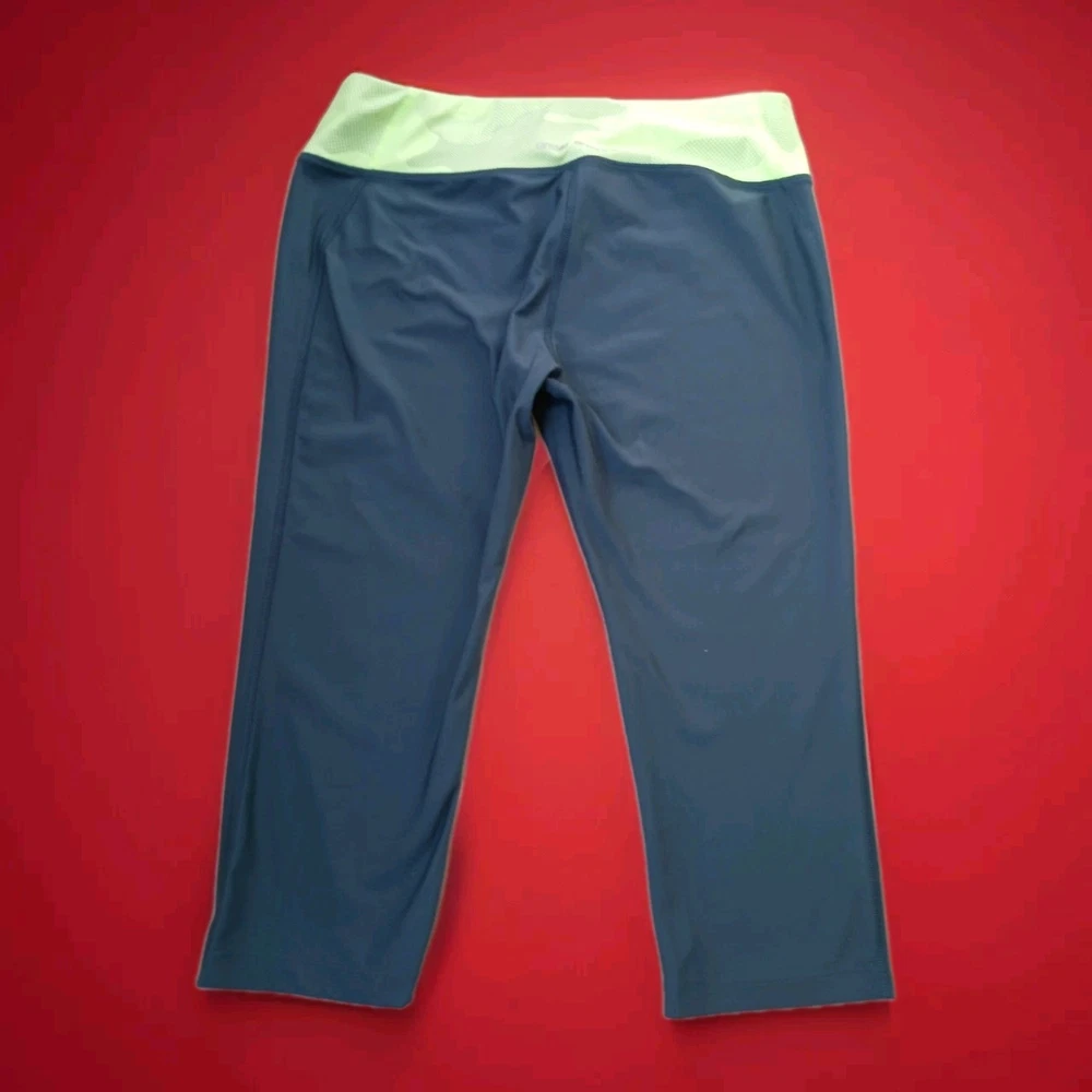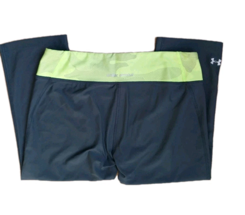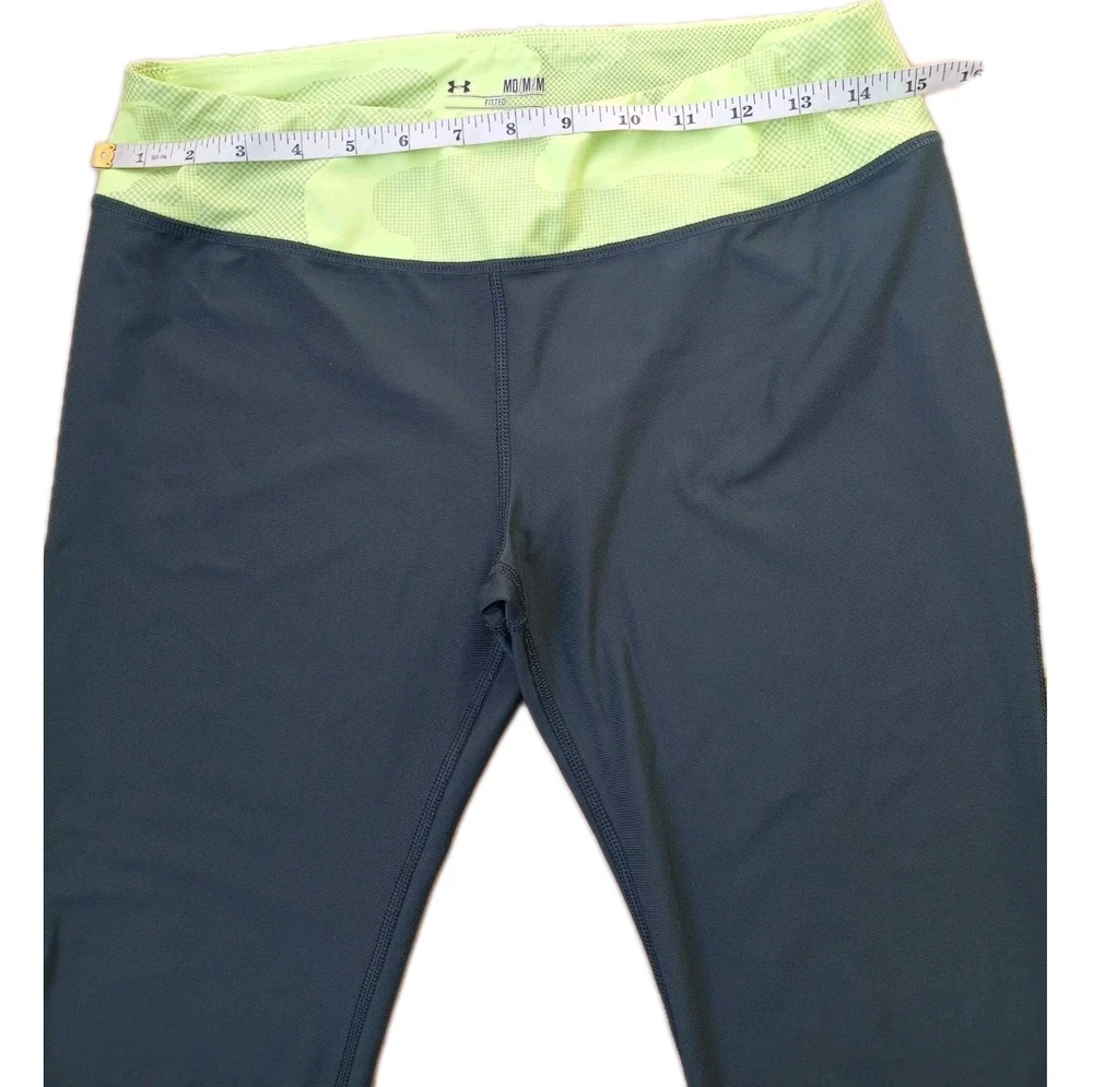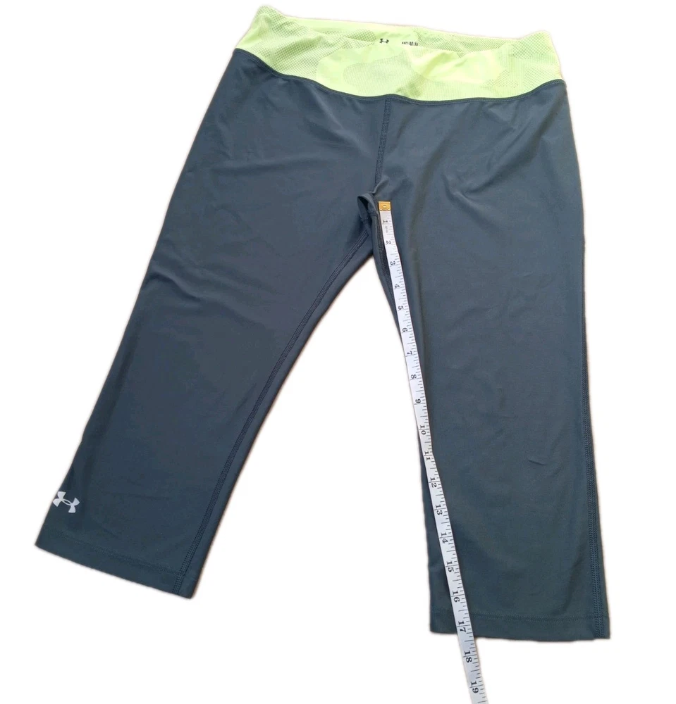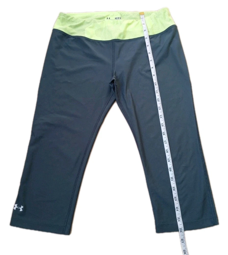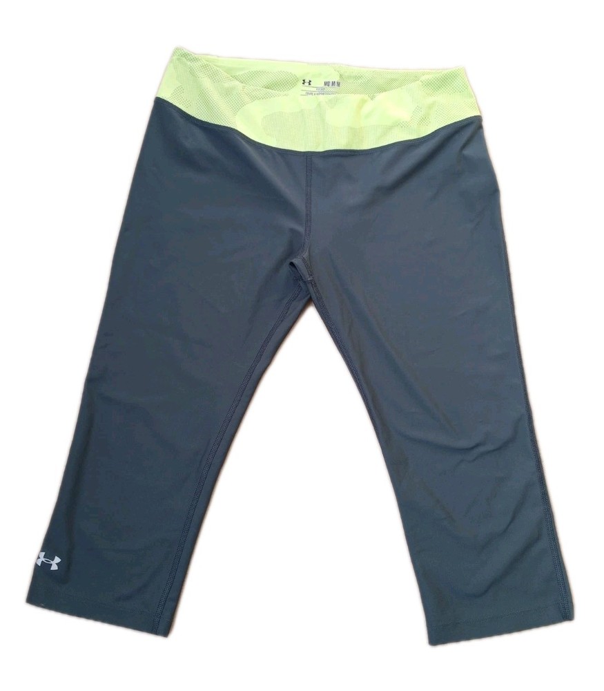 These Women's Under Armour Althetic Capri Leggings in size medium feature a pull-on closure and a mid-rise fit, making them perfect for activewear occasions. Made from stretch fabric with an elastic waist, these leggings offer comfort and flexibility. The solid gray color with green accents and the Under Armour logo make them stylish for various activities such as gym & training, walking, yoga, and running. With a 17-inch inseam and a waist size of M/15 inches, these leggings are machine washable and designed for athletic fit. Perfect for all seasons, these leggings are a versatile addition to any woman's wardrobe.It's pre owned 👈