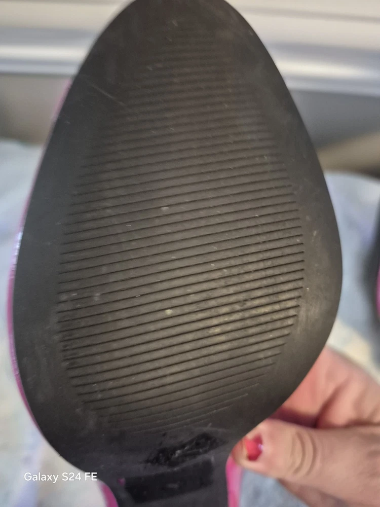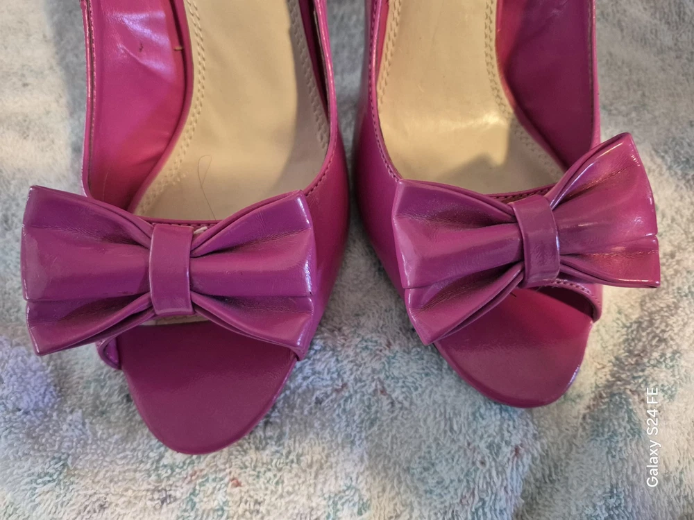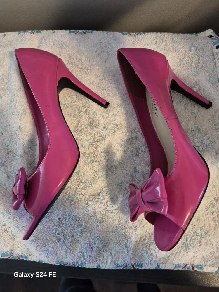 These are like new These are women's Versona peep toe heels in pink with a bow accent. They have a slip-on closure and a stiletto heel style. The upper material is polyurethane and the heel height is mid (2-2.9 inches). These shoes are suitable for party, cocktail, or business occasions, and they are available in size 8.5M. The toe shape is peep toe and the season is summer and spring