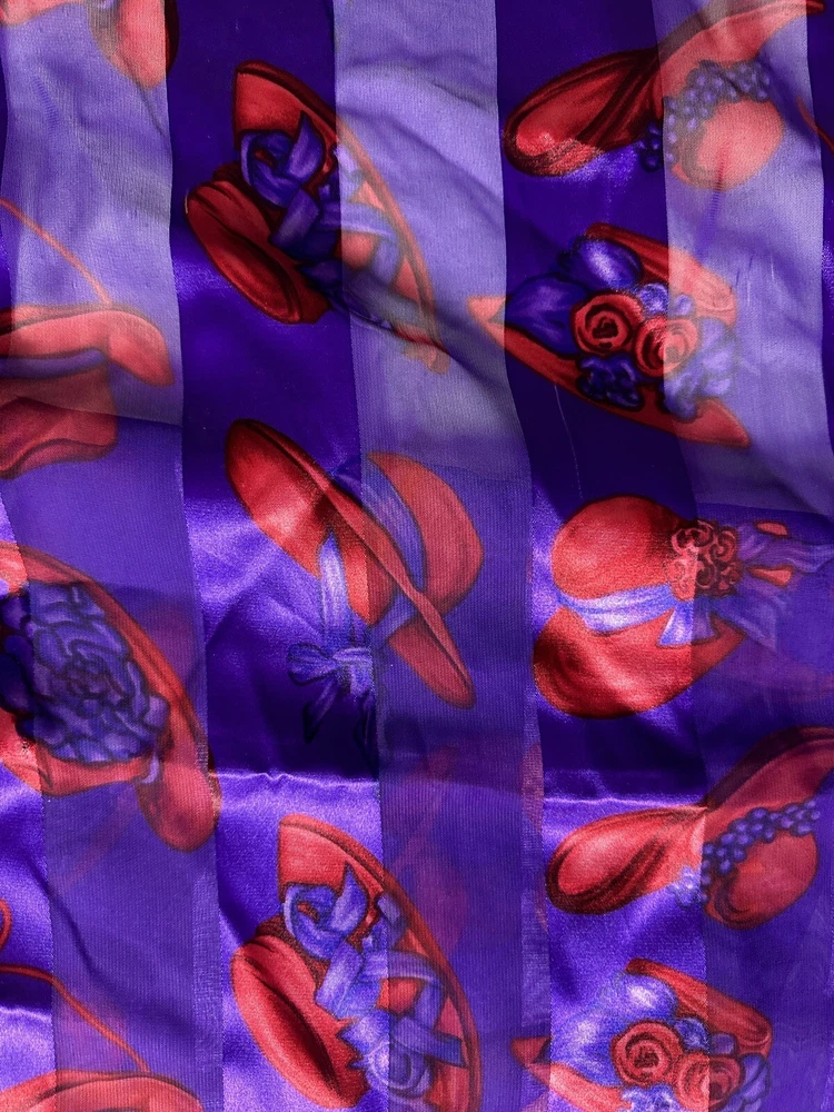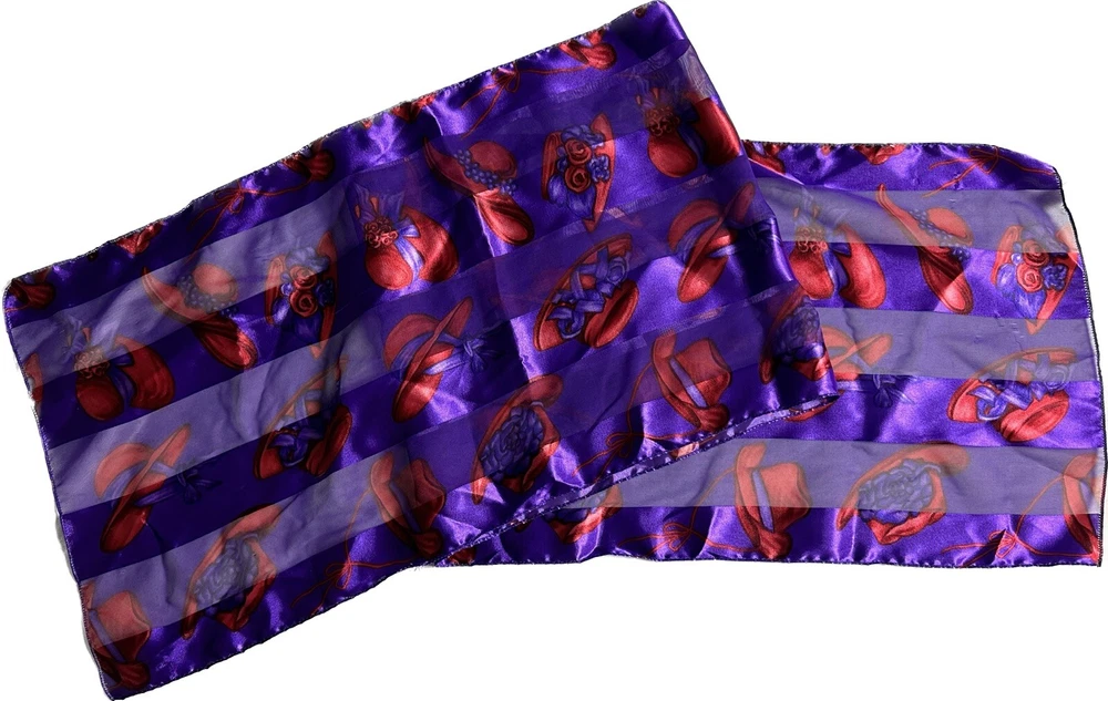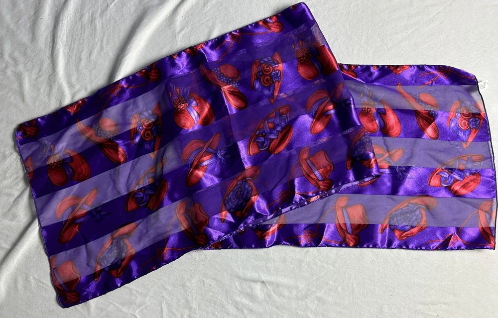 Type: Scarf Brand: Vintage Features: Multifunctional Department: Women Style: Rectangle Scarf Item Width: 13” Color: Purple Fabric Type: Feels Like Silk Item Length: 30” Pattern: Abstract Vintage: Yes Theme: Retro, Colorful