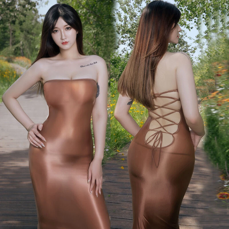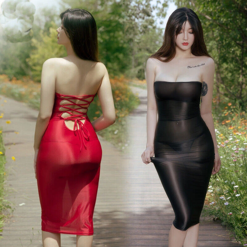 Women's Wet Look Satin Shaping Bodycon Long Skirt Buttocks Sheer Cocktail Dress