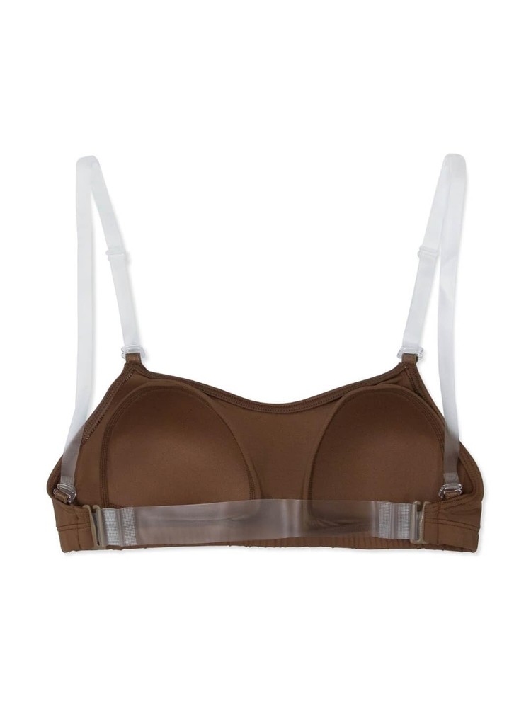 Camisole bra with Bratek sizing 92% Meryl Nylon, 8% Lycra Spandex TPU clear shoulder straps adjust in length and strap position and TPU clear back strap has 2 hook positions on each end for adjustment Sizes XS and S provide support from "A" to "B" cups, and M, L, and XL provides support for "B" to "C" cup customers Moderate scoop front and clear back strap Recommended care: Machine wash cold, delicate cycle and hang dry