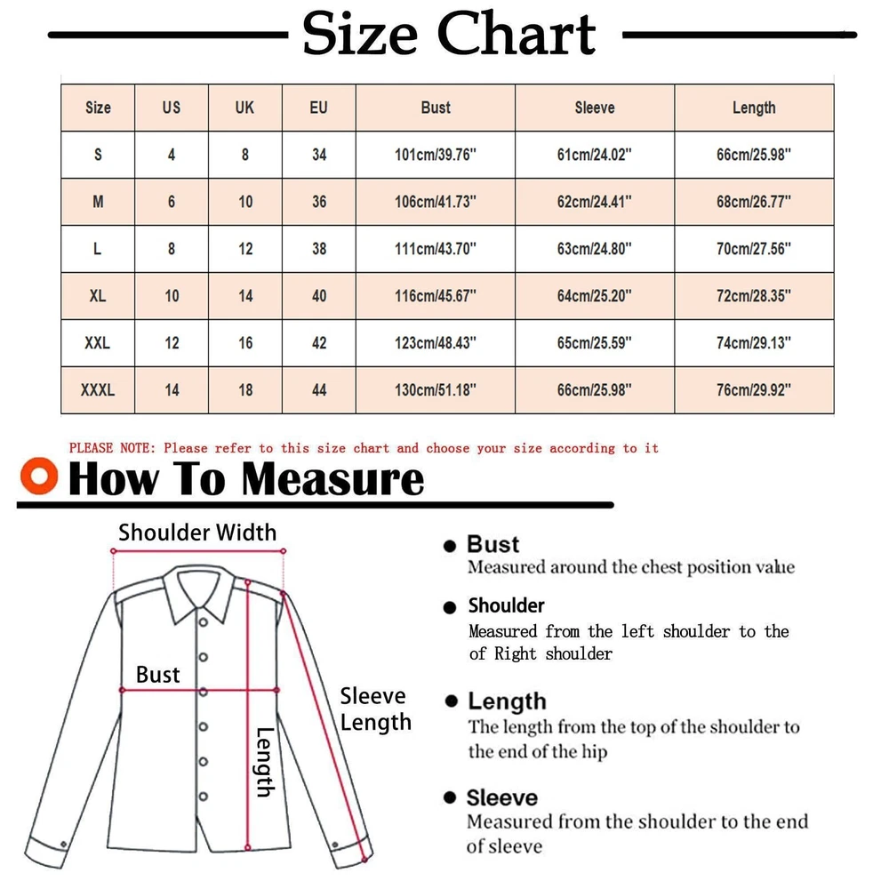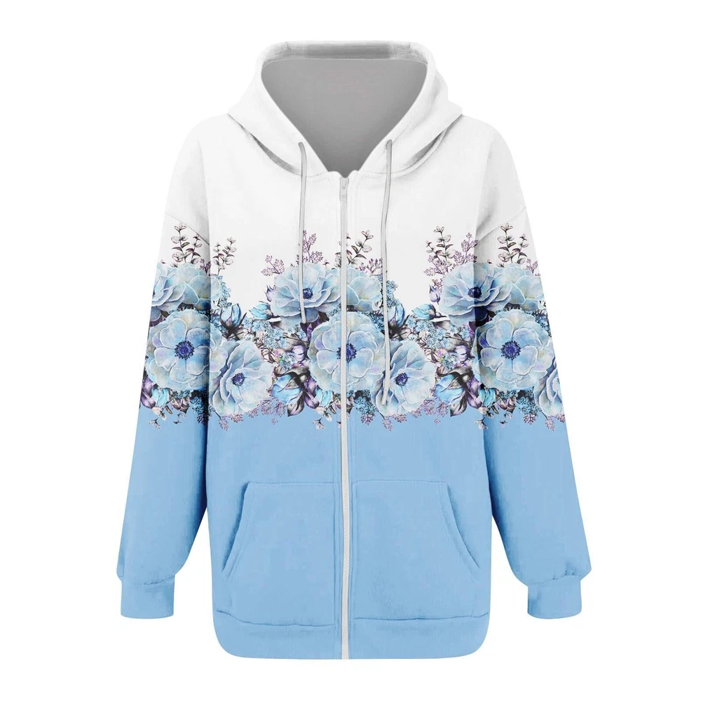 Features: Comfy Material: This womens sweatshirt is made of cotton,polyester and spandex,the material is thick and comfortable,keep you warm in fall and winter :This womens fall fashion 2023 is easy to pair with casual pants, jeans, joggers, shorts, sneaker, casual shoes to creating a fashion and pretty looking in spring, autumn and winter. You can also anything you like inside,like tank top, crop top, vest, etc. Occasion - Suitable for running, playing , dancing, cycling, playing , hiking, walking, exercising, home, daily wear, travel, for fall and winter. Design: Oversized Sweatshirt/ Hooded/drawstring Collar/ Full Zip Up Hoodie/ Gothic / Fleece Jacket/ Ribbed Hem And Cuffs/ Baggy / Crewneck Sweatshirts/ Clothes Wash - Machine washable, hand washes cold, dry flat in shade. Do not bleach. Product Description: Womens Fall Fashion Women's Long Sleeve Floral Print Sweatshirt Long Sleeve Pocket Jacket Zipper Hoodie Coat Material: polyester Color: as the picture shows, (Due to the difference between different monitors, the picture may have slight color difference. please make sure you do not mind before ordering, Thank you!) Package weight: 300g Package size: 30x25x2cm,(Please allow 1-3mm error due to manual measurement. please make sure you do not mind before ordering.) Size US UK EU Bust Shoulder Sleeve Length S 4 8 34 101cm/39.76'' 42cm/16.54'' 61cm/24.02'' 66cm/25.98'' M 6 10 36 106cm/41.73'' 43cm/16.93'' 62cm/24.41'' 68cm/26.77'' L 8 12 38 111cm/43.70'' 44cm/17.32'' 63cm/24.80'' 70cm/27.56'' XL 10 14 40 116cm/45.67'' 45cm/17.72'' 64cm/25.20'' 72cm/28.35'' XXL 12 16 42 123cm/48.43'' 46cm/18.11'' 65cm/25.59'' 74cm/29.13'' XXXL 14 18 44 130cm/51.18'' 47cm/18.50'' 66cm/25.98'' 76cm/29.92'' Size:S US:4 UK:8 EU:34 Bust:101cm/39.76'' Shoulder:42cm/16.54'' Sleeve:61cm/24.02'' Length:66cm/25.98'' Size:M US:6 UK:10 EU:36 Bust:106cm/41.73'' Shoulder:43cm/16.93'' Sleeve:62cm/24.41'' Length:68cm/26.77'' Size:L US:8 UK:12 EU:38 Bust:111cm/43.70'' Shoulder:44cm/17.32'' Sleeve:63cm/24.80'' Length:70cm/27.56'' Size:XL US:10 UK:14 EU:40 Bust:116cm/45.67'' Shoulder:45cm/17.72'' Sleeve:64cm/25.20'' Length:72cm/28.35'' Size:XXL US:12 UK:16 EU:42 Bust:123cm/48.43'' Shoulder:46cm/18.11'' Sleeve:65cm/25.59'' Length:74cm/29.13'' Size:XXXL US:14 UK:18 EU:44 Bust:130cm/51.18'' Shoulder:47cm/18.50'' Sleeve:66cm/25.98'' Length:76cm/29.92''