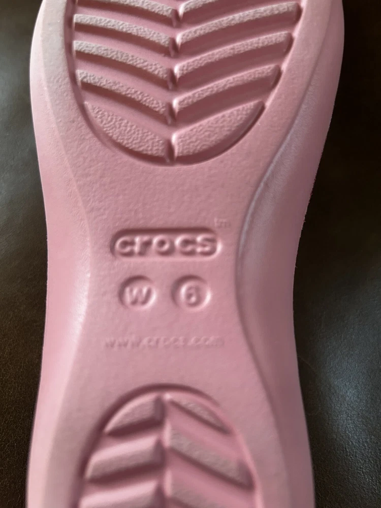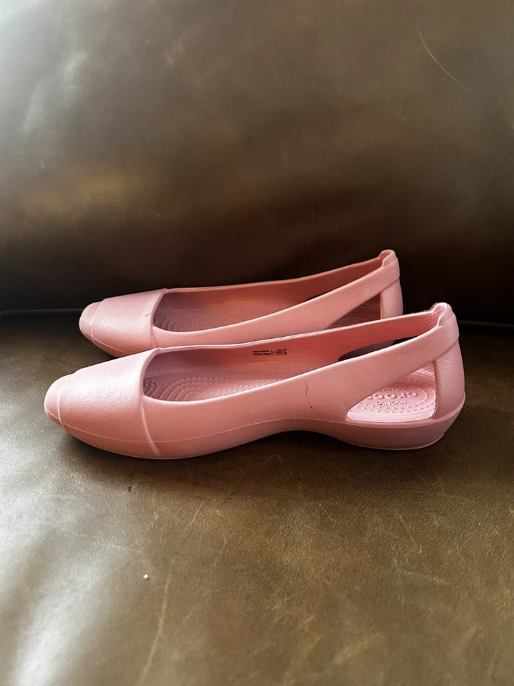 These are women's size 6 Crocs flats in a slip-on loafer style. The shoes feature a round toe shape, flat heel under 1 inch, and a comfortable cushioned design with Crocs' iconic comfort. They are a versatile choice suitable for travel, activewear, casual outings, and workwear. The pink color with a red manufacturer accent adds a touch of style to the classic Crocs design, making them a limited edition item perfect for walking or driving activities in any season.