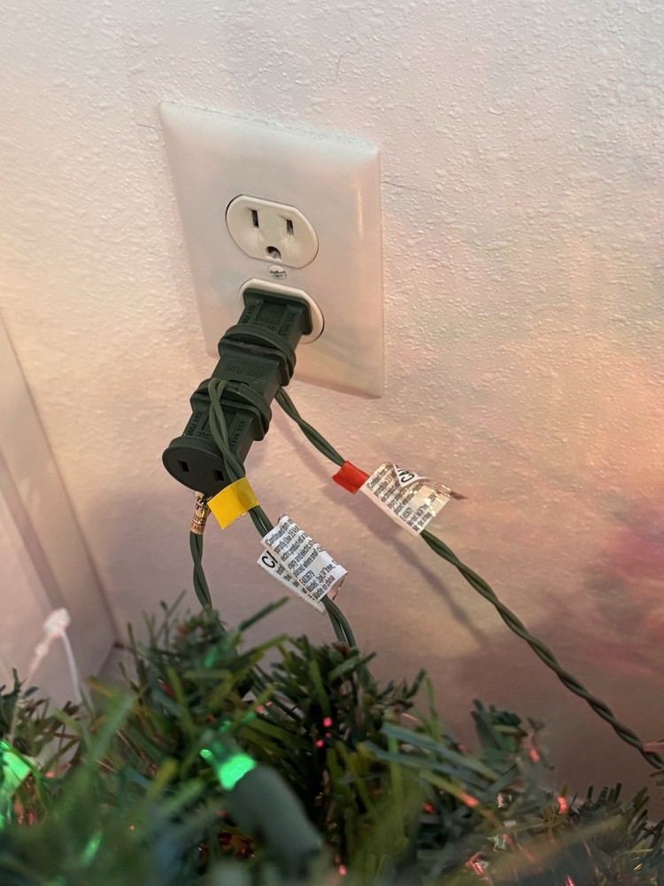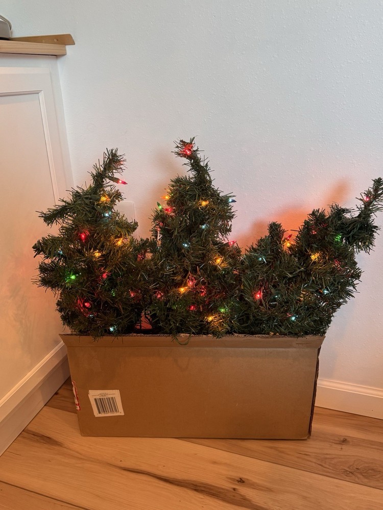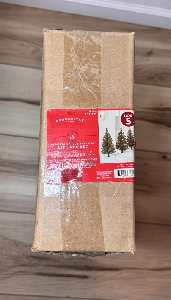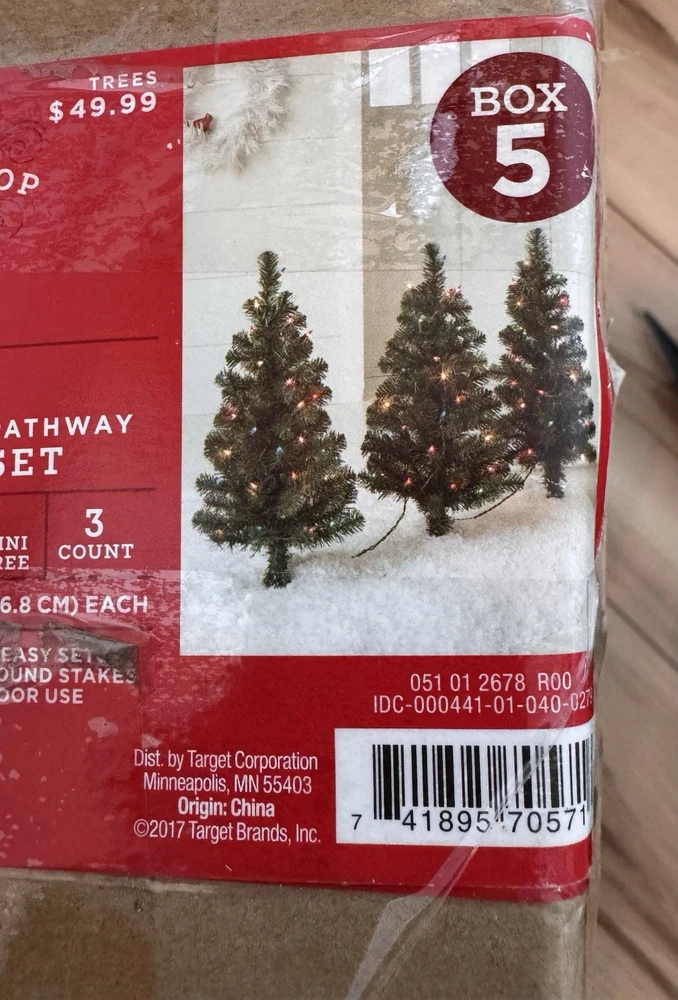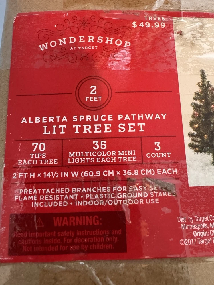 I opened box to test and inspected. Wondershop at Target Alberta Spruce Pathway Lit Tree Set. The set includes three artificial trees, each 2 feet tall x 14.5” wide Each tree has 70 tips and 35 multicolor mini lights. Features include preattached branches for easy setup, plastic ground stakes, and flame-resistant material. The product is suitable for both indoor and outdoor use.