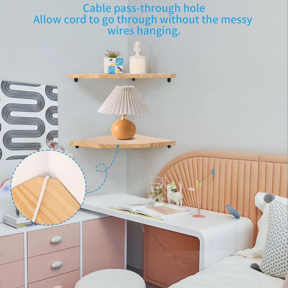 Solid Wood Corner Wall Shelf: These corner wall shelves are designed with natural wood and stainless steel brackets, made of 100% Premium Solid Pine Wood, green and pollution-free. Our sturdy and beautiful corner shelves are suitable for any corner of your room to display your favorite decorative items. Space Saver Floating Corner Shelves: Do you have empty corner wall where you could use some additional storage and organization? Our corner shelf can meet your needs, very useful for adding extra storage space to and reorganize small items in your bedroom, living room, kitchen and more. It will be a great space saver. Efficient Corner Shelves Wall Mount: The corner shelf wall mount is 0.7 inches thick and 12 inches long and can hold 48 pounds. Ideal for displaying photos, collectibles, small plants or other decorative items in your living room, bedroom, study, corridor, stairway corner; It is also a good choice to install it to your kitchen for storing spices and condiments. Large Size And Easy To Install: Each wood corner shelf's size is 12Lx12Wx0.7H inches, more width and more depth than others. Wall mount corner shelves include all hardware and installation instructions, you only need to follow the instructions to complete the installation in a few minutes. Specially designed for 90 degree wall corners only! Get Your Home Organized: Wanna turn bare and empty corner into a useful storage and display space? Would you like to neatly display your family photos or exquisite collectibles in your home or office? We provide you with 2 shelves of the same size to meet your storage and display needs.