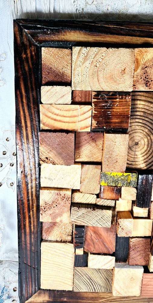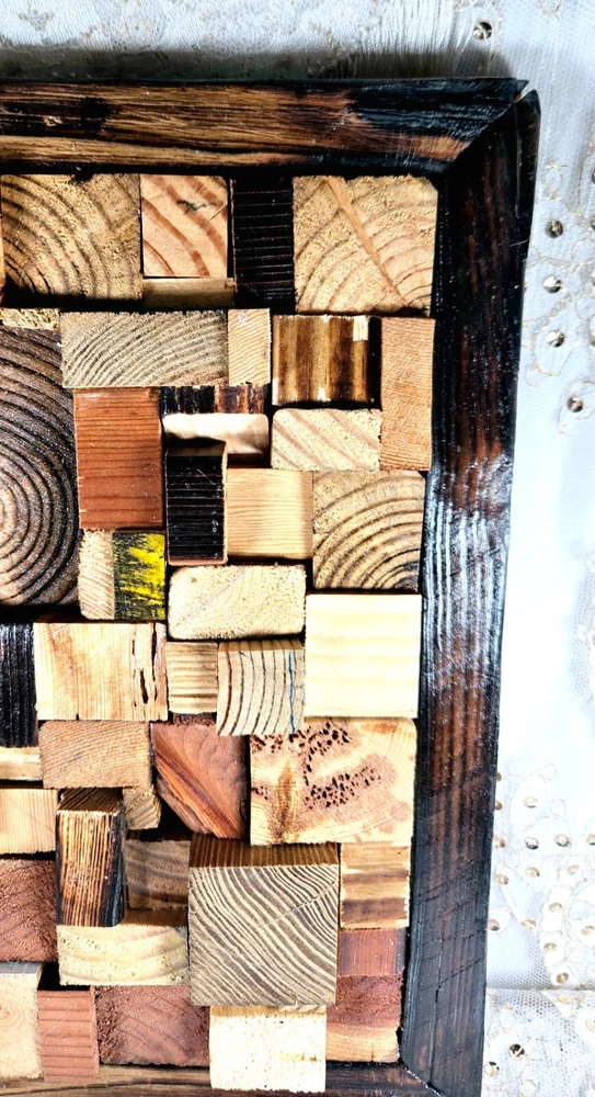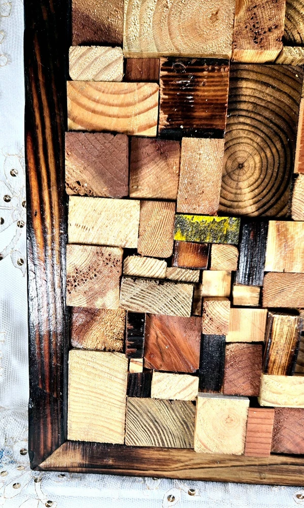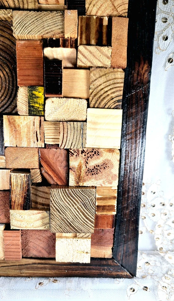 This unique piece of wall art is a beautiful addition to any home. Crafted from recycled wood, the frame measures 12.5"H x 11"L and features a stunning wood mosaic design. The handcrafted aspect of this piece makes it truly special and adds a touch of rustic charm to any room. With its origin in the United States, this wall hanging is a must-have for those who appreciate handmade art. Whether you're looking to decorate your living room, bedroom, or office, this piece is sure to make a statement. H064