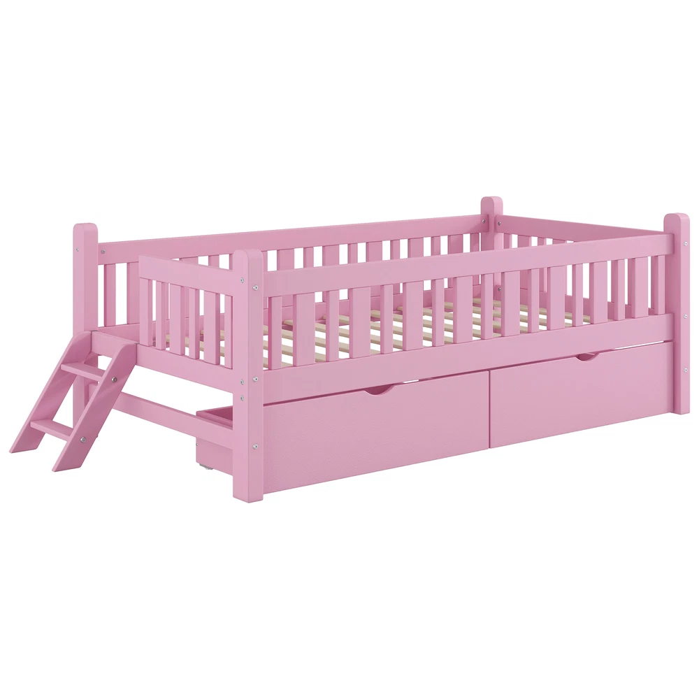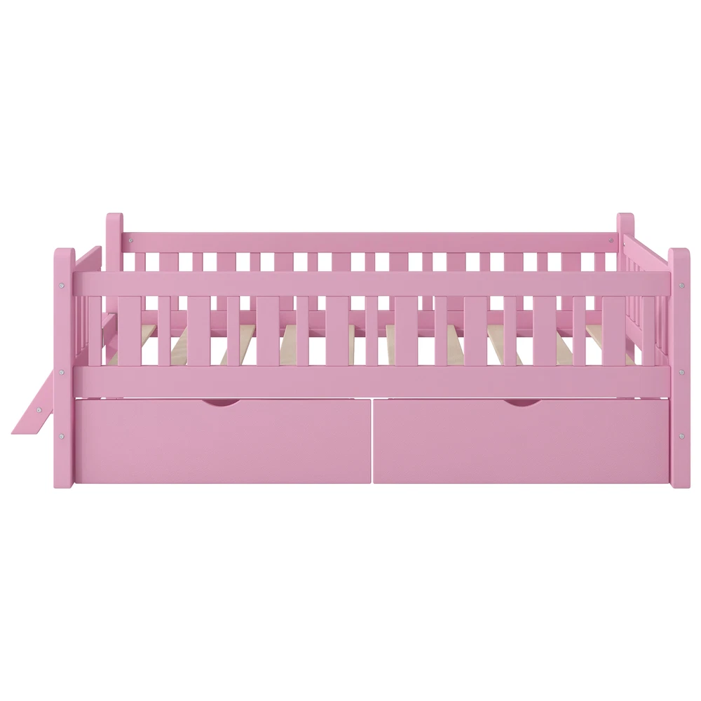 Wood Twin Size Platform Bed Frame with Guardrail 2 Drawers For Kids Girls Pink Features [Semi-enclosed fence] The bed is surrounded by fences, but there is a small opening on the side of the fence, so it is not a completely enclosed space. Children can enter and exit freely through this small opening. [No Box Spring Required] The bed is close to the ground and increase the service life. [Sturdy Construction] Constructed of solid pine wood+MDF, this platform bed features a sturdy high quality solid wood construction for durability and high load capacity, ensuring longevity. [Easy to Assemble] All parts included in your package are indicated clearly. With step-by-step installation manual and per-drilled holes, you can easily assemble this bed individually. [Multiple Storage] Comes with 2 drawers, this platform bed is great for storing your clothes, toys or books. Descriptions Wood Twin Size Platform Bed with Guardrail and 2 Drawers, Pink This bed provides your child with an enclosed play area, perfect for exploring their imagination.The design of the guardrail provides safe guarantee.Constructed of solid pine wood+MDF, this platform bed features a sturdy high quality solid wood construction for durability and high load capacity, ensuring longevity. This daybed comes with 2 Drawers, easy to pull out, and a multi-functional piece of furniture ideal for small living spaces. Description Material Pine Wood+MDF Size Twin Color Pink Numbers of Package 1 Spring Box No need Assembly Required Yes Origin Vietnam Dimensions Overall Product Dimension 77.6''L x 41.6''W x 28''H Twin Bed 75.6'' x 39.3'' Total Height 28'' Recommend Mattress Thickness of Bed 6-8'' Overall Product Weight 84.4lbs Weight Capacity 400lbs
