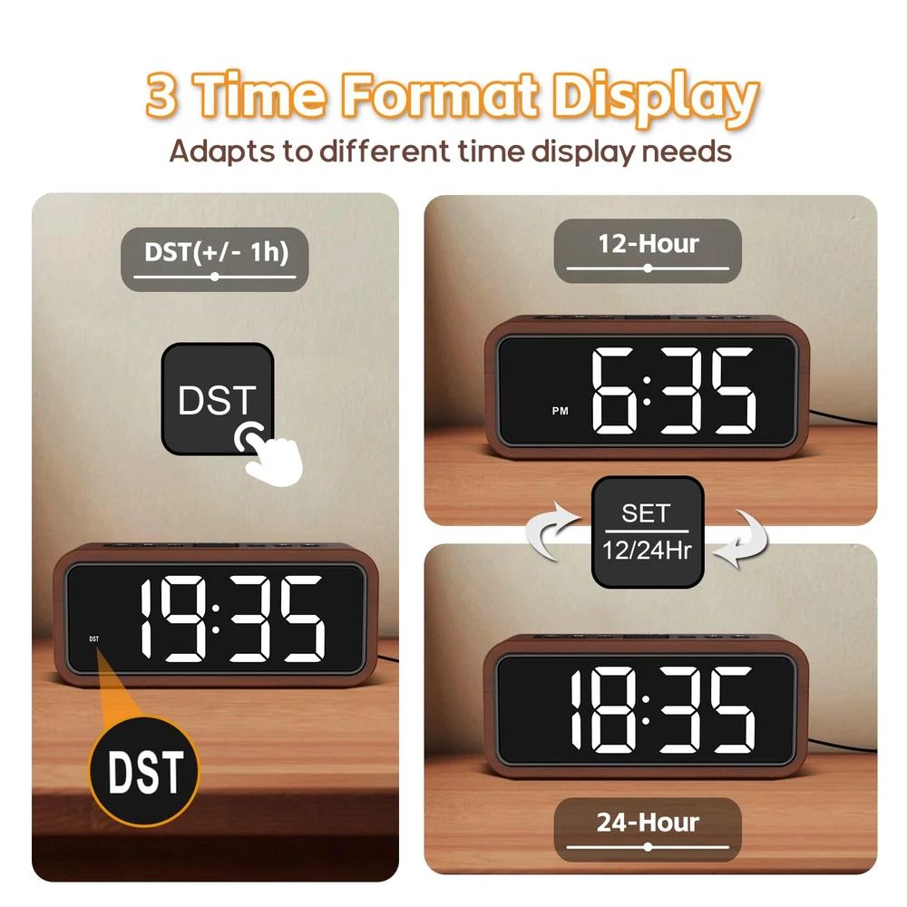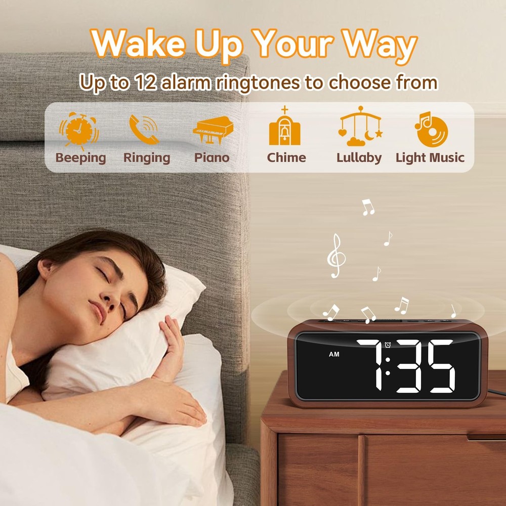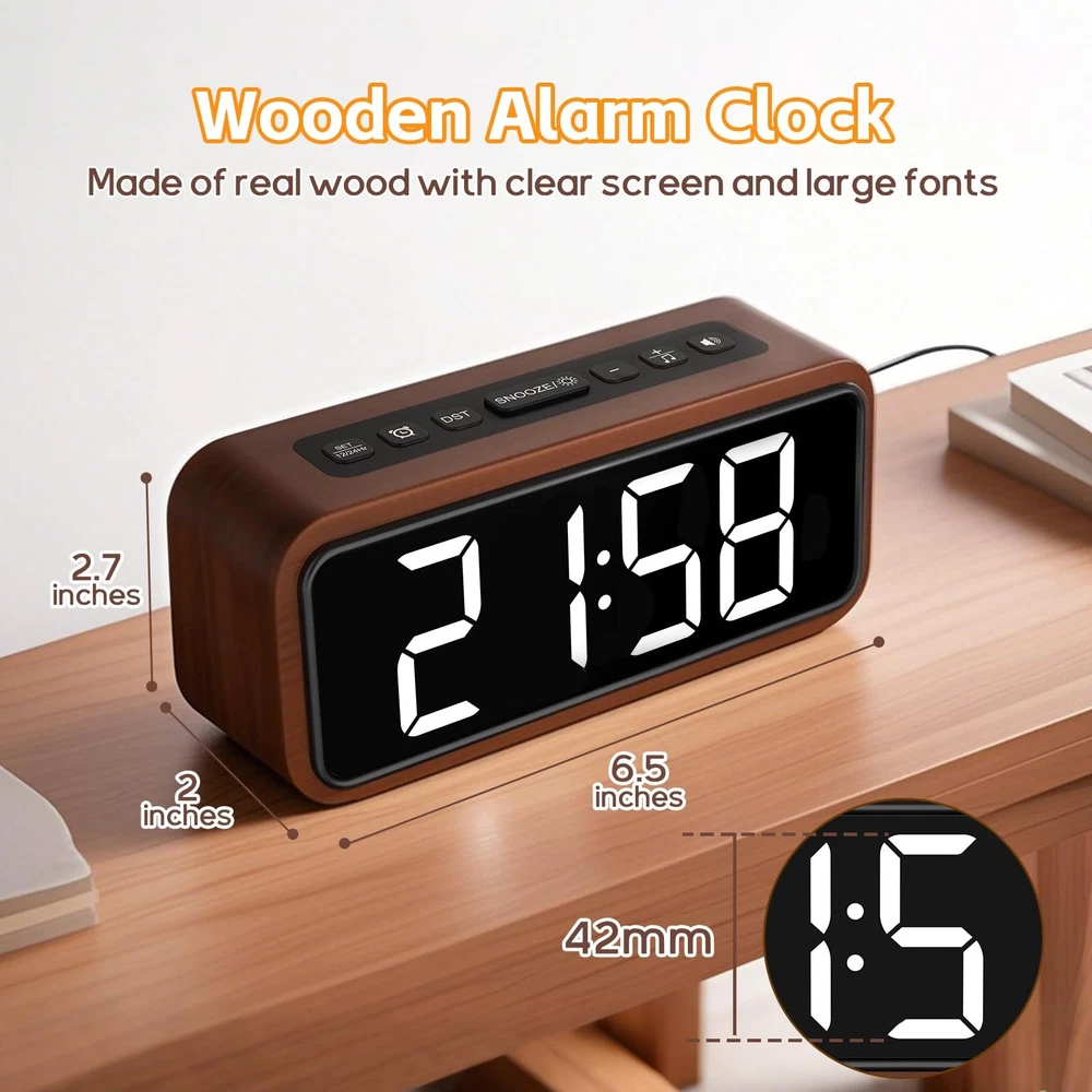 This solid wood alarm clock seamlessly blends vintage design with modern functionality. Carefully crafted, its wooden exterior showcases natural textures and warm tones, making it a perfect match for a variety of wooden home decor. Wooden Alarm Clock: A solid wood-crafted alarm clock with timeless vintage charm, seamlessly matching your wooden home decor. Its elegant wooden design adorns the bedside table, making it a beautiful decoration for bedroom and office. Super Loud Alarm: This wooden clock comes with an alarm sound that is amazingly loud. No matter if you're someone who sleeps very deeply or you simply require a really strong wake-up to start your day, it can fulfill this need extremely well and effectively prevent you from oversleeping. 12 Alram Tones: Choose from 12 different ringtone options to customize your wake-up experience. From soothing melodies to energetic tunes, there's something for everyone to start the day on a positive note. Adjustable Brightness: The wooden alarm clock has 4 levels + off adjustable brightness. You can easily adjust the display according to various light conditions. Whether it's bright in the morning or dark at night, the time is always clearly shown, so you don't have to struggle to see it. Plug-in Alarm Clock: This alarm clock operates by being plugged in. It comes with an adapter and a data cable, ensuring a stable power supply. Manual DST Adjustment Feature - Simply hold down the DST button to move the alarm time forward by an hour when Daylight Saving Time starts, and backward by an hour when it ends. This convenient feature keeps your clock in sync with the changing seasons effortlessly.