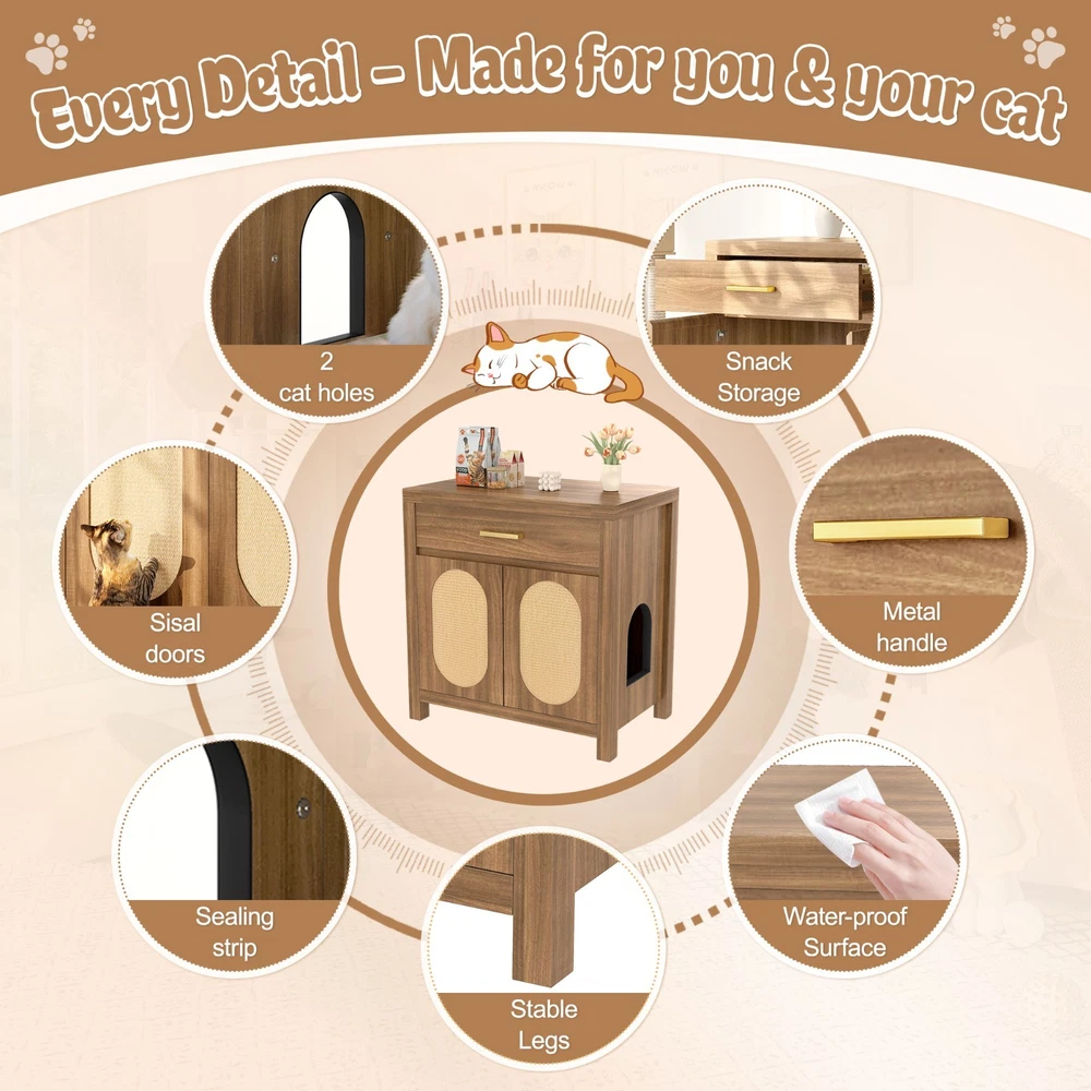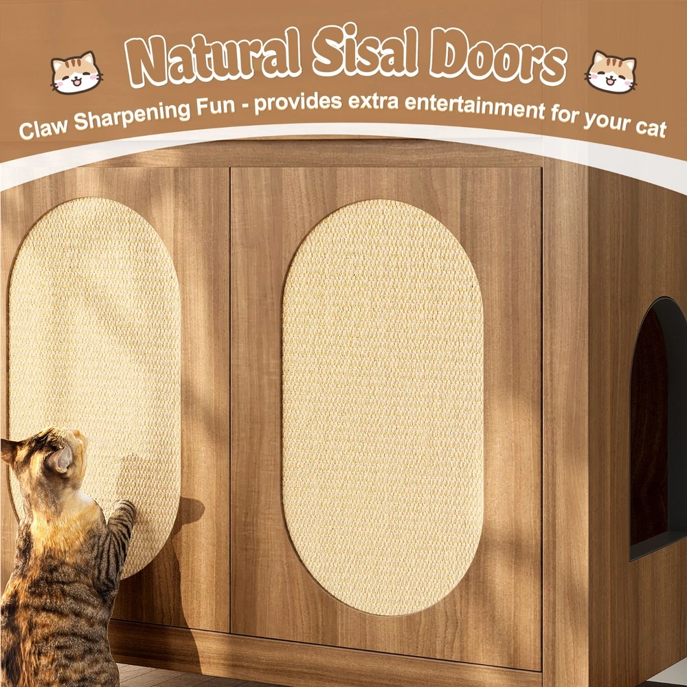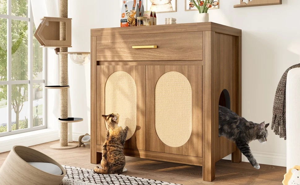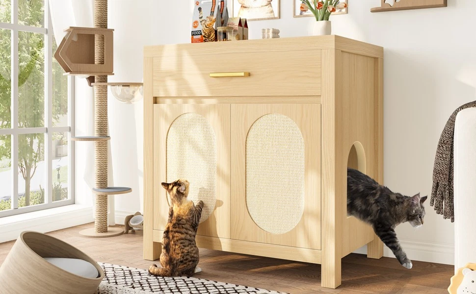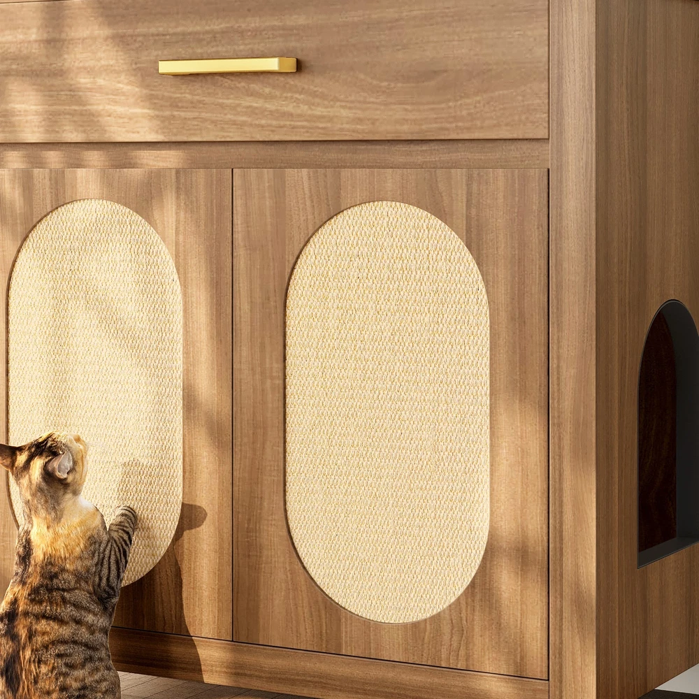 Product Feature Multi-Purpose Pet Furniture: This versatile cabinet serves as both a litter box enclosure and a cozy cat house. With its stylish design, it also functions beautifully as a side table or coffee table next to your sofa. Place decorative plants, books, or ornaments on the top to enhance the elegance of your living space. Spacious Storage: Features a spacious top drawer to neatly organize cat essentials like litter scoop, trash bags, toys, grooming tools, or treats—bringing a cleaner and more organized home environment. Premium Cat Scratch Pads: The cabinet doors are fitted with natural sisal scratch pads that keep your cat safe while allowing them to satisfy their scratching instincts, protecting your furniture from damage. Expandable Two-Room Design: Buy two units to create a connected cat suite! Side pass-through holes allow cats to freely move between two cabinets—use one for the litter box and the other as a cozy resting space. Sealing Strip: Sealing strip reinforces the structure, reduces gaps, and protects cats from scratches. Self-adhesive for adjustable placement. Fit Most Cats : With an internal usable size of 28.34"x18.97"x22.83"H, this furniture fits most cats and litter boxes, gives your cat the space to hide and poop at ease. The door can conceal the litter box inside, reducing odor while also allowing easy access for cleaning. Product Description Features Net Weight 64.32lbs Weight Capacity 176lbs Material MDF Assembly Time 1hour