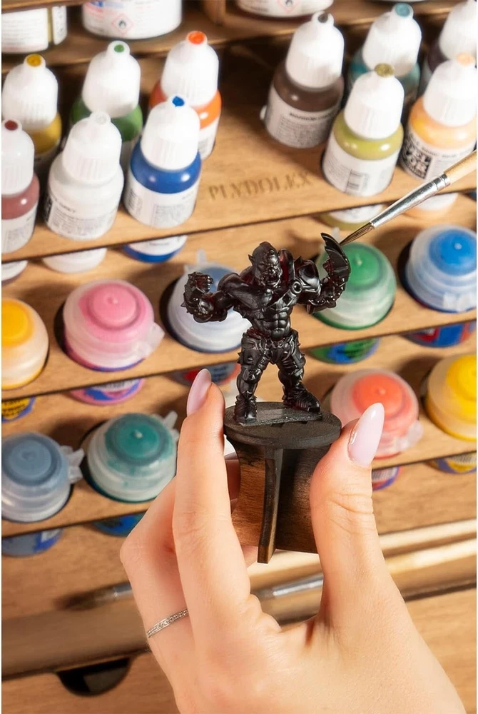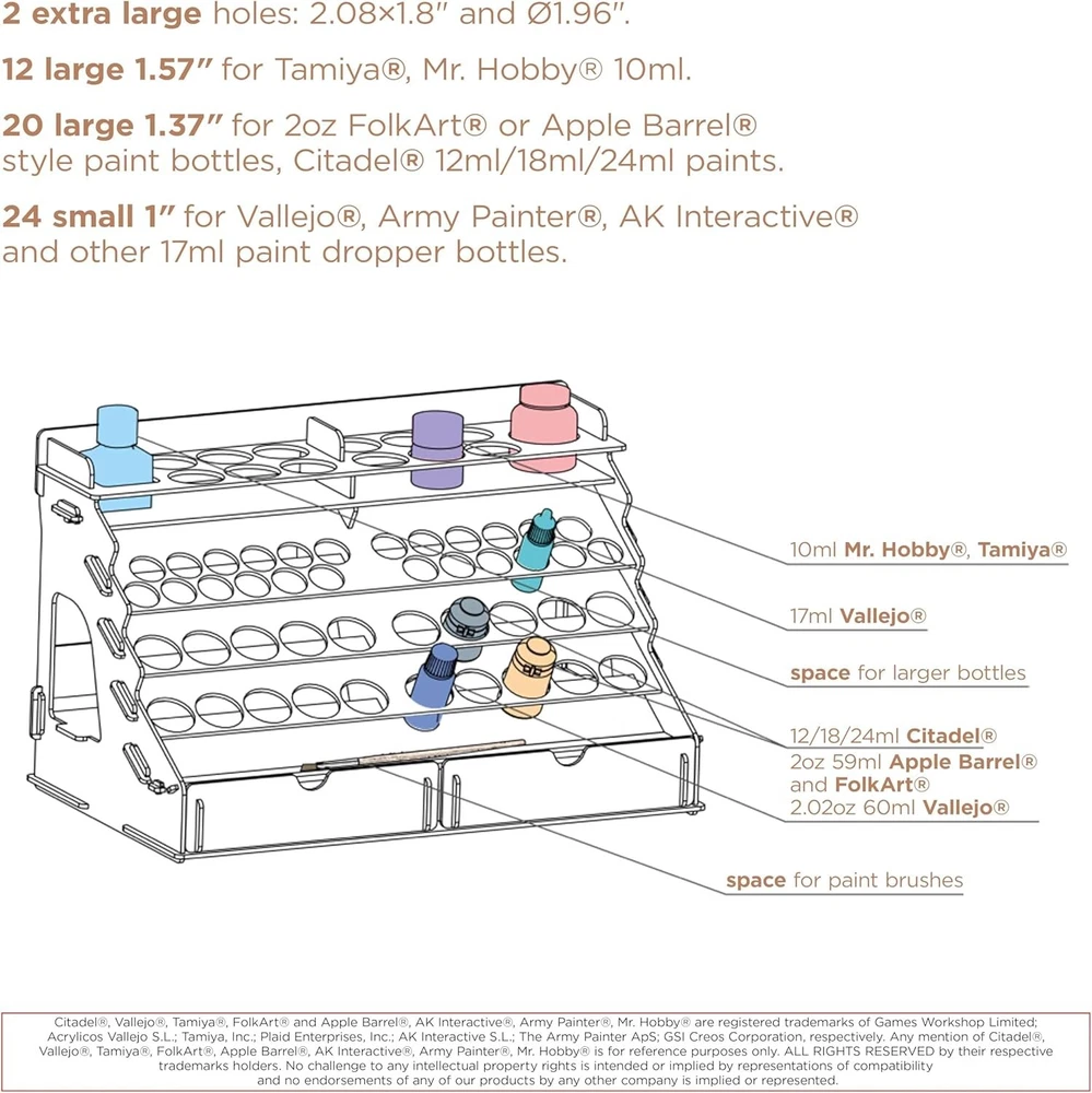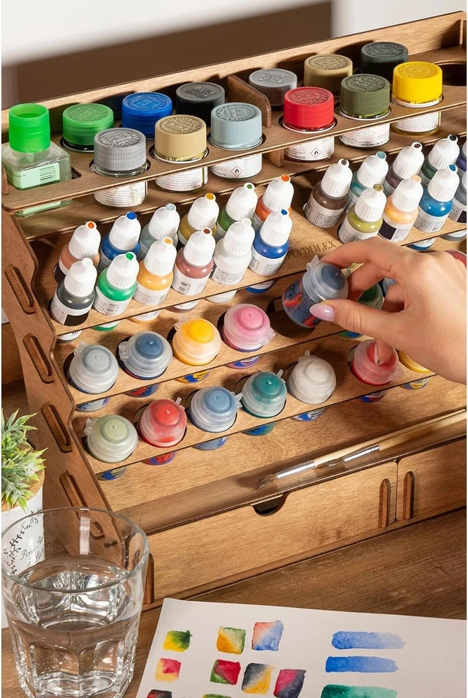 Wooden Craft Paint Storage Rack with 58 Holes for Paint Bottles - Hand Craft Paint Holder Rack with 4 Miniature Stands and Removable Upper Shelf - Paint Organizer for Miniature Paint Set Paint accessories – This Vallejo paint supply storage organizer is made from sturdy plywood without plastic or acrylic - only natural materials. Also, army painter paint rack is very capacious, we designed 2 extra large holes, 12 holes by " diameter, 20 holes by " diameter, and 24 small holes by 1" diameter. On the backside stand of the wooden craft paint storage rack, you can place bottles of any extraordinary diameter. Removable upper shelf – The unique construction of Vallejo paint storage allows choosing your use case. Thanks to the removable upper shelf of the paint storage organizer you can store you can either store more bottles of paint or put on the shelf ready painted miniatures and paint bottles with a larger diameter that do not fit in the paint station's holes. Easy to assemble – In the package you will find details of Vallejo paint organizer that should be assembled and step-by-step instructions. Our advantage is that the wooden craft paint storage rack is assembled without glue, and wooden fasteners are included in the set, so the finished construction of Citadel paint rack will be sturdy and durable. We are also convinced that the process of assembling Citadel paint holders and organizers can also be a fascinating DIY activity! Complete set – Our Citadel paint rack has two drawers for a wide range of art tools, one of which has a removable 8-part divider! It's incredibly convenient cause you can organize the space of craft paint holder rack to your own taste. Also, the backside of paint rack organizer isn't one-piece, but has a stand for large paint bottles that do not fit into the main holes. But that's not all, to make it easier for you to paint the miniatures, the kit includes 4 special miniature stands! Convenient design – paint station produced for miniature painting set and other tools. In our paint holder, you can store Citadel paints, Vallejo paints, Apple Barrel paints, FolkArt paints, Tamiya paints, and others. The laconic design of the army painter paint rack organizer decorates your workplace and makes it more organized. If you like working with paints, you will appreciate the necessity of miniature paint rack. Also, our army painter paint rack organizer will be a great gift!
