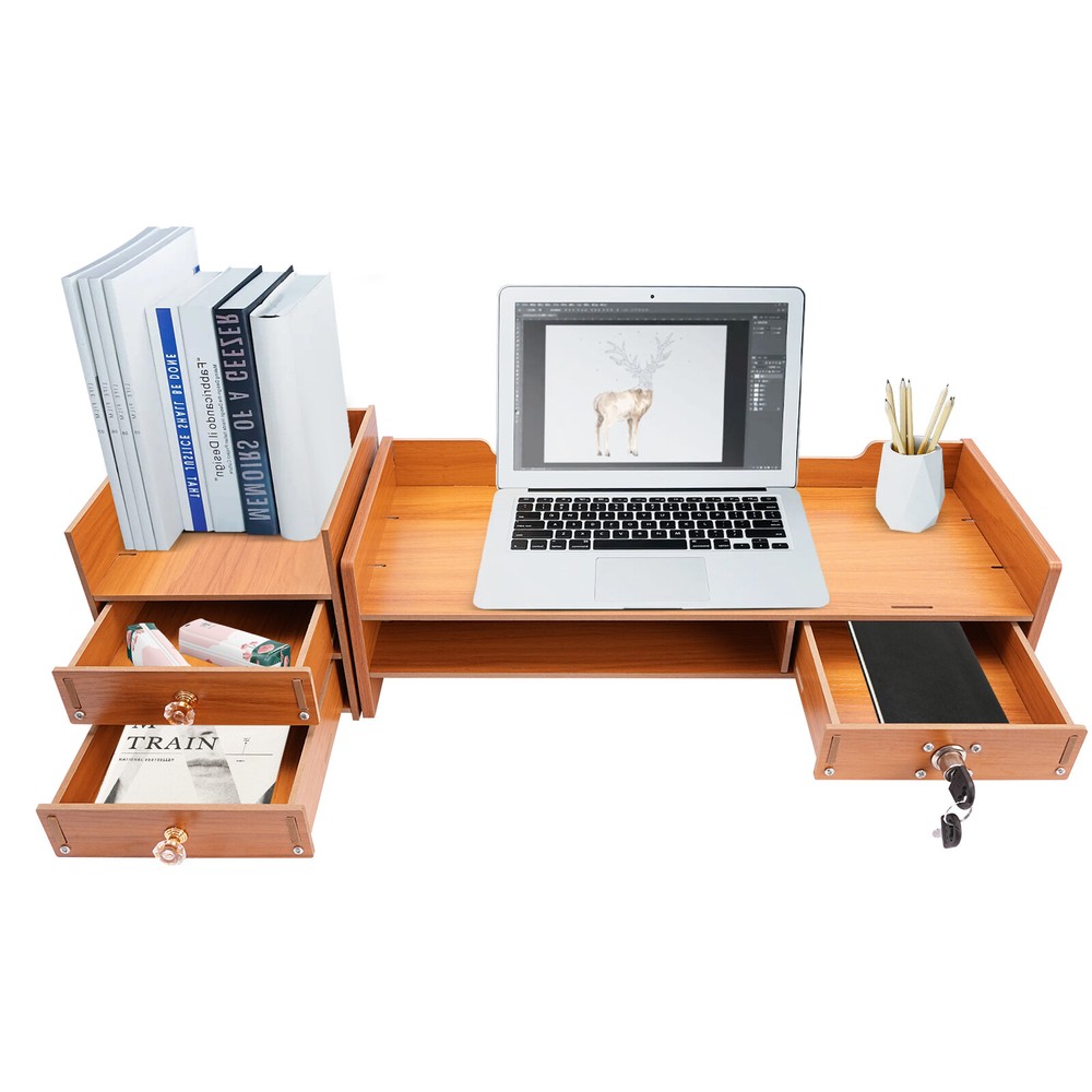 Description This computer monitor stand is not only durable but is also extremely space-efficient. It can stabilize your monitor and organize your office supplies efficiently, taking the clutter out of your desktop, and providing a cost-effective solution to your needs. We encourage you to adopt this storage option for a tidy, high-value office environment. Key Features Selected Material: High-quality MDF makes this product wear-resistant, corrosion-resistant, anti-rust, strong, durable, and not easy to deform, so it can be used for a long time. Ample Storage Capacity: It consists of 3 drawers (one with a lock), a large compartment, and two top platforms. You can store pens, notebooks, paper clips, and other small items in the drawers, put valuables or information in the lockable drawer, Wooden Desk Organizer with Drawers Office Supplies Computer Desktop Tabletop Description This computer monitor stand is not only durable but is also extremely space-efficient. It can stabilize your monitor and organize your office supplies efficiently, taking the clutter out of your desktop, and providing a cost-effective solution to your needs. We encourage you to adopt this storage option for a tidy, high-value office environment. Key Features Selected Material : High-quality MDF makes this product wear-resistant, corrosion-resistant, anti-rust, strong, durable, and not easy to deform, so it can be used for a long time. Ample Storage Capacity : It consists of 3 drawers (one with a lock), a large compartment, and two top platforms. You can store pens, notebooks, paper clips, and other small items in the drawers, put valuables or information in the lockable drawer, tuck your keyboard and mouse neatly underneath, and place your computer, teacups, and other frequently used items on the countertop for added convenience. Space-Saving : The product can be placed on a tabletop, making the most of vertical space, saving countertop space, and keeping your office cleaner and tidier. Ergonomic Comfort : This monitor stand raises your computer screen to your ideal viewing height, effectively improves posture, relieves your shoulders, neck, and eye fatigue, and keeps you comfortable while you work. Elegant Appearance : It adopts a pleasing wood color and rectangular shape to present a simple but eye-catching outlook, which can match most decorating styles and color themes, suitable for most use scenarios. Simple Installation : The simple structure, pre-drilled holes, complete accessories, and detailed installation diagram allow you to complete the installation and start using it in a short period. In addition, the side cabinet can be placed left or right, providing you with more installation flexibility. Effortless Cleaning : With its simple construction and smooth surface, you can easily wipe off surface dust with a damp rag. Ideal Gift : Thanks to its functionality and beauty, you can give it to your friends as a housewarming, Christmas, birthday, anniversary, or Thanksgiving gift! Customer Service : We aim to provide quality products and services. If you have any problems, please feel free to contact us. We will reply and solve the problem for you as soon as possible. Details Phone Holder : It is convenient for you to place your mobile phone for entertainment while eating or resting. 2 Keys : They lock a drawer and one of them can also be used as a spare key to prevent loss. Raised Base : It promotes air circulation and makes it easier for you to clean the bottom. Heightened Guardrail : The top guardrail can effectively prevent items from falling off. Open Compartments : They make it easy for you to identify and reach items in time. Round Handles : They are convenient for you to push and pull the drawers. Application It is suitable for study, office, and desk for storing computer monitors, files, notebooks, and other office supplies. Specifications Color: Wood Material: MDF Shape: Rectangle Style: Modern Assembly Required: Yes Mounting Type: Tabletop Stand Total Load-bearing Capacity: 5kg/11.02lbs Side Cabinet Size(L*H): 17.5*16.5cm/6.9*6.5in Computer Monitor Stand Szie: 48*20*13.5cm/18.9*7.9*5.3in Overall Product Length(Stand+Cabinet): 65.5cm/25.8in Package Size: 52.5*21*6cm/20.67*8.27*2.36in Gross Weight: 2.87kg/6.33lbs Net Weight: 2.7kg/5.95lbs Package Included 1* Computer Monitor Stand 2* Keys 1* Phone Holder 1* English Installation Diagram Other Accessories for Installation Notes Please check the size carefully before ordering. Please note that decorations, computers, and other items shown in the picture are not included in the product. Please allow the slight color difference caused by the shooting light and 1-3 cm error due to manual measurement, and make sure you do not mind before ordering. Payment Delivery details Terms of sales About us Contact us Payment We accept ebay payment 。 Fees such as import duties, taxes are not included in the item price or shipping costs. These charges are the buyer's responsibility. Delivery details Shipping: 2-9 working days to: USA Terms of sales We maintain high standards of excellence and strive for hundred percent customer satisfaction. Feedback is very important to us. We hope that you contact us immediately before you give neutral or negative feedback, so that we can address your concerns. It is impossible to address issues if we do not know about them! About us Your satis faction is our ultimate goal. We work hard to earn your trust and future business. Our certified technicians have tested each item before shipping. The unit comes with 1 year limited warranty on all manufacturing defects. a) If you receive a defective item, you may return it or ask for a discount. Please contact us within 14 days after you receive the package. b) What you returned must be intact and in its original packaging as re? u. Customer is responsible for shipping costs of the returned item. c) We will cover the cost of shipping back t with the shipping rate indicated in the registration p