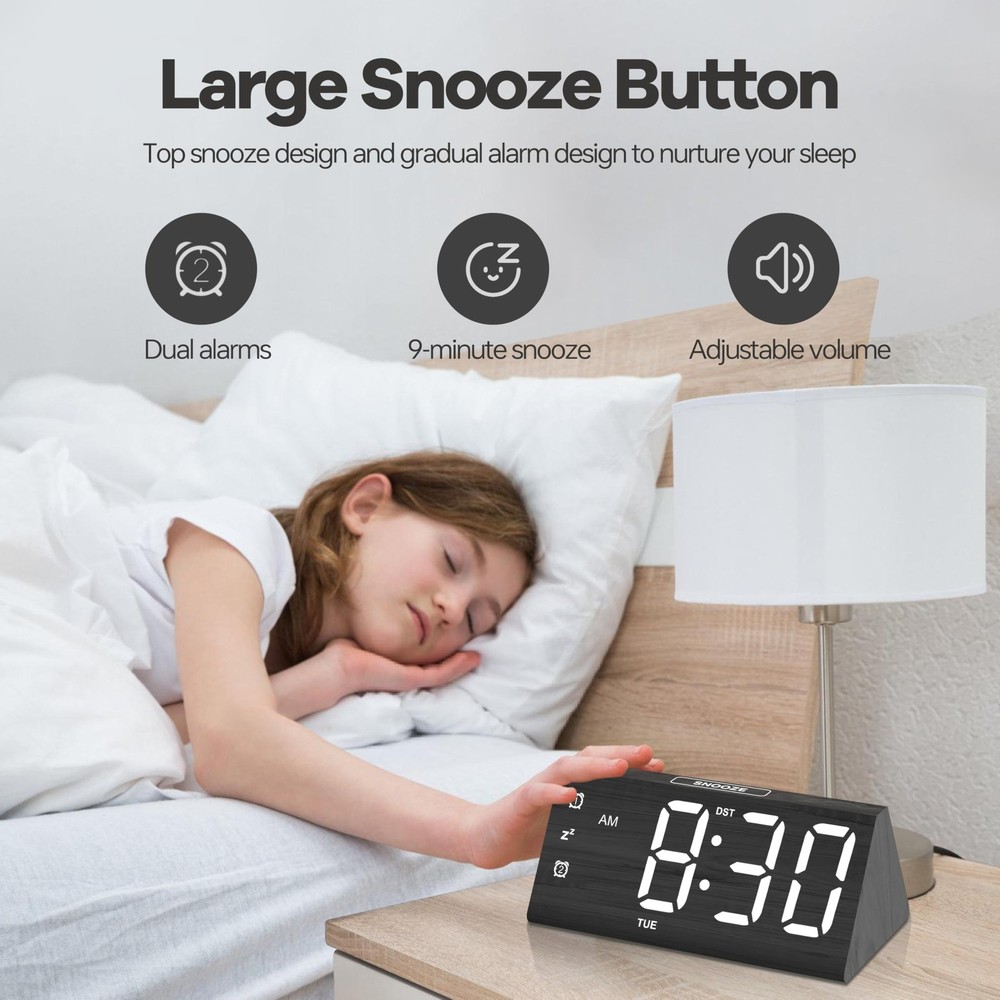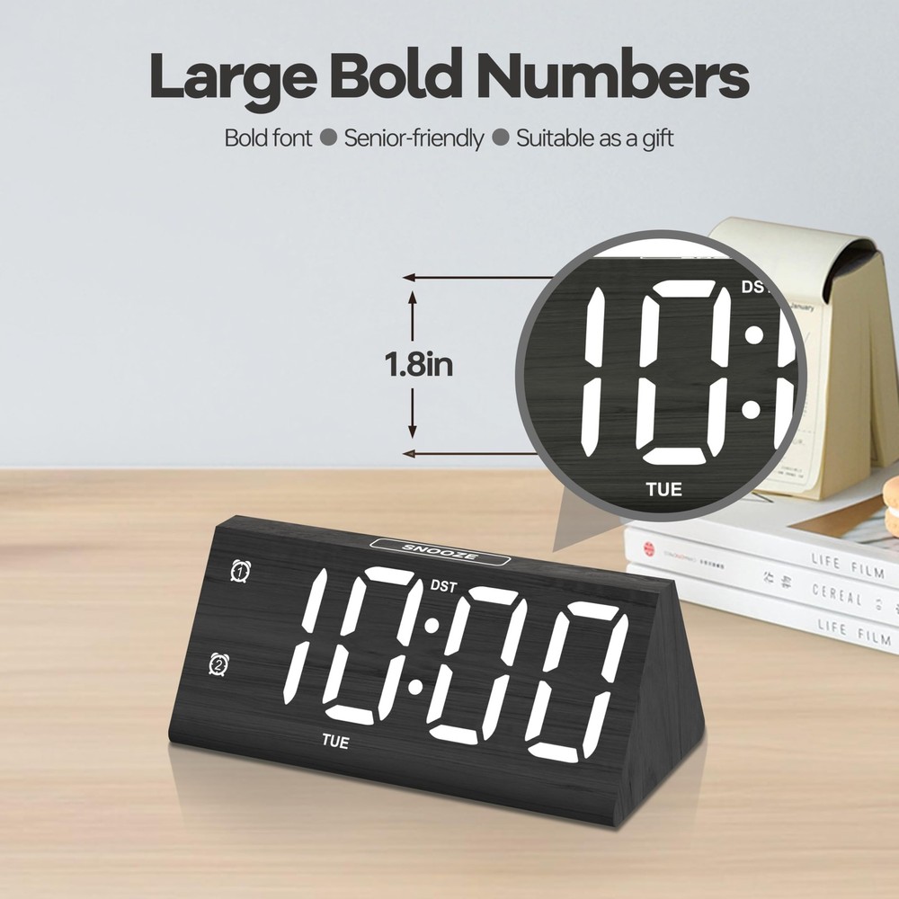 Absolutely love this wooden digital alarm clock! The large, bold digits are super easy to read, even from across the room, which is perfect for my aging eyes. The USB-C power means no more scrambling for batteries, and the dual alarm is a game-changer—I use one for me and one to remind my partner. The weekday-only mode is genius for workdays. Stylish wood finish fits perfectly on my nightstand. A must-have for anyone who values function and design!