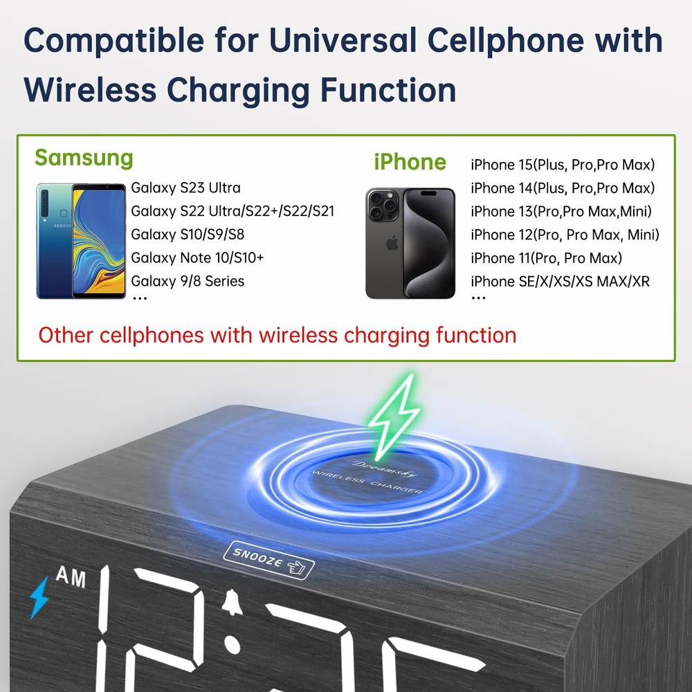 10W Fast Wireless Charger: this wireless charing alarm clock support fast charging and charges universal cellphones with wireless charging which is really handy and space saving while keeps your bedside nightstand neat and clean. 10W Fast Wireless Charger: this wireless charing alarm clock support fast charging and charges universal cellphones with wireless charging in high efficiency way without overheating, which is really handy and space saving while keeps your bedside nightstand neat and clean. Wood Alarm Clock with Large Numbers: the 1.8 inches big digits on the 6.5 inches electric clock are easy to see without glasses. Two steps setting makes the wood clock very easy to setup, no reset hassle for daylight saving time with manual DST. 5 Level Adjustable Bightness with OFF Display: the dimmable alarm clock has 5 level brightness dimmer with OFF mode so you can dim display brightness per your need, no glaring light for bedside use. Extra USB Charging Port: the wireless charger clock also comes with an extra USB ports to charge other electronic devices which is a great handy addtion for bedroom, livign room, office 5 Level Volume Control with Battery Backup Alarm: the alarm volume is adjustable to hig or low level so it can serve as a loud alarm clock for heavy sleepers adults and won't blast you awake. Backup battery function will trigger the alarm during power cut, no worry about oversleep. Alarm lasts for 2 minutes and just tap the snooze button on the top for extra 9 mins sleep. Plug In Alarm Clock: the electric desk clock runs on electricity and is powered by AC adapter. Batteries (not included) just store the clock setting and trigger the alarm during power outage but won't light up the clock display. 5V/2.1A power adapter is supplied. Decent and Stylish Gifts: consider its futuristic modern look and the easy to program function with the fast wireless docking station, this wooden digital clock is perfect for room décor and an elegant small gifts for Christmas, birthday, back to school and New Year.