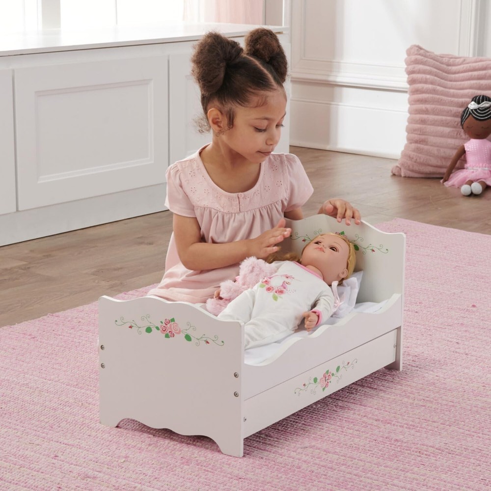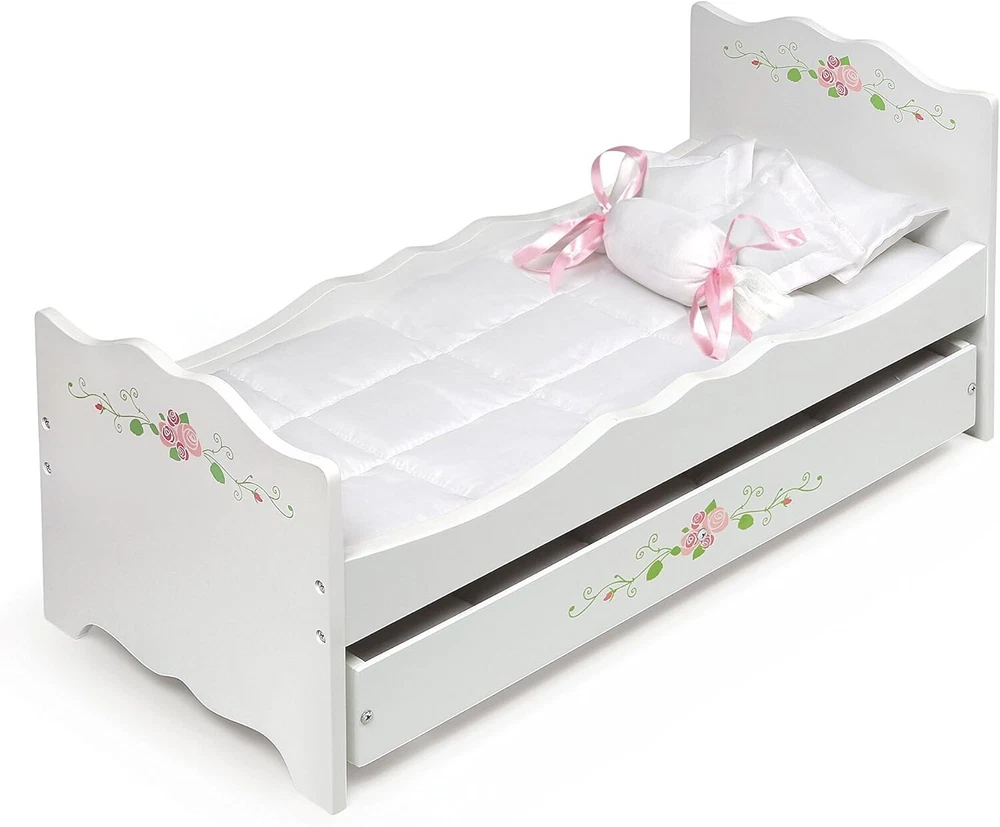 This elegant trundle bed is sleepover-ready for your doll and her closest doll friend Includes two deluxe padded mats and four pillows Fancy scalloped panels and pretty floral detailing For all dolls up to 20 inches, which includes popular 14.5, 15, and 18 inch character dolls Overall dimensions: 22.25 inches L x 11.25 inches W x 11.5 inches H
