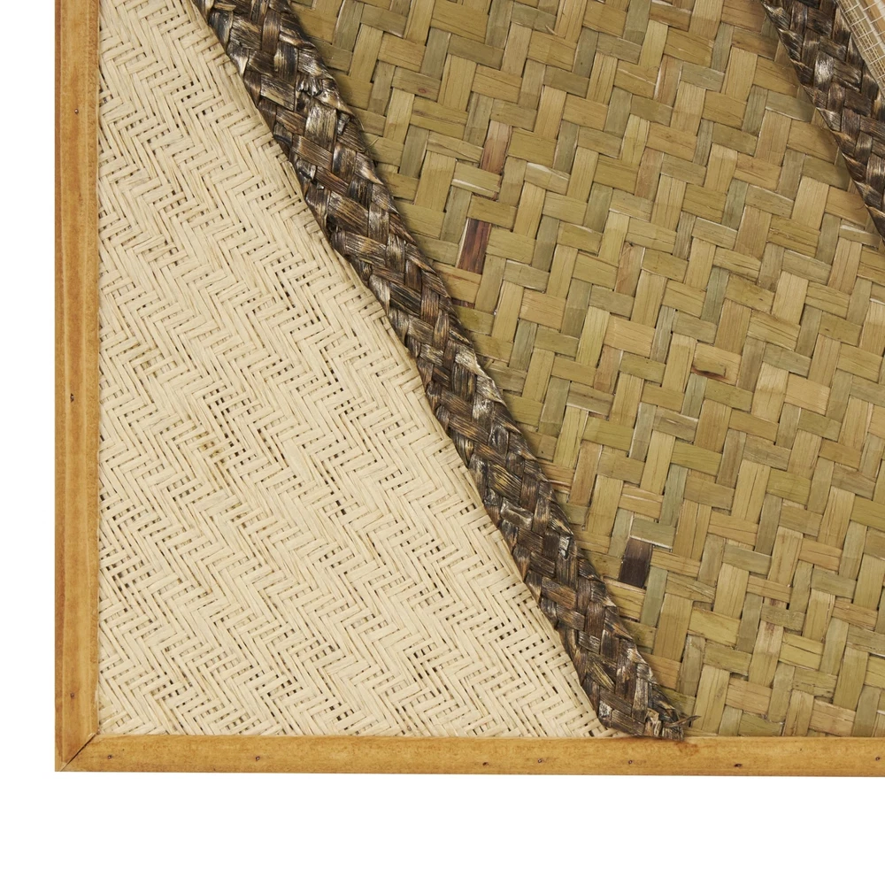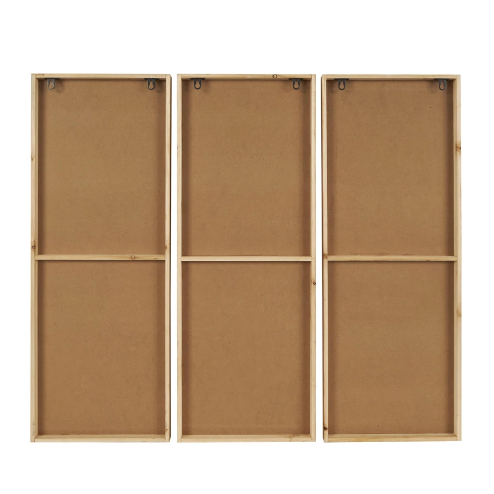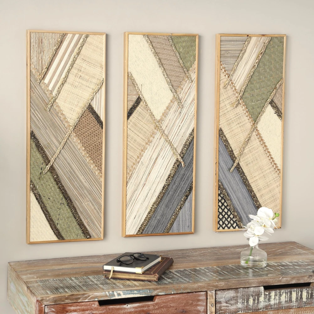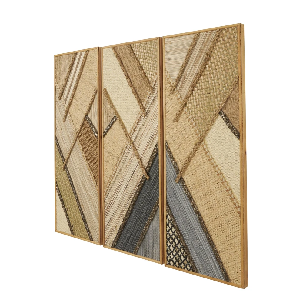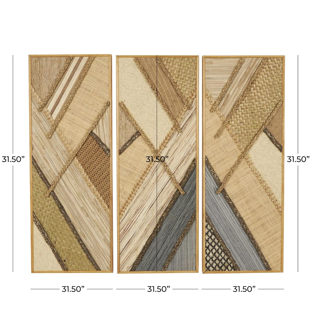 Each piece in this bohemian set of 3 room wall decors is crafted by blending natural and engineered materials to ensure both sturdiness and artistic touch. Textured brown wall art set for the living room offers a dynamic rectangular shape that effortlessly enhances your home decor with contemporary design and bohemian flair. Wipe clean with a dry cloth. This geometric set of 3 wall sculptures can be arranged together on your wall to create an eye-catching focal point in your living space or hallway. This item ships in 1 carton. Due to the handmade nature of this item, no two will be alike, there will be slight differences in shape, size, and color. Can be hung horizontally using the keyholes; nails and screws not included. Suitable for indoor use only. This item ships fully assembled in one piece. This brown colored mdf wall sculptures comes as a set of 3. Bohemian style. BOHEMIAN DECOR FOR WALL: Designed with a free-spirited charm where vibrant hues, eye-catching patterns, and whimsical accents transform your space and showcase your personality WOODEN WALL HOME DECOR: This brown home wall decor set is crafted from reed, MDF and pine, combining natural elements with modern materials for an authentic touch BROWN AND GRAY WALL ART SET FOR LIVING ROOM: Rectangle decor set for wall showcases a warm, earthy brown and black tone with a textured finish, exuding a rustic bohemian charm GEOMETRIC RECTANGLE ROOM WALL DECOR: The captivating geometric design of this wood set of 3 wall decors incorporates various textures and materials, creating a visually intriguing composition 3 LARGE SIZE WALL ROOM DECOR: Each brown wooden wall decor measures 11.95L x 1.5W x 31.5H , 11.95L x 1.5W x 31.5H, 11.95L x 1.5W x 31.5H inches, and collectively weighs 4.875 lbs