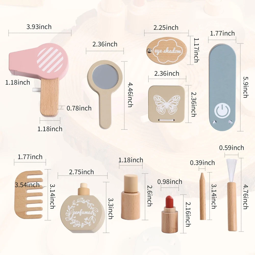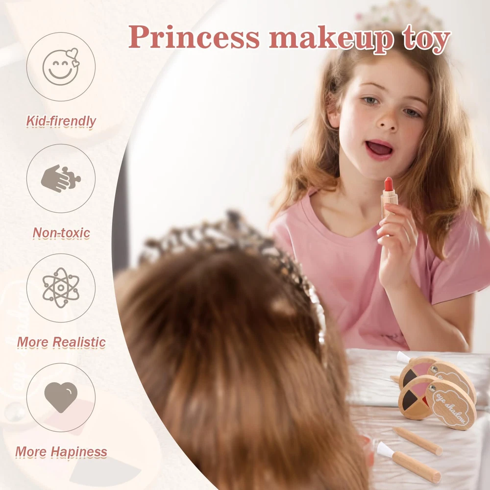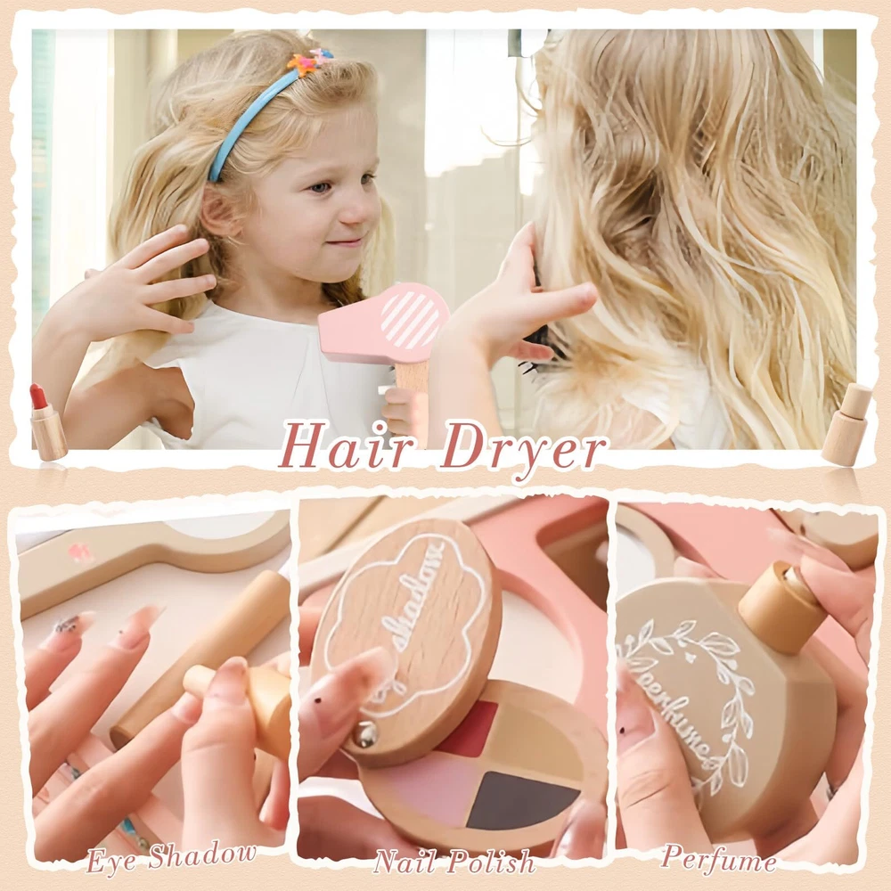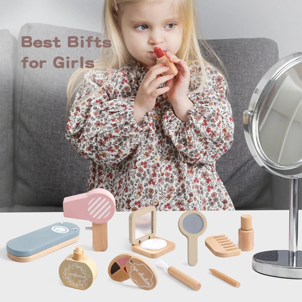 BEAUTY SALON GAME: wooden pretend makeup playset is a great role-playing toy for your little princess to have immersive fun. Every piece is designed to fit a child's size, enjoy parent-child time. Rich Accessories: Girls love to imitate their mom in makeup. This is the 2 in 1 play set, including mirror, comb, hair dryer, curling iron, eyeshadow palette, nail polish, face powder, lipstick, makeup brush, eyeliner and perfume, storage bag 12 pieces in total. Premium Material: Fake makeup play toys are made of natural wood and child-safe water-based paint, non-toxic, natural and environmentally friendly,smooth and burr-free, and safe to use. Safe raw materials are the only choice for to create every toy, safe for child to play. Edcational Games: Toddler makeup kit toys can arouse girls' interest, Improving girls' hands-on skills, imitation, creativity, attention span and aesthetic skills while having fun. Improves children's thinking and problem-solving skills and enhances their verbal communication skills. They are ideal toys for little girls. Perfect Gift: Kids makeup toy sets is an excellent interactive game for girls. It not only enriches the pretend play experience of kids, but also is an excellent gift to maintain a good atmosphere in the family. Recommended for girls ages 3 and up, a great gift for birthdays, holidays, New Years and back-to-school incentives.