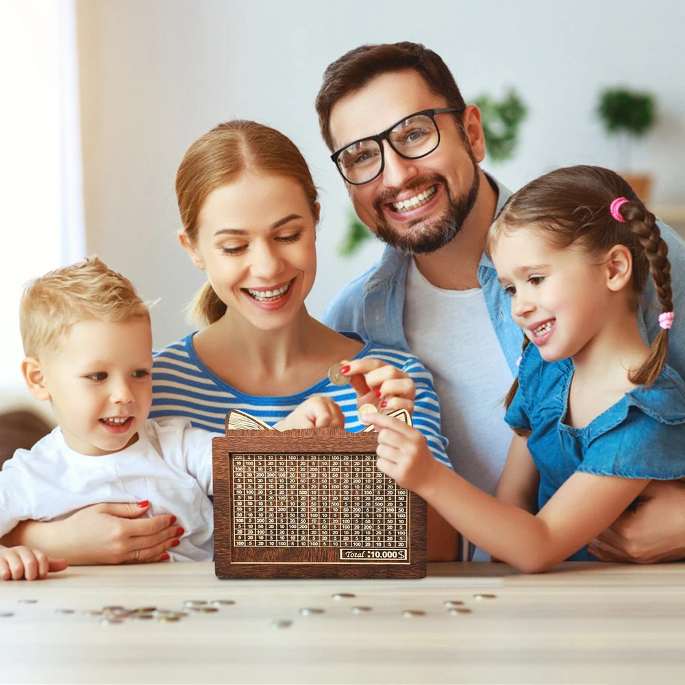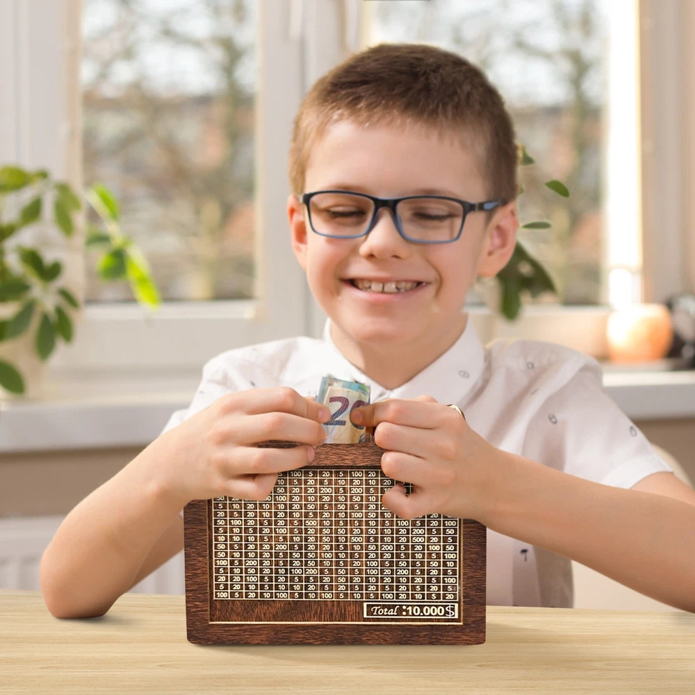 Savings Jar, Children's Wooden Savings Jar, Coin Savings Jar, Gift Toys For 8 To 13 Years Old, Reusable Savings Jar With A Storage Capacity Of 10000 About this product 10000 Challenge Savings Box: This wooden savings box features an integrated counting tool to track deposits, making it easy for children to learn how to money. It is an ideal gift for children and friends, like a Wealth management jar . Very suitable for saving money together for family, children, and then realizing these wishes. Easy to reuse storage box: The storage box can be assembled in minutes with just a few steps. It doesn't require tools. Full and easy to disassemble. Can be marked and reused. The slots on the box are an ideal choice for storing banknotes, allowing you to store more . By recording the amount you each time, make saving more interesting. It comes with an erasable marker pen, allowing you to cross out the corresponding number after each deposit, and a clear goal will you more than ever to achieve it. When all the numbers of the savings bank are crossed out, it achieves its goal. A way to encourage children to savings habits. This improved cat shaped Wealth management jar can be used as an important educational tool, but also add artistic and decorative colors to your home. With its beautiful appearance, this new cash box is perfect as a birthday gift for children. Whether it's a birthday, holiday, anniversary, or celebration, this Wealth management jar can be a special and meaningful gift. Our Wealth management jar is made of safe wood. The edges of the wood are smooth and the craftsmanship is exquisite. It can be kept at home or hung at home, make saving money easy. Can hold banknotes worth $10000. Size : 20 * 14.5 * 7.5cm/7.87 * 5.71 * 2.95in Includes : 1 * Wealth management jar