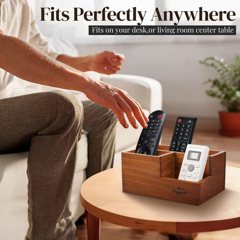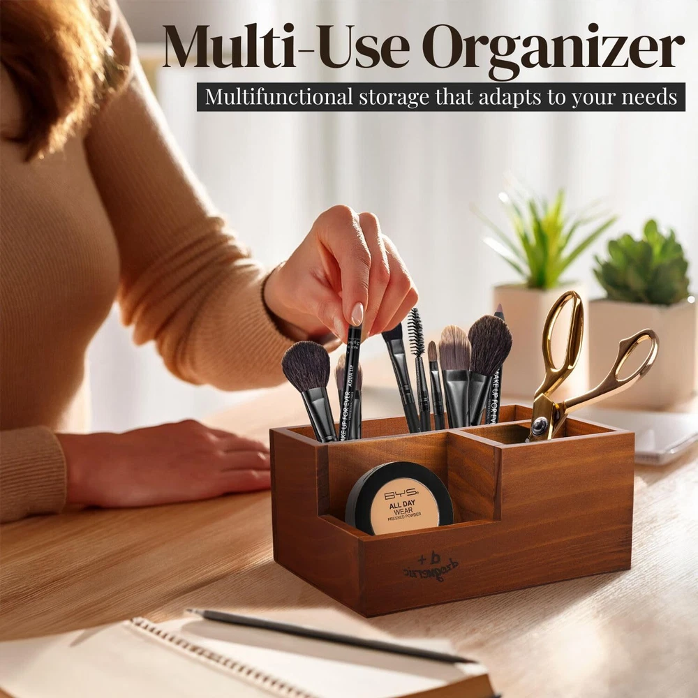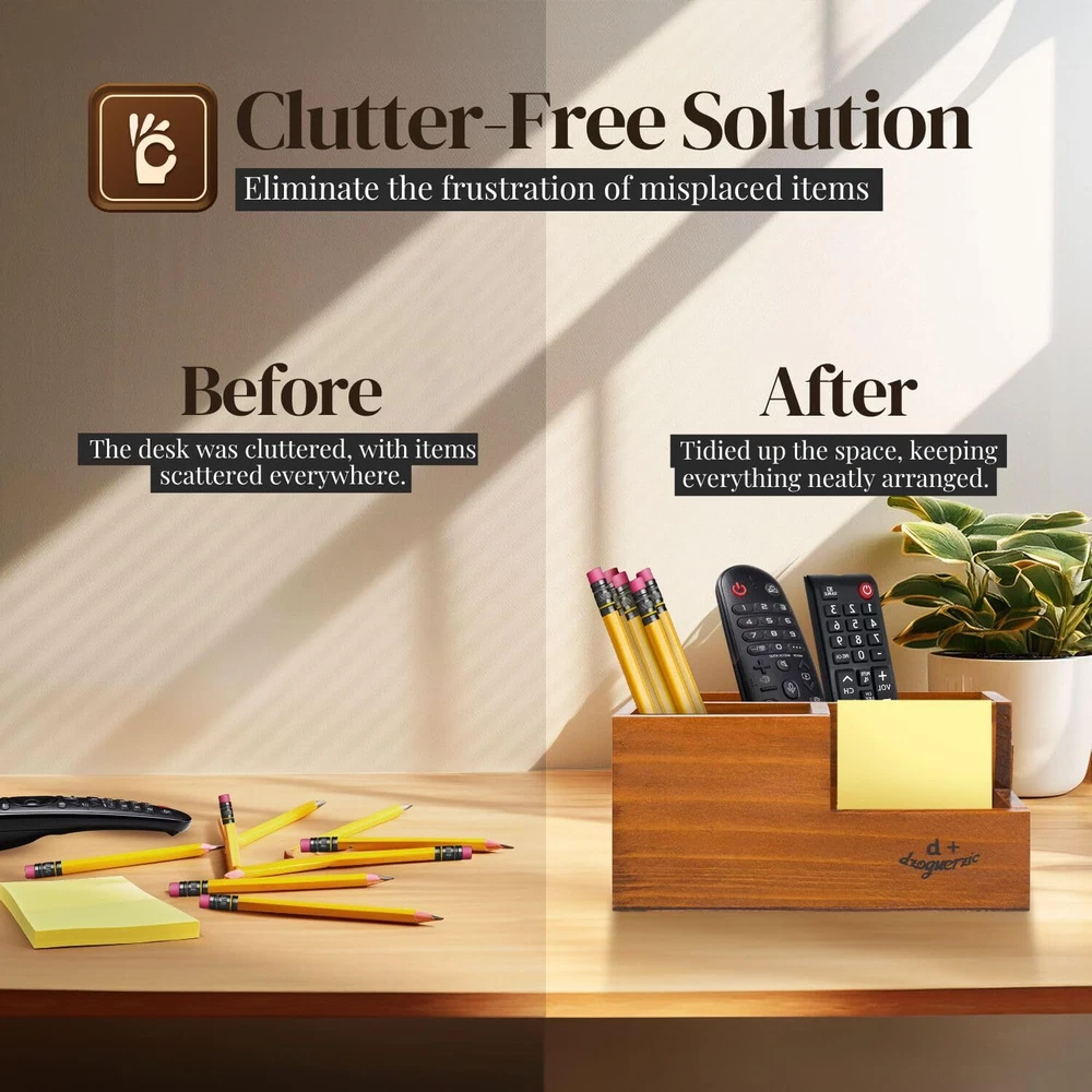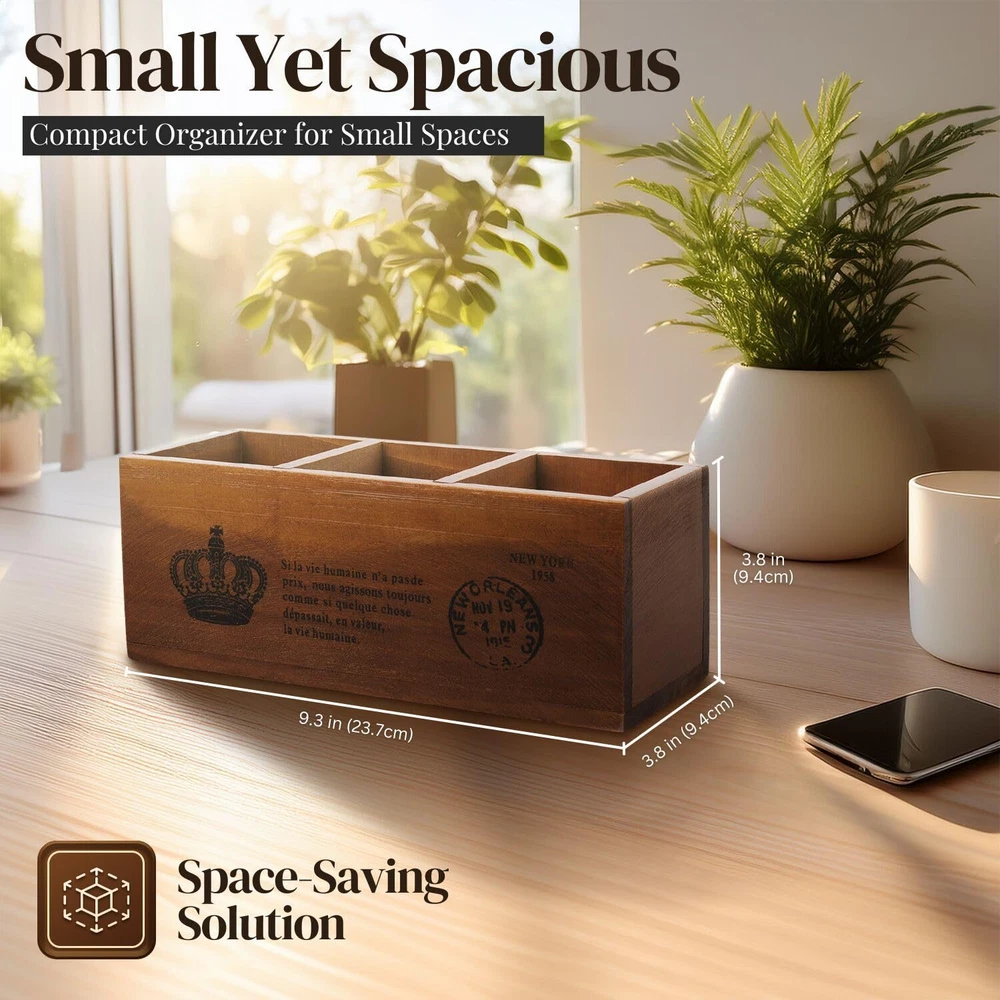 Say goodbye to the frustration of misplaced items with our multi-functional 3 compartment wooden storage organizer, designed to keep your workspace or living room tidy and clutter free. This versatile organizer has three spacious compartments and is perfect for storing pens, pencils, remotes and other essentials. Its luxurious rustic finish adds a touch of natural elegance, combining functionality and vintage aesthetics to create a soothing atmosphere in any room. Compact and easy to move, it fits perfectly on any desk, bedside table or center table, saving space while keeping your essentials close at hand. This organizer is stylish and practical, measuring 20 x 14 x 9.6 cm, making it the perfect addition to your home or office. Features: Dimensions: 20 x 14 x 9.7 cm. Package includes: 1 x Rustic Wooden Pencil Holder for Office - 3 Slots - Desk and Table Storage Organizer - Multifunctional Remote Control Holder for Home, School and Office Organize Your Space Efficiently - Say goodbye to the frustration of misplaced items. This multifunctional wooden pencil holder is perfect for organizing your pens, pencils, remotes and other accessories, keeping your workspace or living room tidy and clutter free VERSATILE 3 COMPARTMENT DESIGN - Our wooden pen holder for desk has three spacious compartments perfect for sorting your desk essentials and remote controls. It is not just a wooden pencil holder, it is a multifunctional basket that fits your needs RUSTIC VINTAGE APPEARANCE This rustic pen holder is made with a luxurious rustic finish. This wooden pen holder for desk adds a touch of natural elegance to any room. It combines functionality with classic design, creating a soothing and vintage atmosphere Space-saving solution: this wooden pen holder for desk is compact and easy to move; this organizer fits perfectly on your desk, bedside table or living room center table. Save space while making sure your essentials are always within reach PERFECT SIZE FOR ANY SPACE - Measuring 20 x 14 x 9.6 cm, this pencil organizer is compact but roomy enough to hold all the necessary items. Its natural wood design makes it a stylish addition to any decor.