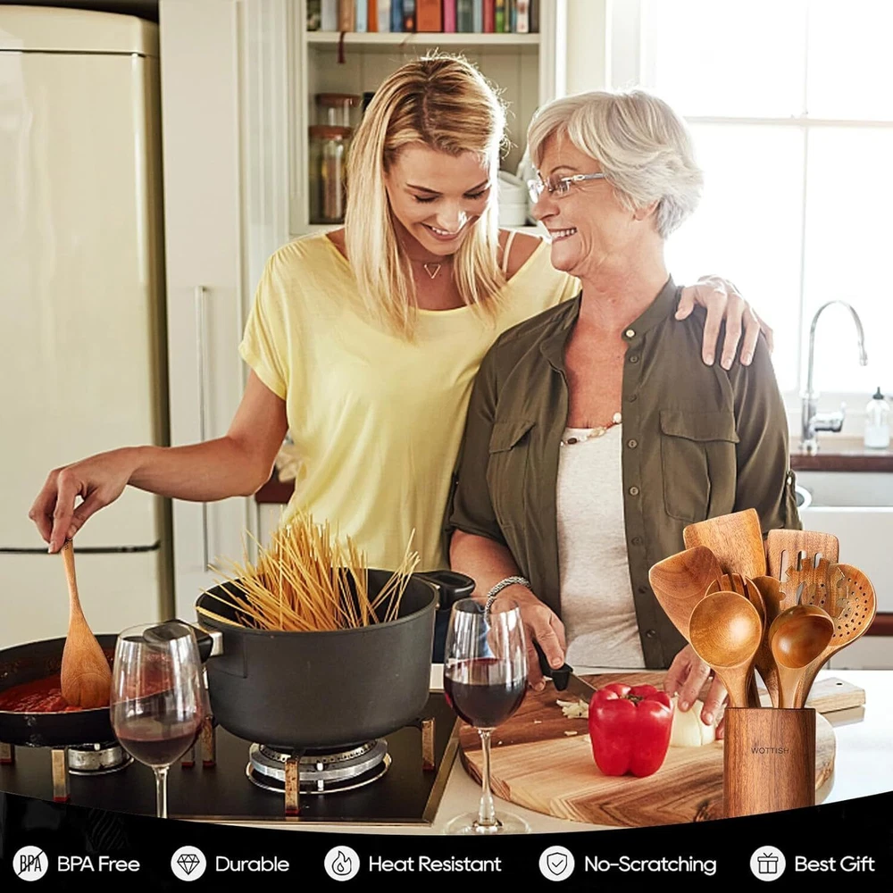 Color Acacia Wooden Material Acacia Wood Style 10Pcs Wooden Utensil Set Product Dimensions 13.78"L x 0.78"W About this item Wooden Utensil Holder: Our wooden spoon comes with a Wooden Utensil Holder, a unique feature that sets it apart from other products on the market. The holder even has a leak hole at the bottom to prevent water accumulation 10-Piece Kitchen Utensils Set: Our complete wood kitchen utensil set includes all the essential cooking tools, such as a flat spatula, fried spatula, slotted spatula, kitchen utensil holder, strainer spoon, Soup Ladle,spaghetti spoon,salad fork, salad spoon, and mixing spoon. This comprehensive set covers all your kitchen needs from stirring to cooking Cooking Essentials: This 100% natural wooden utensil set is a must-have for any home chef. It includes multiple commonly-used kitchen tools and a kitchen utensil holder. Crafted by hand from high-quality, hard wood, these kitchen utensils are denser than any other materials available making them more robust and durable Easy to Clean and Store: The surfaces of all our utensils are smooth without burrs so they won’t damage your cookware. Cleaning is easy with warm water or soapy water. Each tool has holes in the handle allowing it to be hung up on any standard-sized cutlery rack when not being used - providing convenient storage options for busy kitchens that are also stylish! Number of Pieces 10 Is Dishwasher Safe No Material Type Free PVC Free, Cadmium Free, BPA Free, Plastic Free, Lead Free Handle Width 0.78 Inches Product Dimensions 13.78 x 0.78 x 0.1 inches Item Weight 1.72 pounds