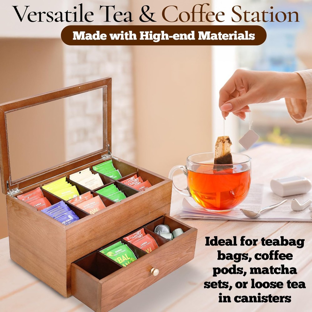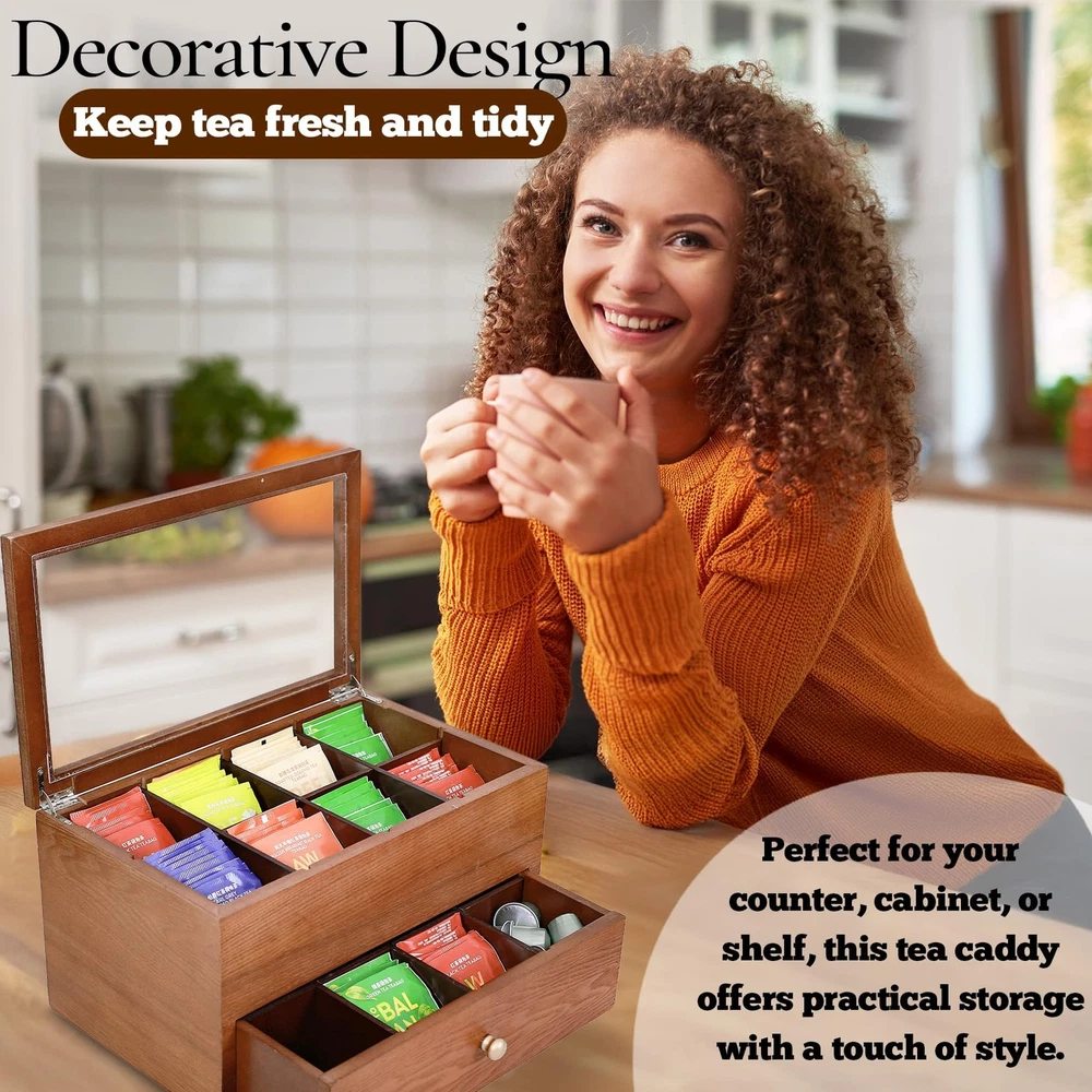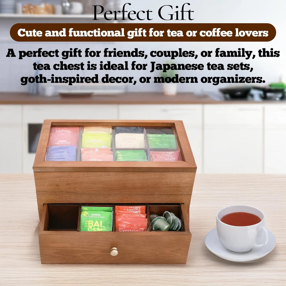 Keep your tea collection beautifully organized with this Wooden Tea Organizer Box with Drawer. Designed with multiple compartments and a pull-out drawer, this versatile tea storage chest is perfect for teabags, loose tea leaves, coffee, matcha, and small accessories. Whether displayed on your kitchen counter, tucked inside a cabinet, or placed on a shelf, this tea caddy doubles as both a practical storage solution and a stylish piece of decor. Made from durable wood with a clear top lid, this tea box allows you to easily view your selection while keeping your teabags fresh and tidy. The pull-out drawer provides extra space for spoons, matcha whisks, accessories, or even small jars, tins, and canisters. Its large yet compact design makes it ideal for small kitchens, tea stations, or office counters. Perfect as a tea organizer for daily use or as a thoughtful gift, this tea chest combines functionality with aesthetic charm. Whether you enjoy Japanese tea ceremonies, a cozy coffee station, or gothic-inspired kitchen decor, this wooden organizer brings order and elegance to your home. Elegant Wooden Tea Organizer Box – Crafted from rustic wood with a clear lid, this tea bag organizer adds a warm, decorative touch to your kitchen, countertop or cabinet. Perfect for storing tea bags, loose leaf tea, coffee or matcha in one stylish box. Large Storage with Drawer & Compartments – Featuring 16 divided sections on top and an extra pull-out drawer, this tea chest provides plenty of room for teabags, sugar packets, honey sticks, stirrers or small jars and tins, keeping your tea station neat and easy to browse. Versatile Tea & Coffee Station – Use this wooden tea box on the countertop, coffee bar, office break room or pantry shelf. Ideal as a tea bag holder, coffee pod organizer or matcha storage caddy, suitable for both tea and coffee lovers. Durable & Decorative Design – Made from strong wood with smooth finishes and a transparent lid, this tea storage box is built to last. The classic, rustic look blends easily with farmhouse, modern or traditional kitchen decor. Perfect Gift for Tea Lovers – A thoughtful gift for friends, couples or family who enjoy tea time. This tea chest organizer is a practical and beautiful present for housewarming, Christmas, Mother’s Day or birthdays, and doubles as an elegant Organizador de Té.
